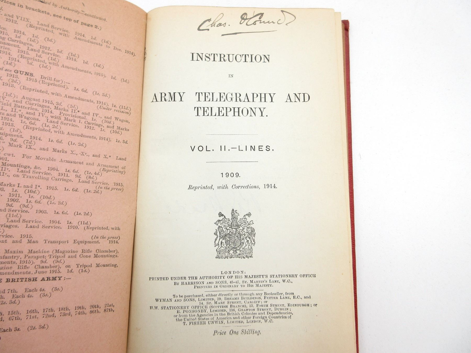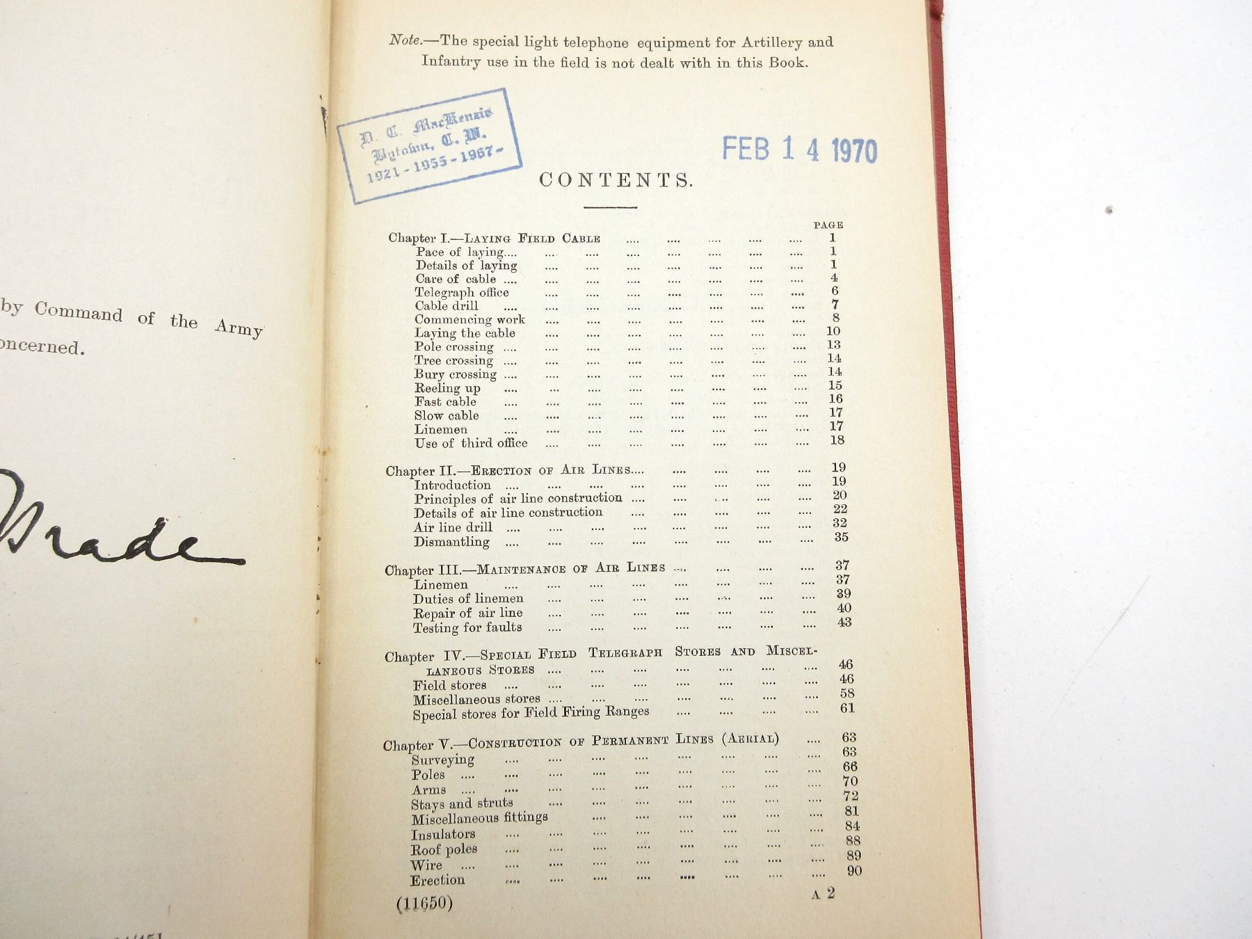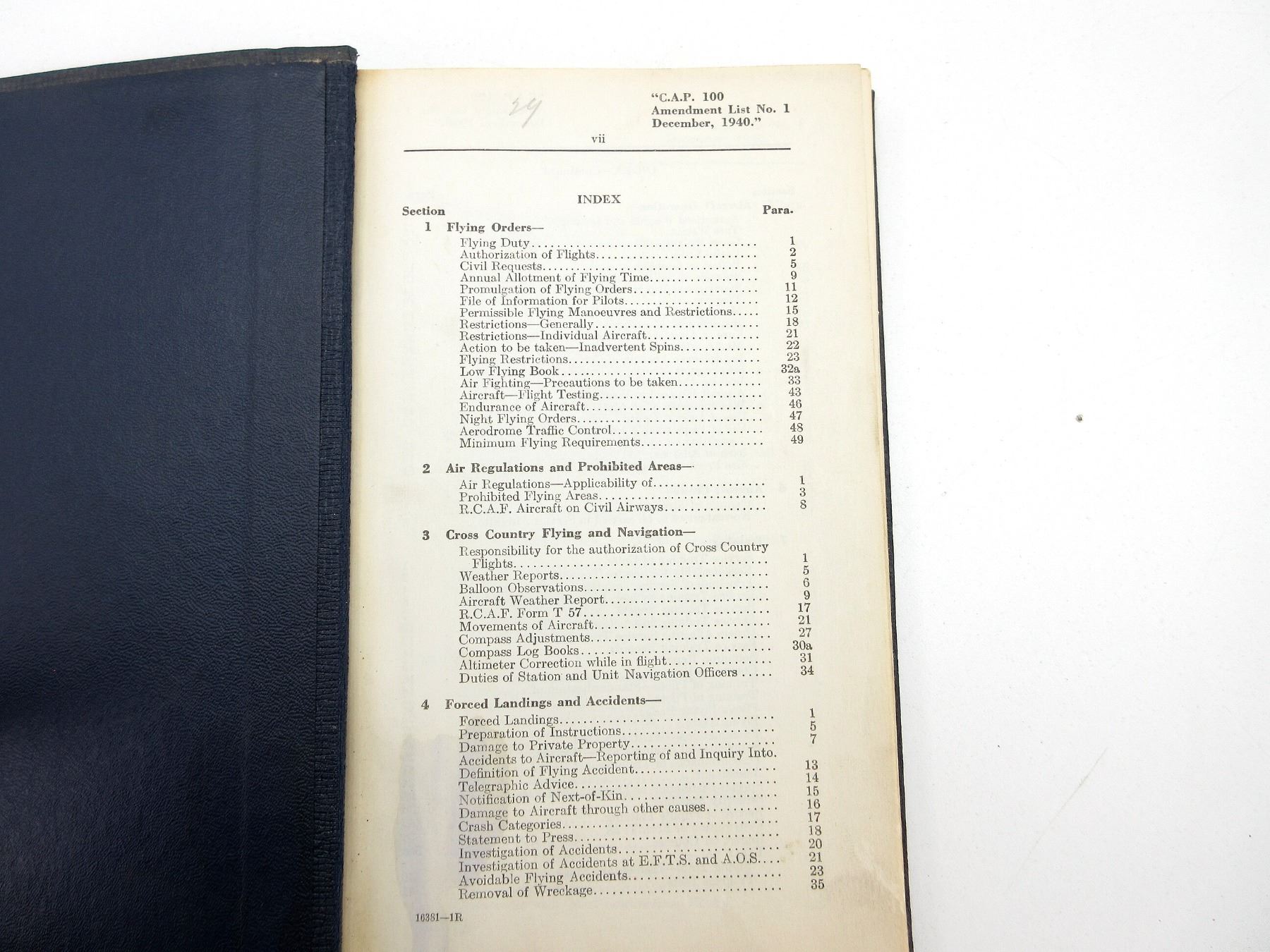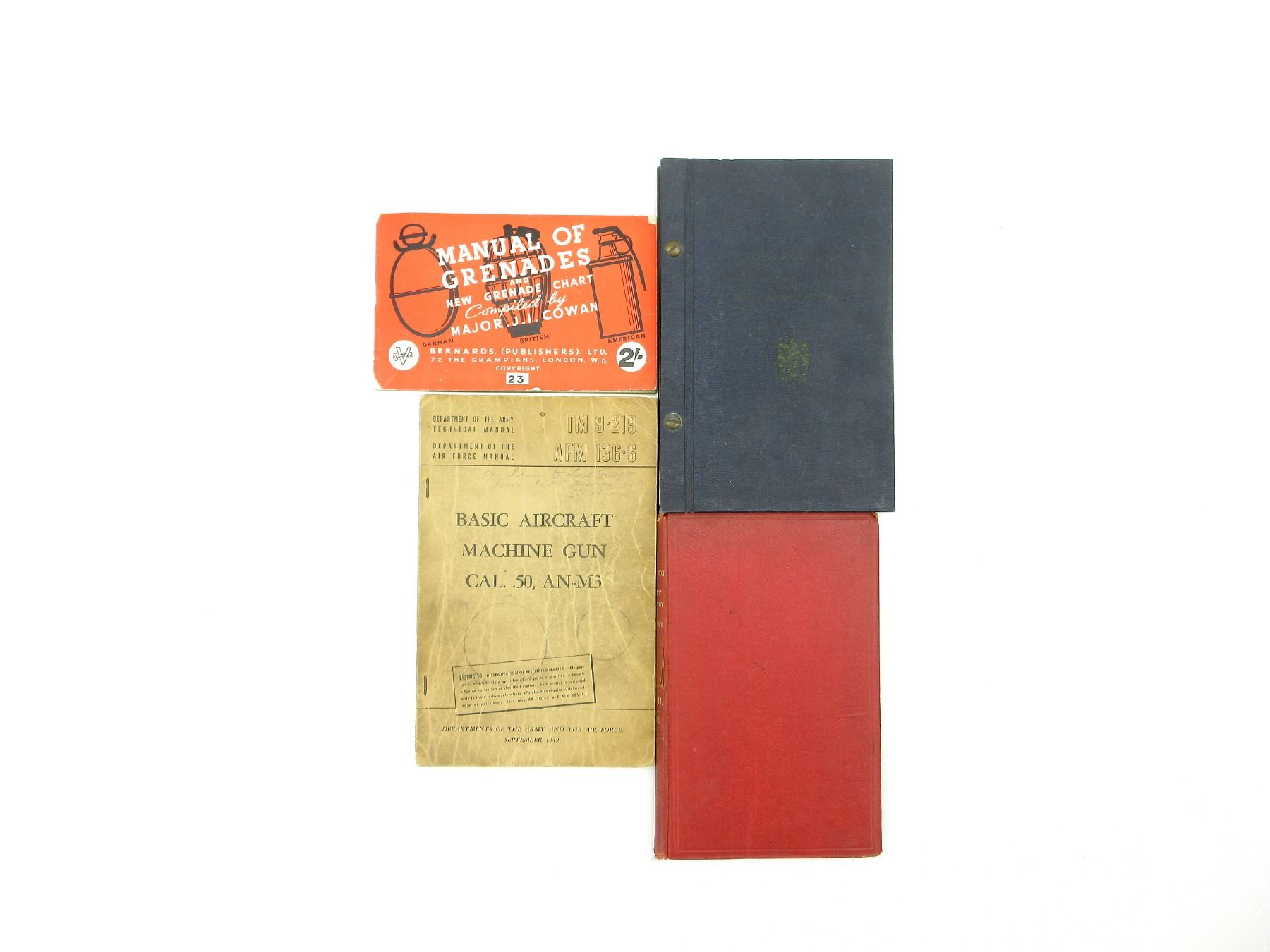 LOT INCLUDES; (1) "FLYING REGULATIONS FOR THE ROYAL CANADIAN AIR FORCE" MANUAL, HARD COVER, 1940, (1) "INSTRUCTION IN ARMY TELEGRAPHY AND TELEPHONY, VOL. II. LINES" MANUAL, HARD COVER, 1914, (1) "BASIC AIRCRAFT MACHINE GUN CAL. .50, AN-M3" MANUAL, SOFT COVER, 1949 & (1) "MANUAL OF GRENADES" MANUAL BY MAJOR J.I. COWAN, SOFT COVER, 1923. SEE PHOTOS.