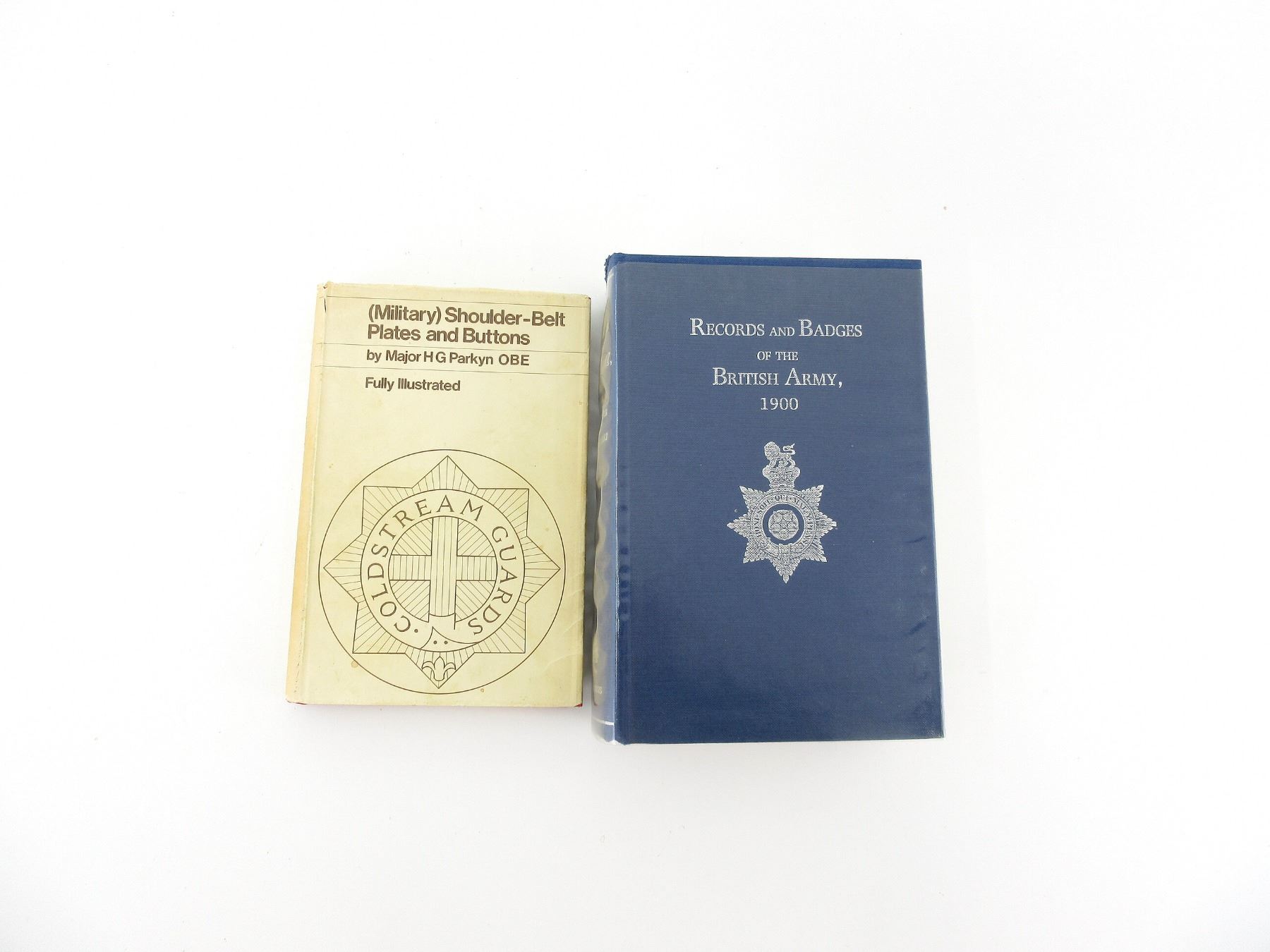 LOT INCLUDES; (1) "(MILITARY) SHOULDER-BELT PLATES AND BUTTONS" BOOK BY HG PARKYN, HARD COVER WITH DUST COVER, SEPTEMBER 1956 & (1) "RECORDS AND BADGES OF THE BRITISH ARMY, 1900" BOOK BY HENRY MANNERS CHICHESTER AND GEORGE BURGES-SHORT, HARD COVER WITH PLASTIC DUST COVER, ISBN: 0-947898-22-0. SEE PHOTOS.