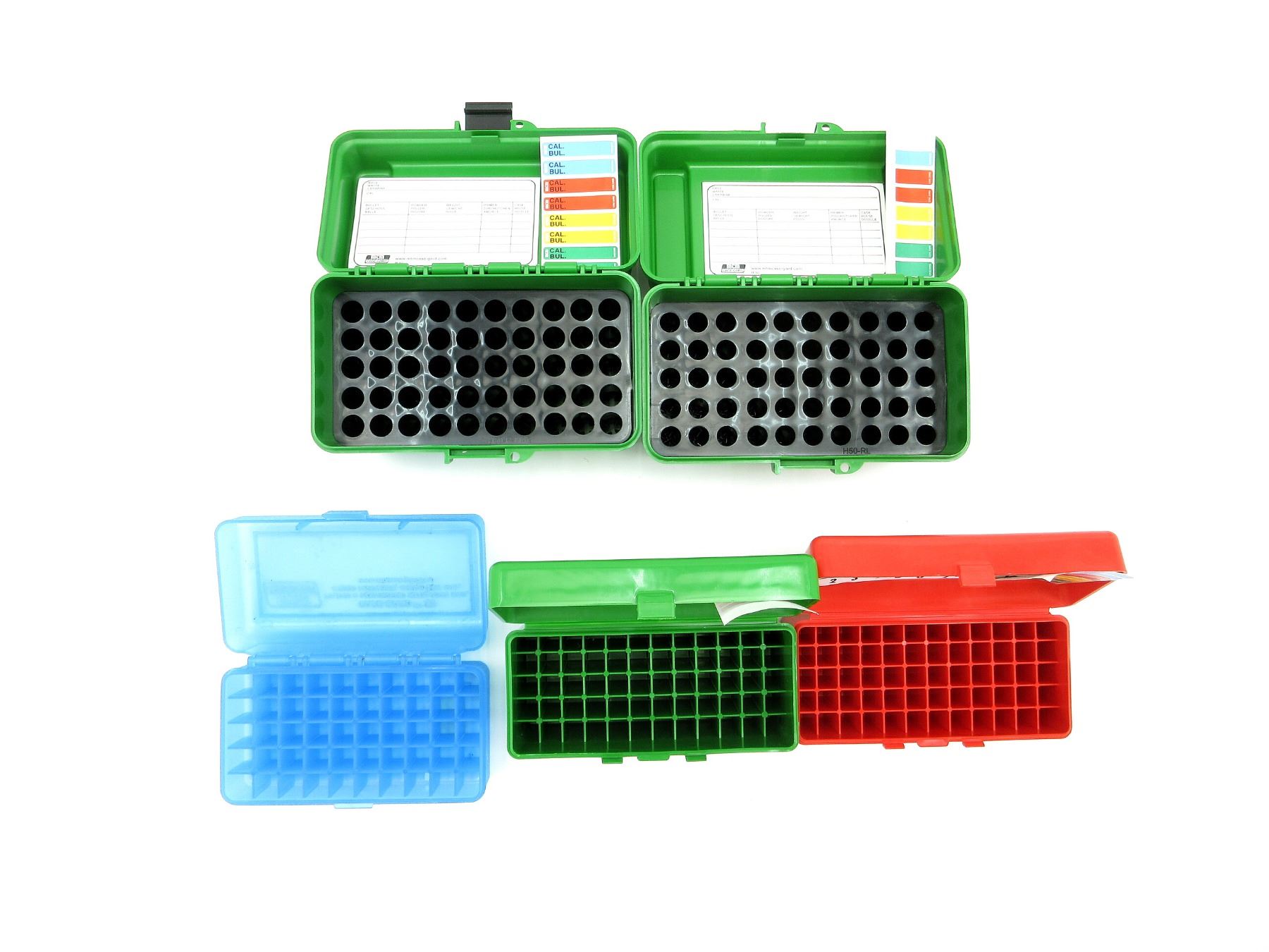 LOT INCLUDES; (5) PLASTIC RIFLE AMMO CONTAINERS, VARIOUS SIZES, CAPACITIES & COLOURS. SEE PHOTOS.