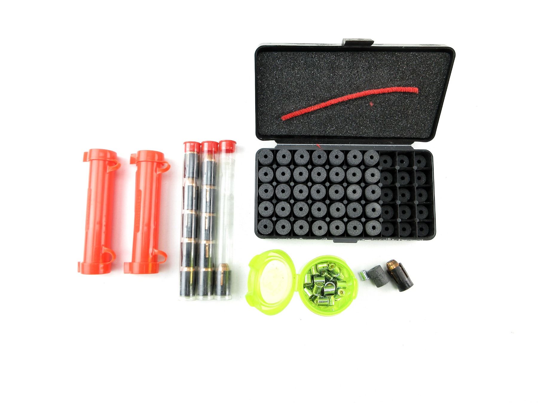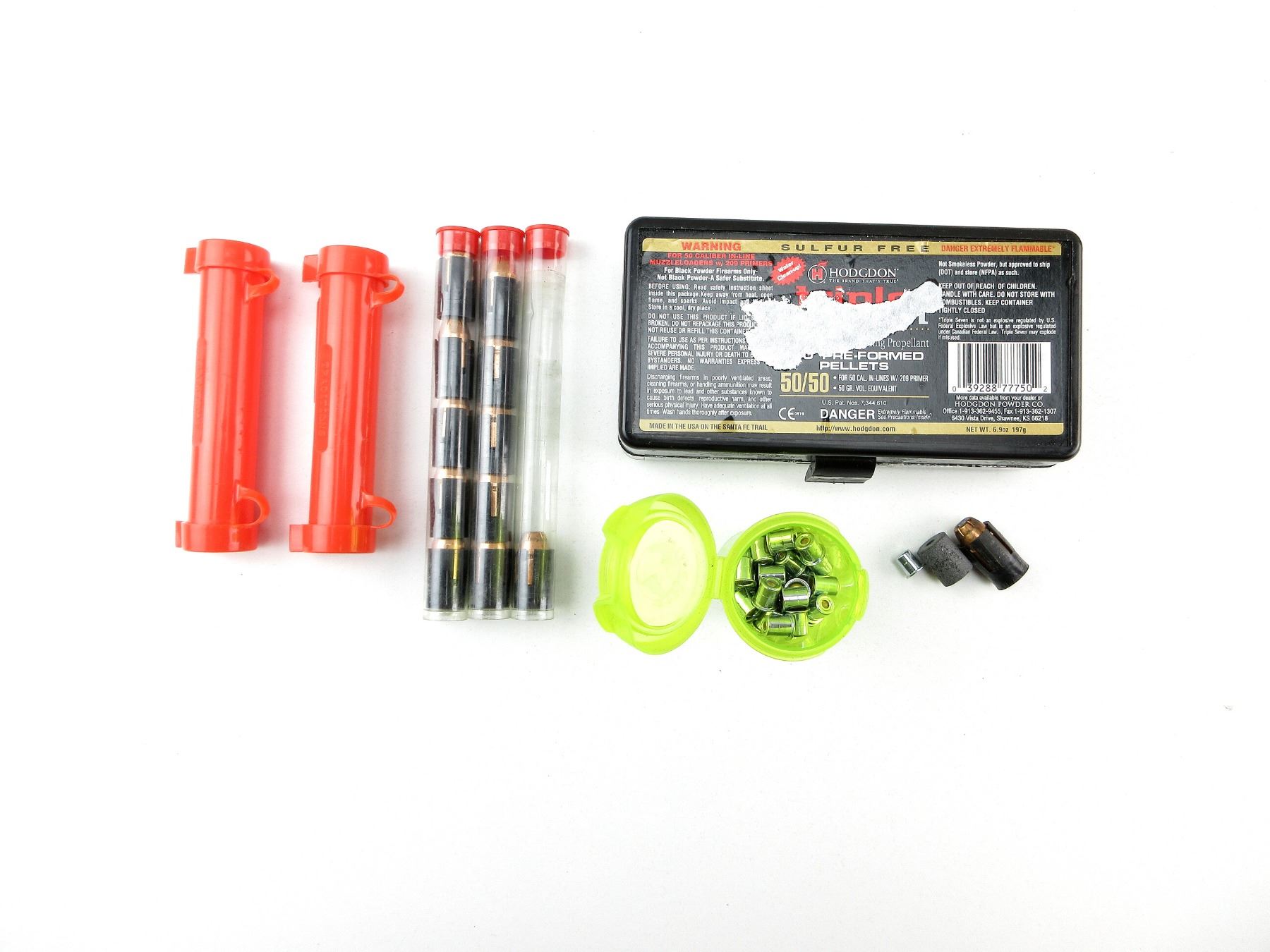 LOT INCLUDES; APPROX. (92) PRIMERS, (86) TRIPLE SEVEN PRE-FORMED PELLETS, (12) .50 CALIBER SABOTS, CONSIGNOR STATES; " 240 GRNS", (2) PLASTIC SABOT / PELLET HOLDERS, THIS LOT WILL ONLY SHIP PUROLATOR.