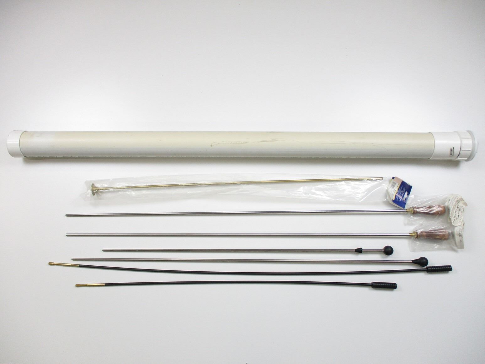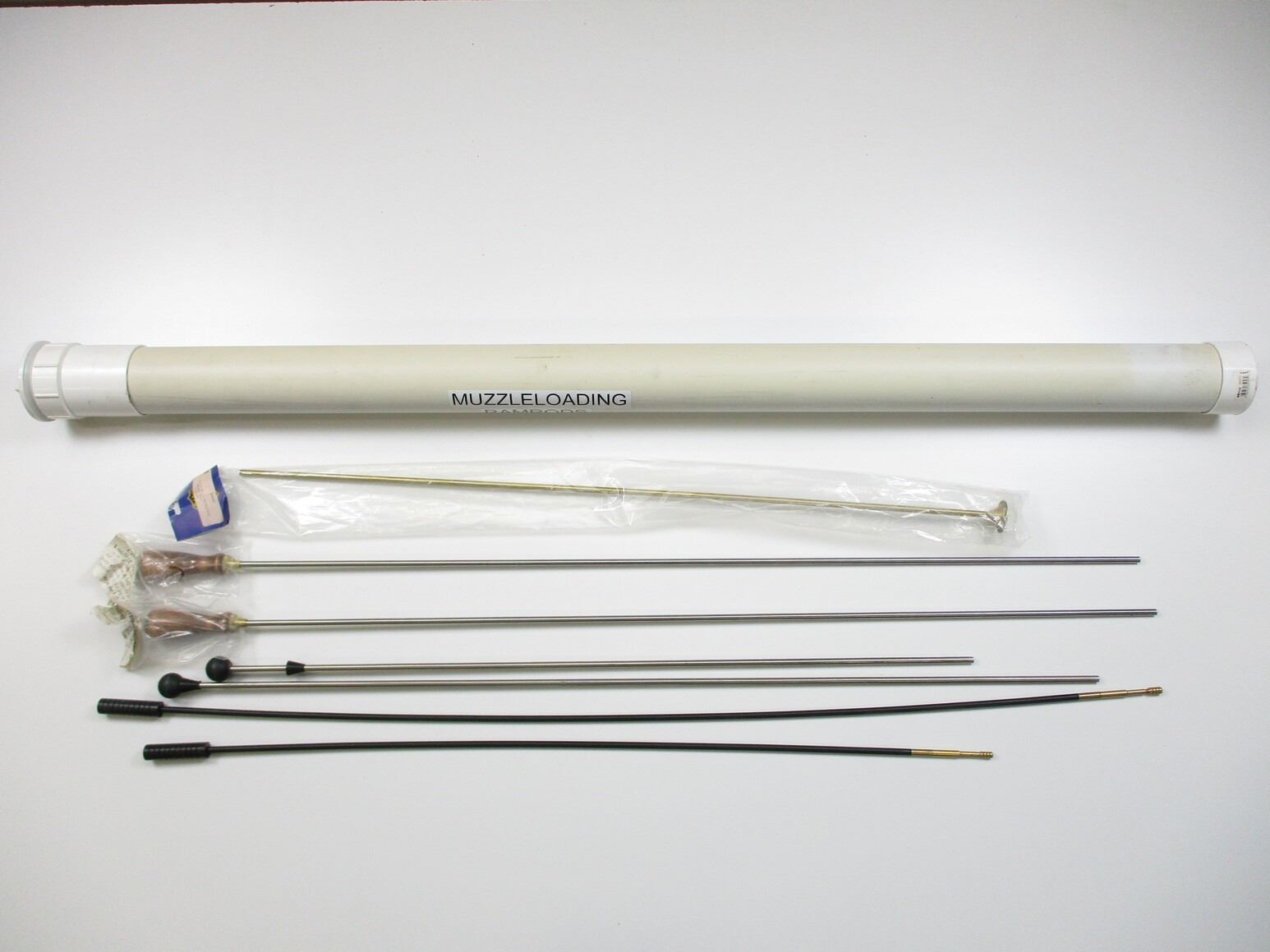 ASSORTED MUZZLE LOADER RAM RODS ETC , INCLUDES MULTIPLE RAM RODS, SOME WITH & WITH OUT JAGS, RODS MARKED, .45, .32, 36, (1) UNMARKED, (2) IN ORIGINAL PACKAGING, 44" IN LENGTH, FIR .32 CAL. BRASS BLACK POWDER DROP TUBES WITH FUNNELS COMES IN PVC STYLE TUBING, WITH THREAD ON LID.