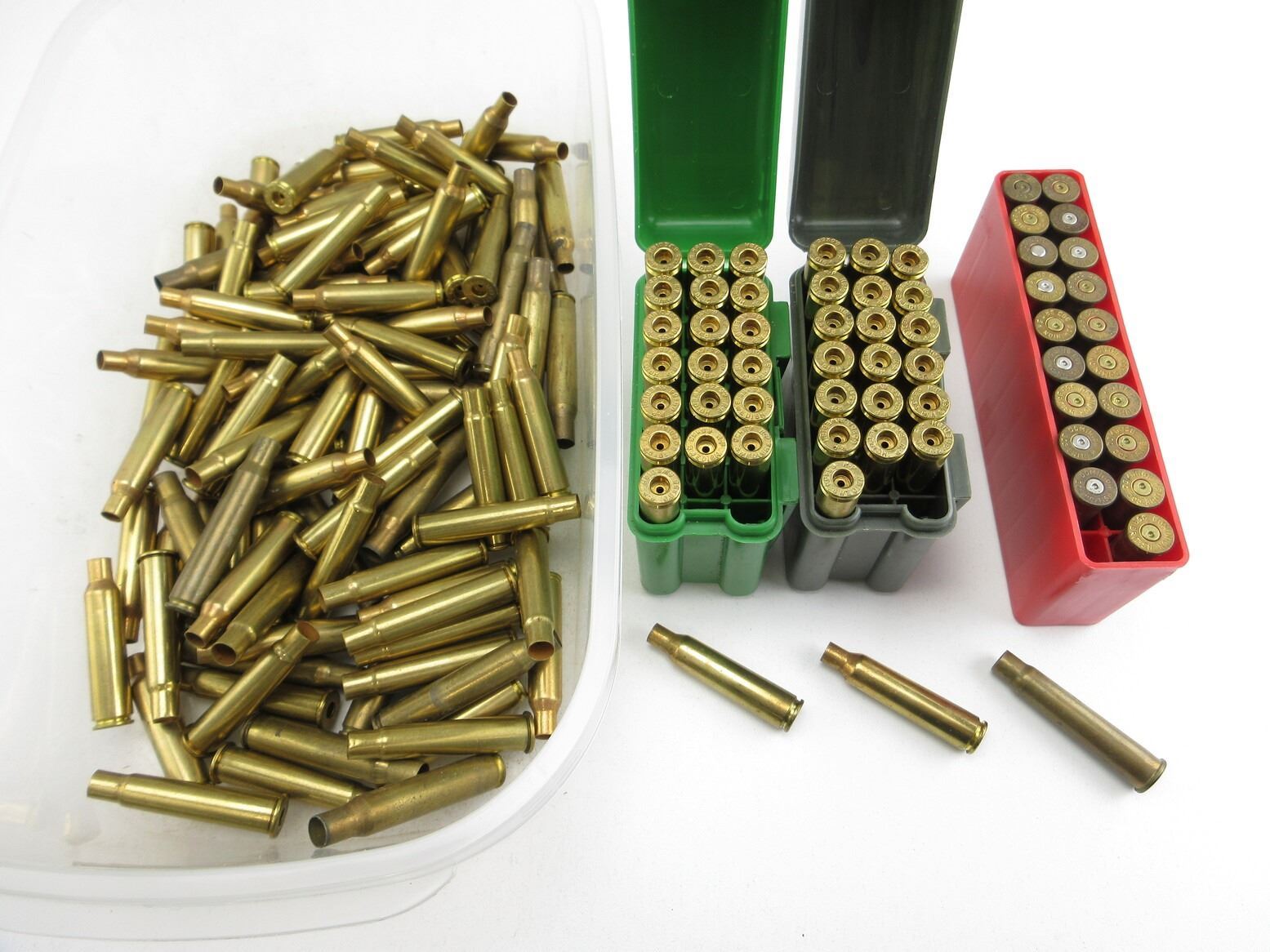 ASSORTED NON-PRIMED BRASS CASES LOT , APPROX. 4 LBS, BRASS CASES INCLUDING; .303 BRIT, .30-06 SPRG, 6.5MM X 55MM SWEDISH, 3 PLASTIC CASES.