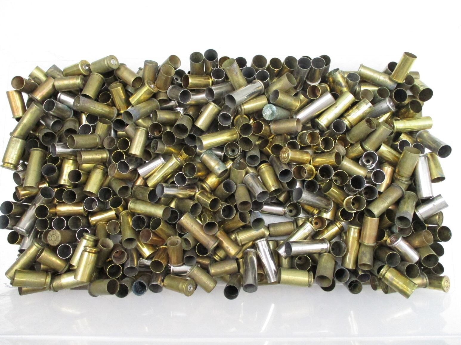 ASSORTED NON PRIMED PISTOL BRASS/NICKEL CASES , INCLUDES 40 S+W, 38 S+W, 9MM LUGER, 38 SPL. APPROXIMATELY 9.53 LBS. MAY CONTAIN OTHER CALIBERS.