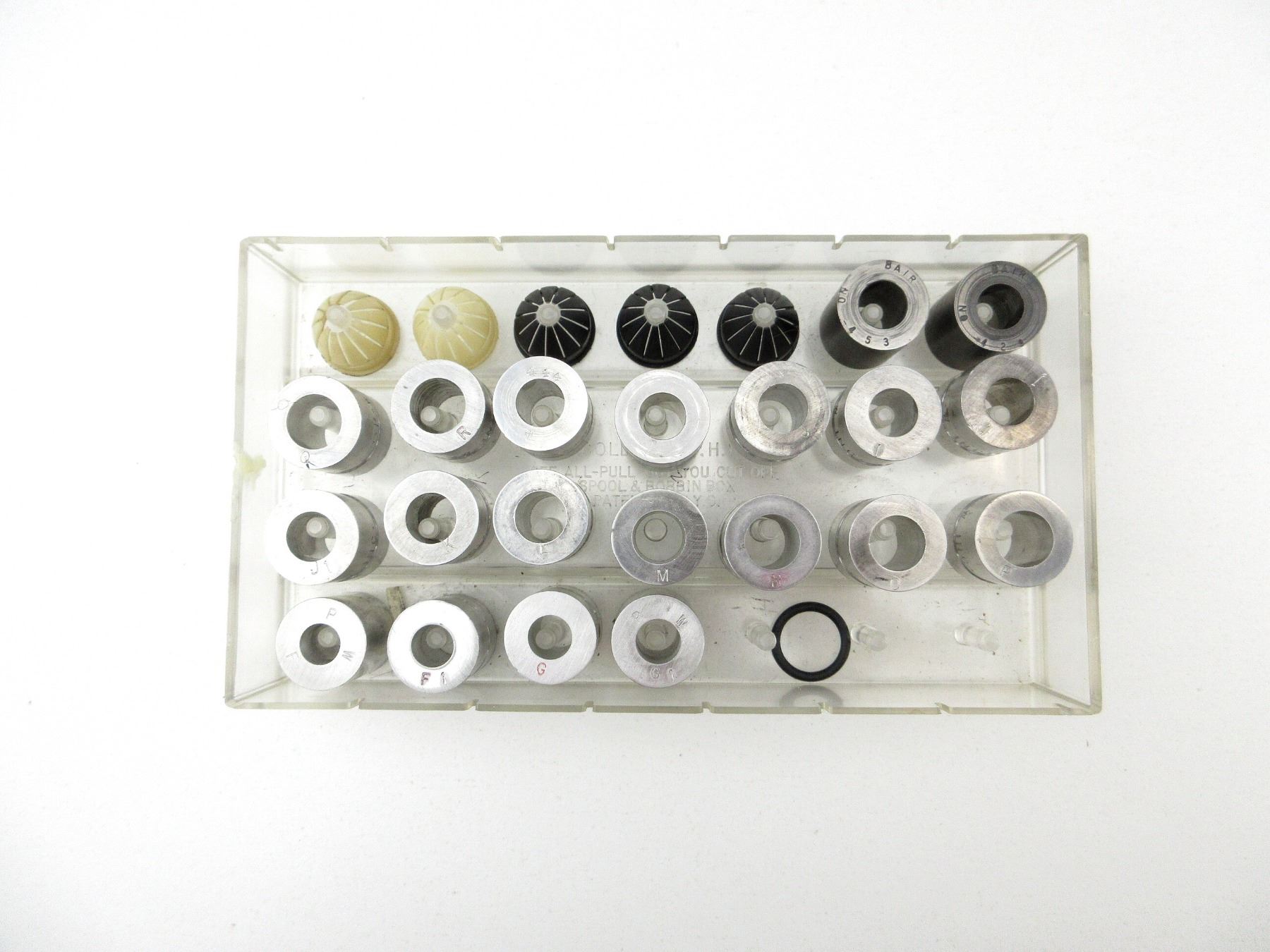 APPROX. (20) ASSORTED POWDER BUSHINGS, INCLUDES; G1, G, F1, F, J1, K, L, M, N, O, P, Q, R, 444, 429, J, I, I, 453, 429, & (5) CRIMPERS. SEE PHOTOS.