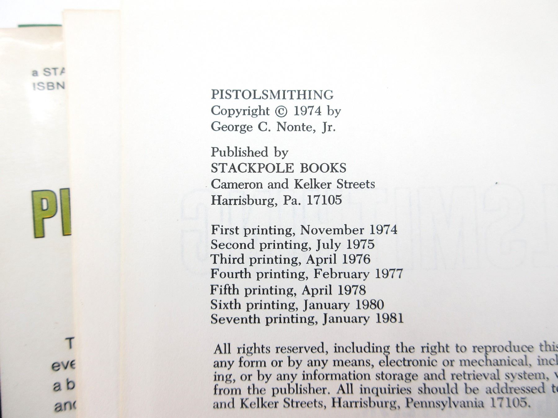 LOT INCLUDES; (1) "PISTOLS OF THE WORLD" BOOK, BY CLAUDE BLAIR, HARD COVER WITH DUST COVER, COPYRIGHT 1968, (1) "ENGLISH PISTOLS & REVOLVERS" BOOK, BY JOHN NIGEL GEORGE, HARD COVER WITH DUST COVER, COPYRIGHT 1962, (1) "PISTOLSMITHING" BOOK, BY GEORGE C. NONTE JR., HARD COVER WITH DUST COVER, ISBN 0-8117-1133-1, (1) "BOOK OF PISTOLS & REVOLVERS" BOOK, BY W.H.B. SMITH, UPDATED BY JOSEPH E. SMITH, HARD COVER, COPYRIGHT 1968. SEE PHOTOS.