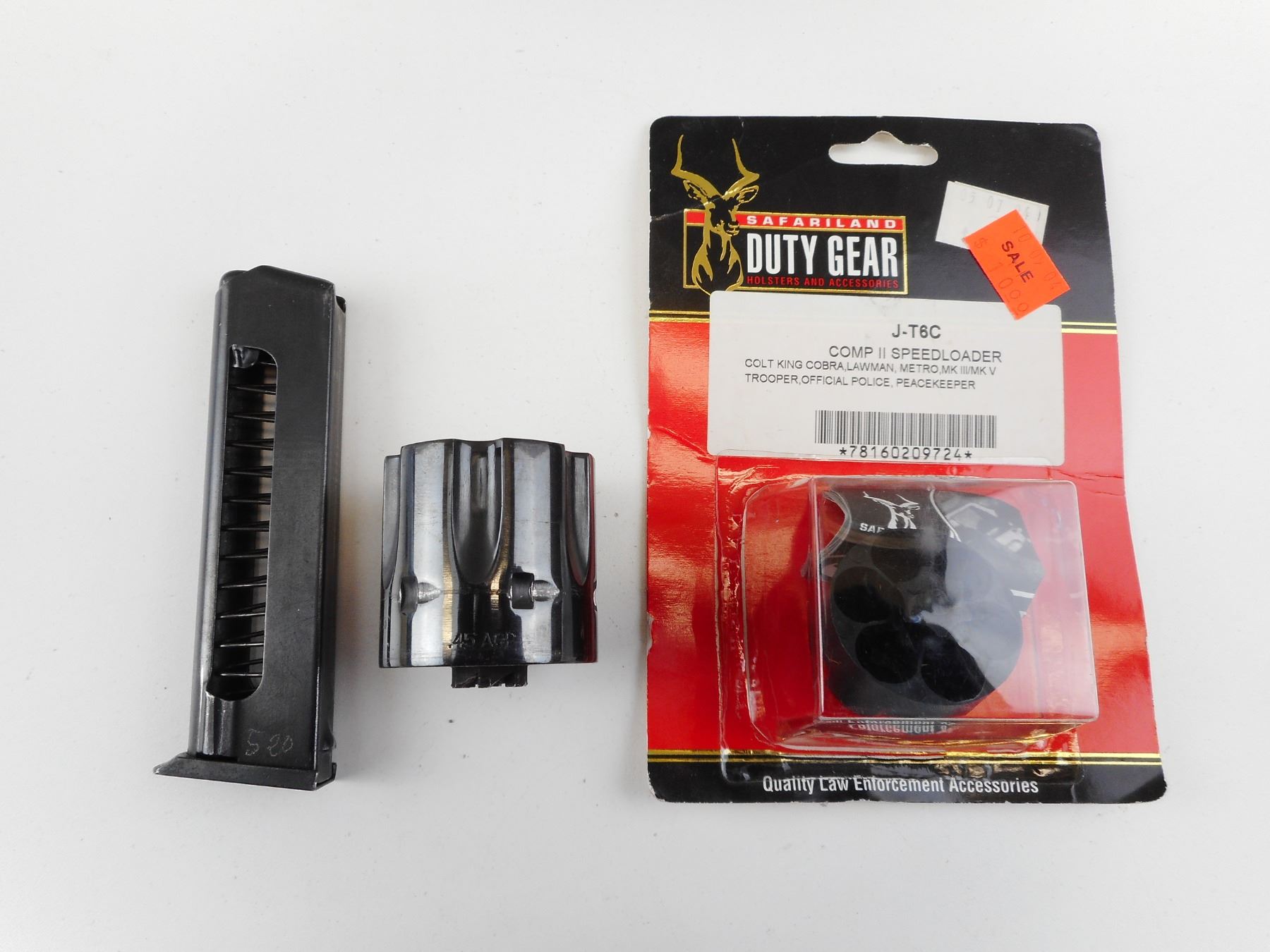 ASSORTED PISTOL MAGAZINES , (1) MAKAROV 9X18 MAGAZINE (1) .45ACP CYLINDER, UNKNOWN MODEL. (1) COMPII COLT SPEED LOADER. LOT OF 3