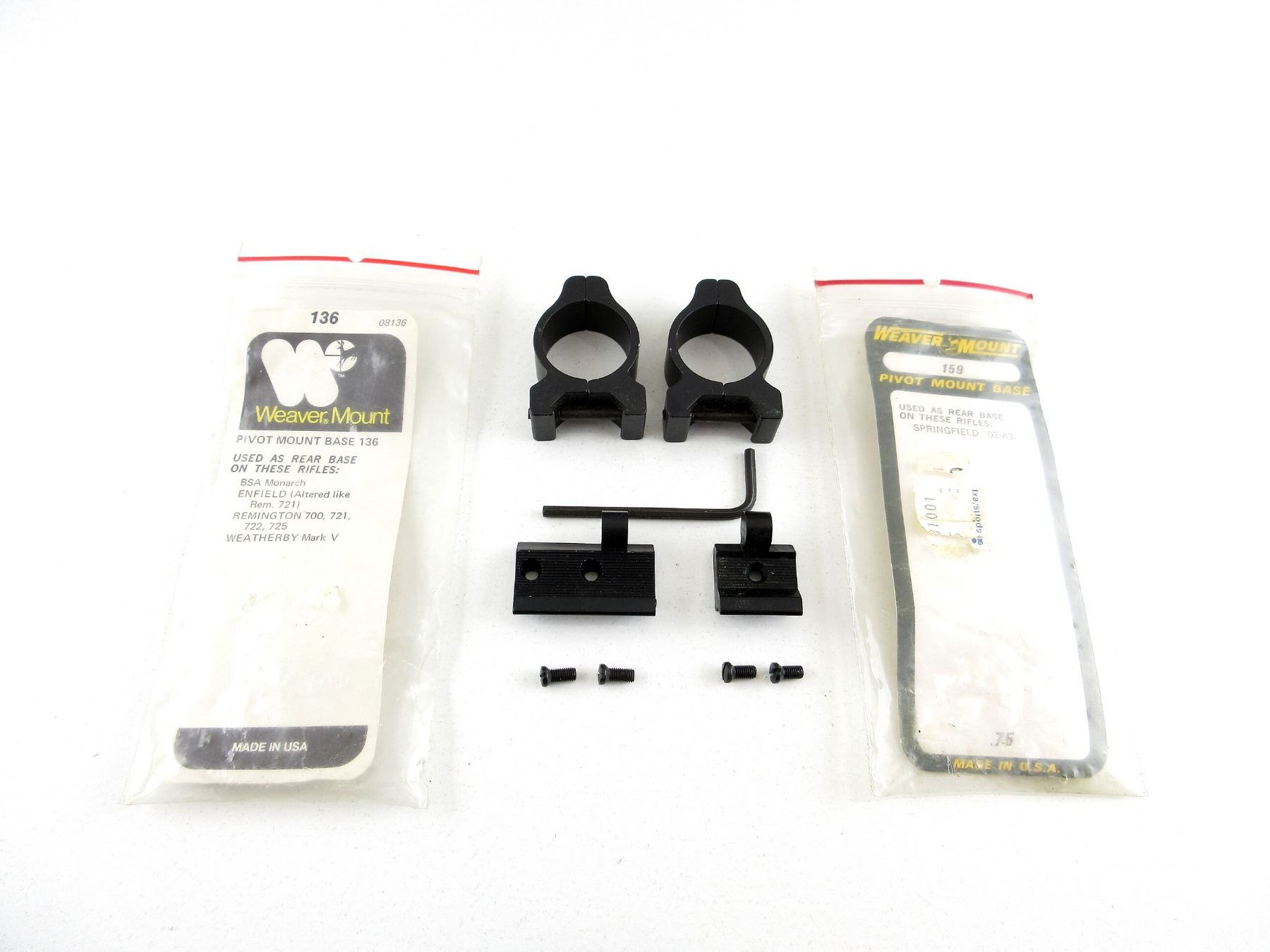 LOT INCLUDES; (1) WEAVER PIVOT MOUNT BASE 136, FITS BSA MONARCH / ENFIELD ALTERED REM 721 / REMINGTON 700 / 721 / 722 / 725 / WEATHERBY MARK V RIFLES, BLACK, IN ORIGINAL PACKAGING, (1) WEAVER PIVOT MOUNT CASE 159, FITS SPRINGFIELD '03-A3 RIFLES, BLACK, IN ORIGINAL PACKAGING & (1) PAIR OF 1" SCOPE RINGS, BLUED STEEL, INCLUDES SCREWS, UNMARKED, CONSIGNOR STATES: "VNK". MAY REQUIRE FITTING. SEE PHOTOS.
