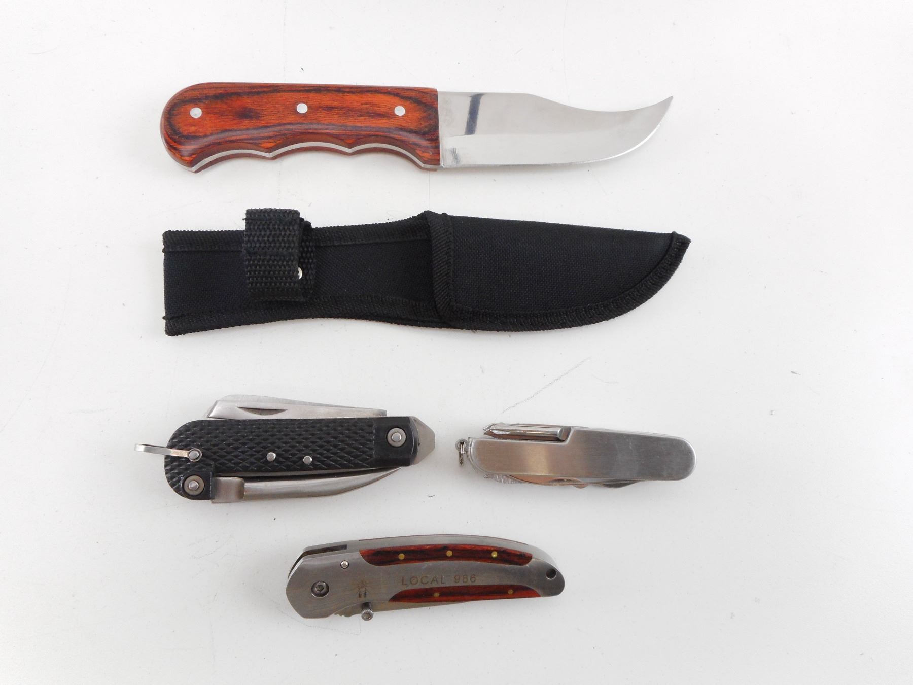 ASSORTED POCKET KNIVES + HUNTING STYLE KNIFE , (1) VALOR 440 KNIFE, APPROX. BLADE LENGTH 4.25", APPROX. FULL LENGTH 8.75", WITH NYLON SHEATH, (1) LOCAL 986 POCKET KNIFE, (1) MARLIN SPIKE TYPE POCKET KNIFE, BLADES MARKED STAINLESS. (1) UNMARKED UITILITY KNIFE, WITH MULTIPLE BLADES & TOOLS. SEE PHOTO.