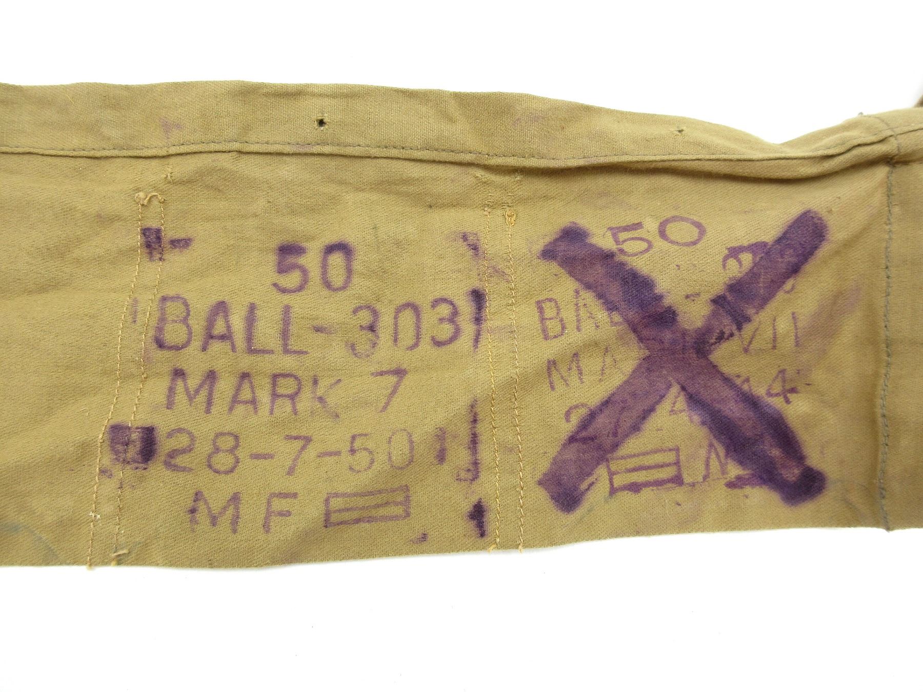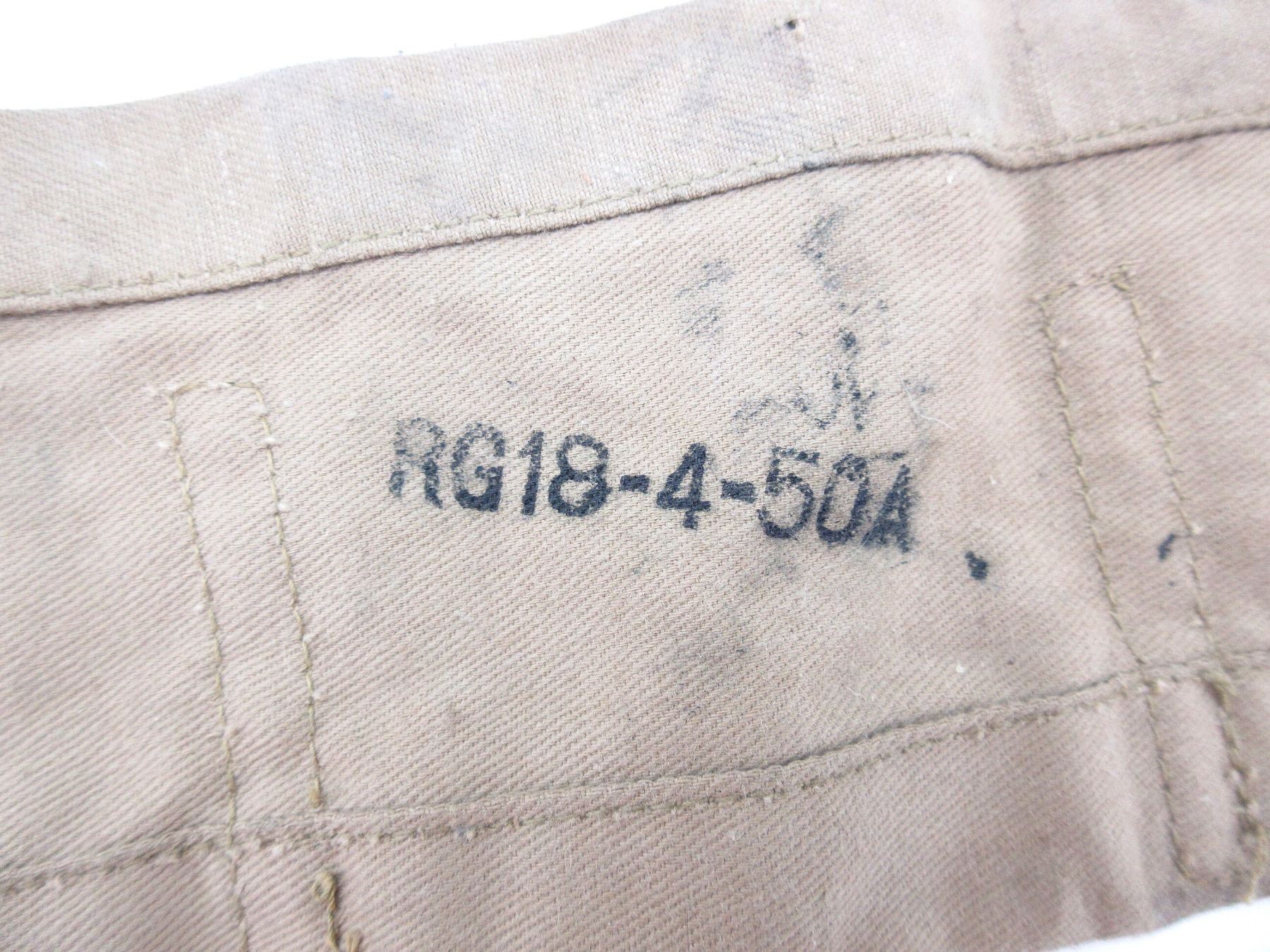 LOT INCLUDES; (2) TAN COTTON, 5 POCKETS, ONE MARKED: BROAD ARROW, "A 8/49 MK3?" & VARIOUS OTHER MARKINGS, OTHER-MARKED: "50, BALL-303, MARK 7, 28-7-50, MF", "GRACE-FO?M KTG. MILLS." & VARIOUS OTHER MARKINGS. SEE PHOTOS.