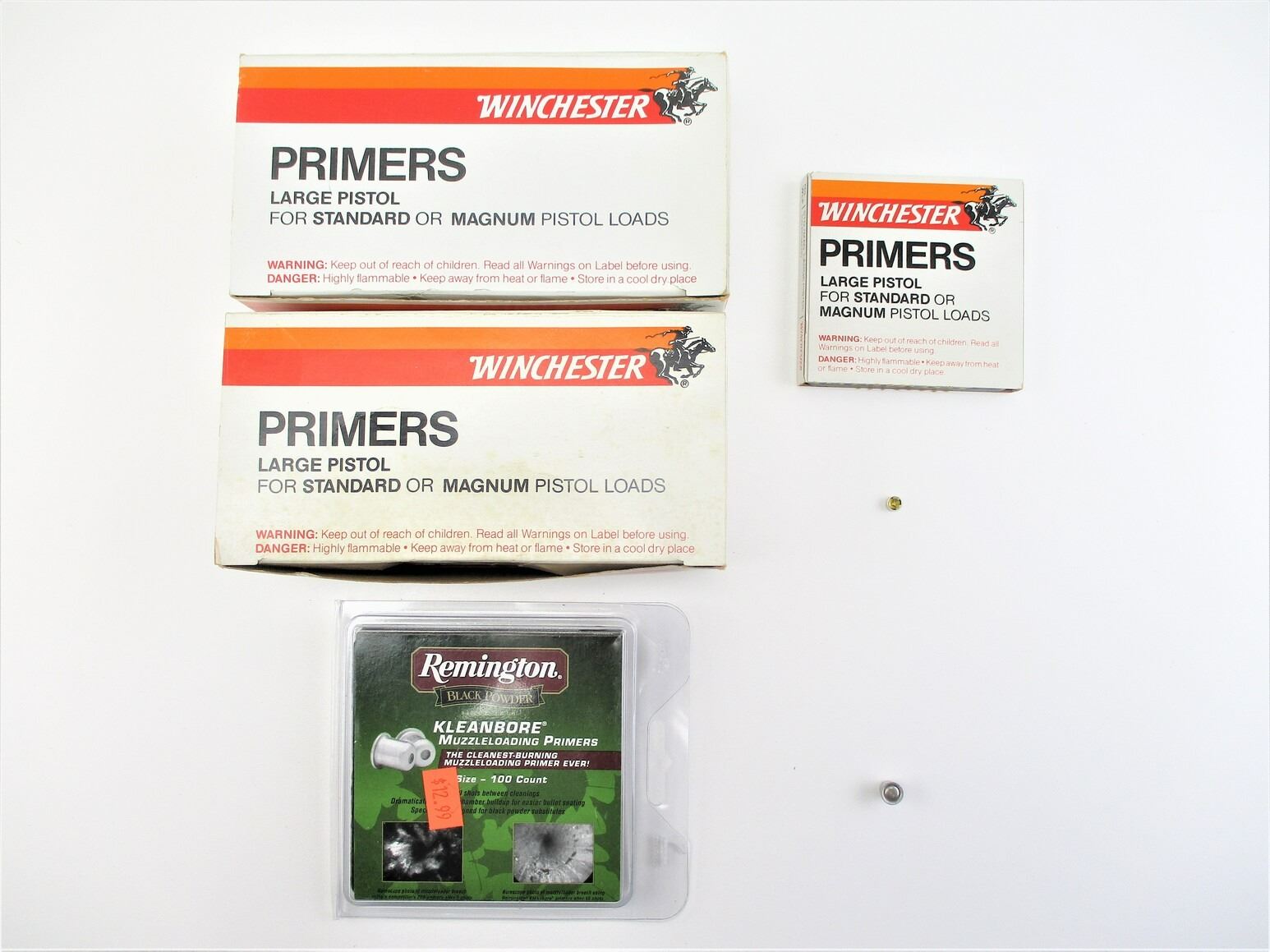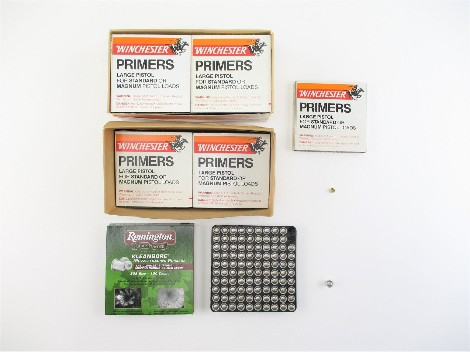 ASSORTED PRIMERS LOT, 1454 RNDS. INCLUDES: (1355) WINCHESTER LARGE PISTOL PRIMERS, & (99) REMINGTON BLACK POWDER KLEANBORE MUZZLELOADING PRIMERS, THERE ARE NEW SHIPPING RESTRICTIONS, PLEASE MAKE SURE YOU HAVE READ AND CONFIRMED WE CAN SHIP TO YOU BEFORE BIDDING ON THIS LOT. PLEASE SEE LOT 0 IN THIS SESSION. NO REFUNDS WILL BE ISSUED, OR BIDS RETRACTED