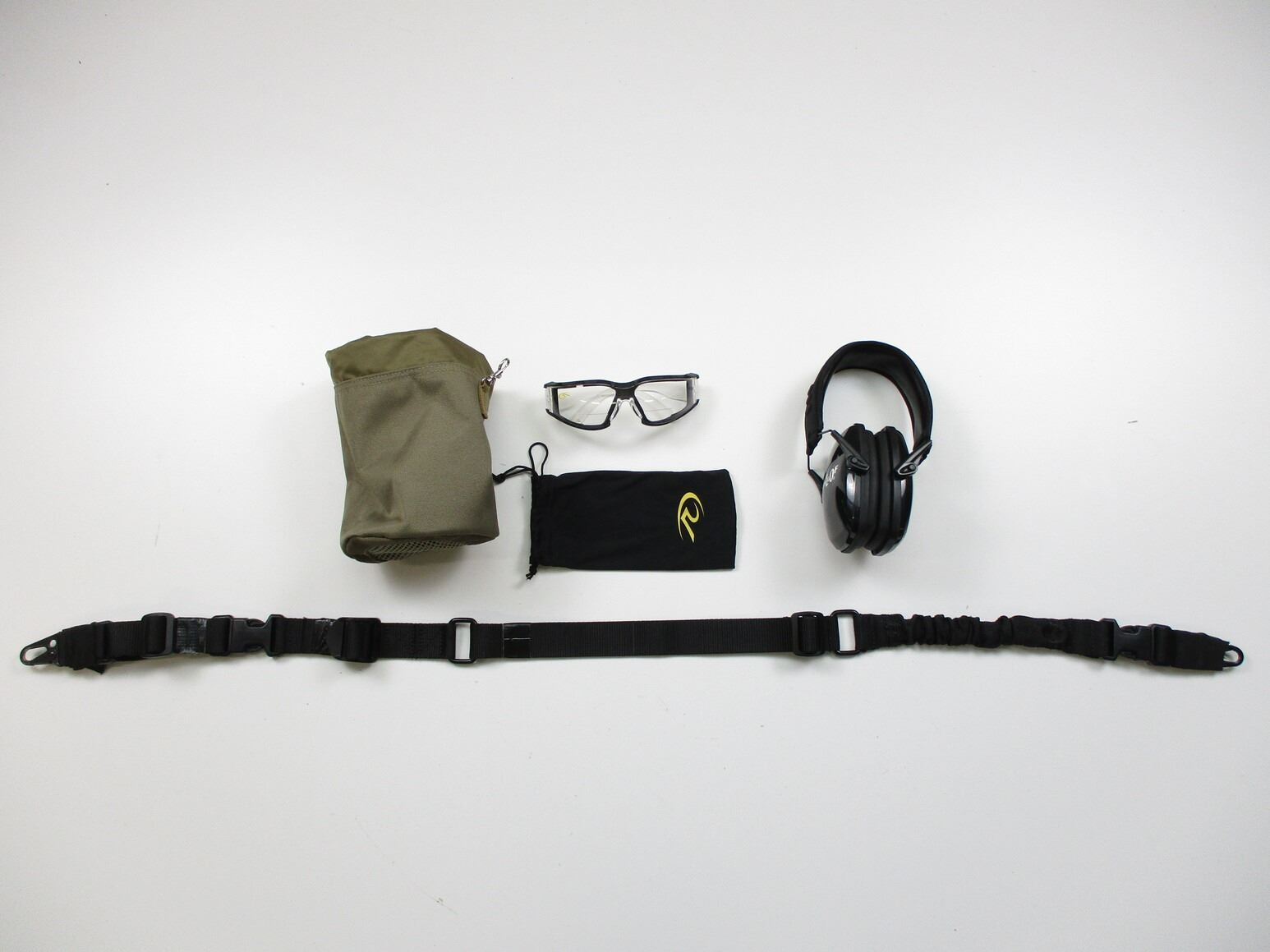 ASSORTED RANGE EQUIPMENT , INCLUDES: 1 PAIR OF BILSOM EAR PROTECTION, (1) PAIR OF RANGE GLASSES, WITH PADDING AROUND EYE PIECES, COMES WITH CARRY POUCH, (1) NYLON 1 POINT SLING, WITH BUNGEE. (1) SHELL HOLDER TYPE POUCH, ATTACHES VIA CLIP.
