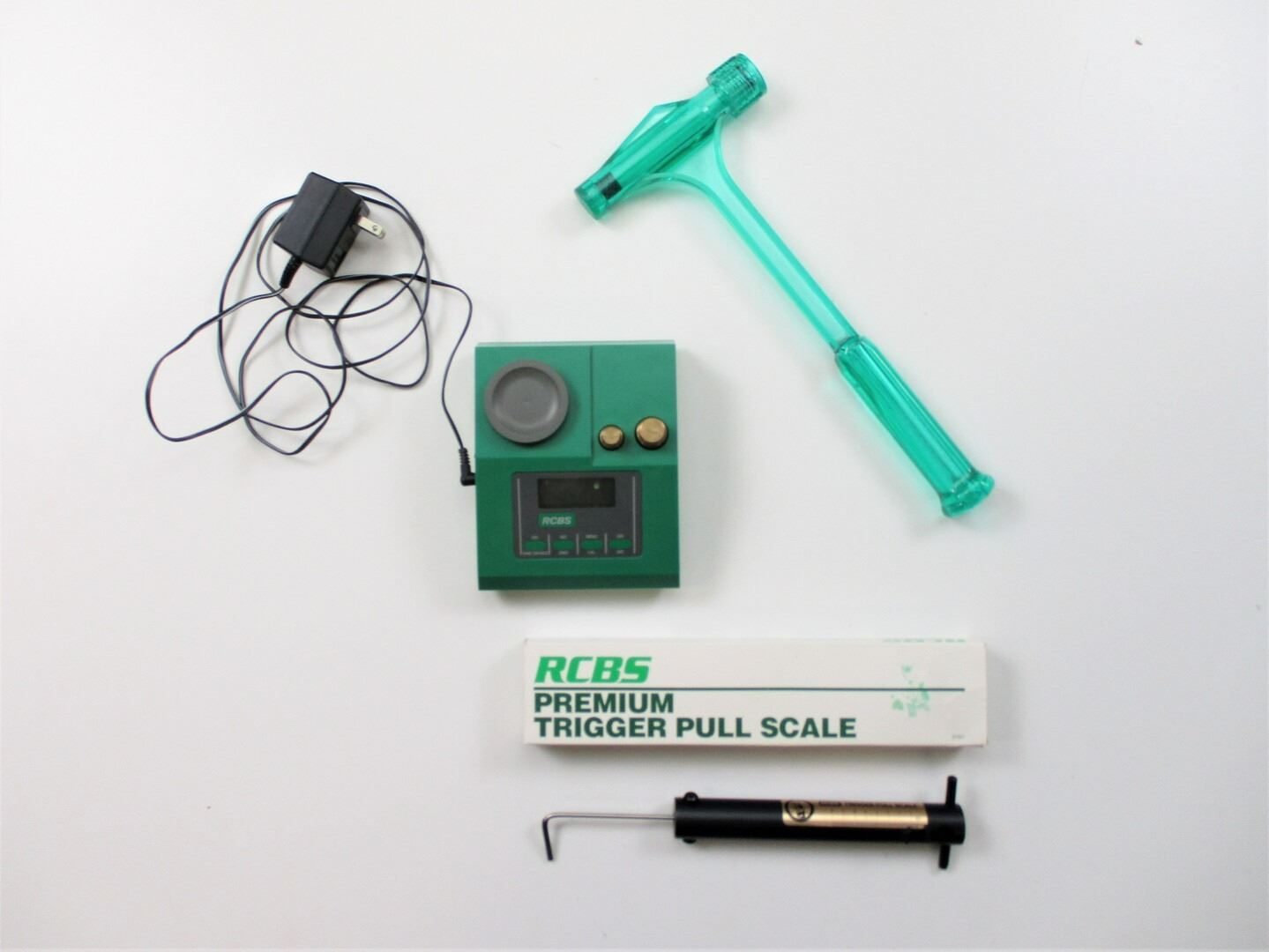 ASSORTED RCBS RELOADING LOT, LOT INCLUDES; (1) WEIGH SCALE, MISSING PAN, WITH 20 GR. & 50 GR. WEIGHTS, SERIAL #: 49613, UN-TESTED, (1) KINETIC BULLET PULLER & (1) PREMIUM TRIGGER PULL SCALE, IN ORIGINAL PACKAGING. SEE PHOTOS.
