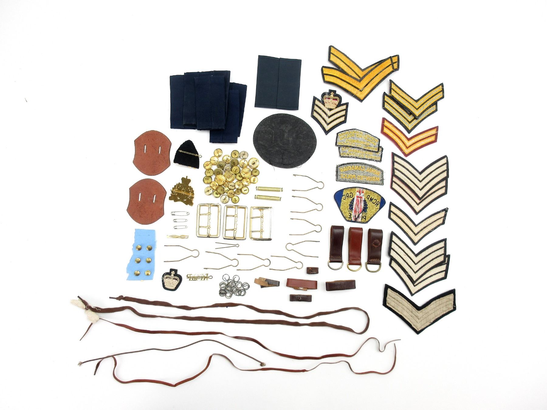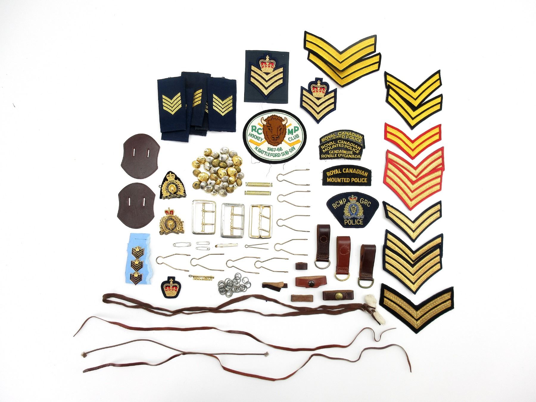 APPROX. (80) PIECES, VARIOUS MATERIALS, SIZES, QUEEN'S CROWNS, INCLUDES; SILVER COLOURED / BRASS BUTTONS, RCMP CAP BADGE, RANK CHEVRONS, EPAULETS, BRASS BELT BUCKLE, RCMP HOCKEY CLUB BADGE, VARIOUS LEATHER STRAPS, RCMP SHOULDER BADGES, ETC. SEE PHOTOS.