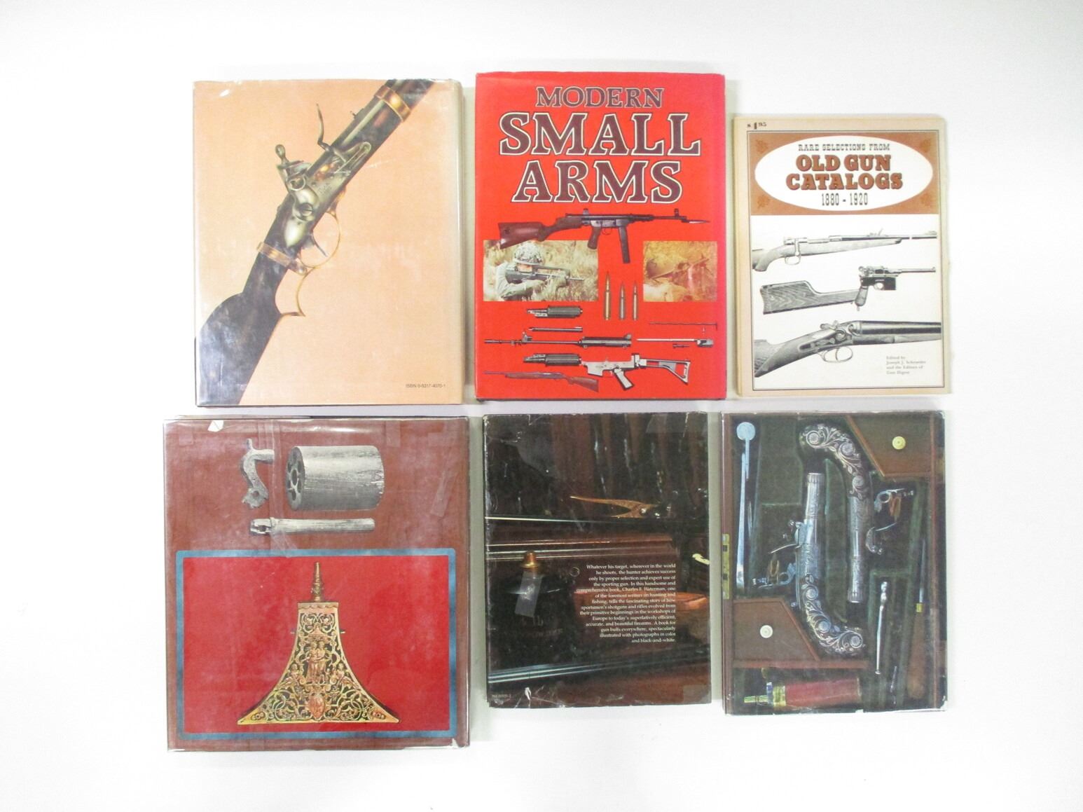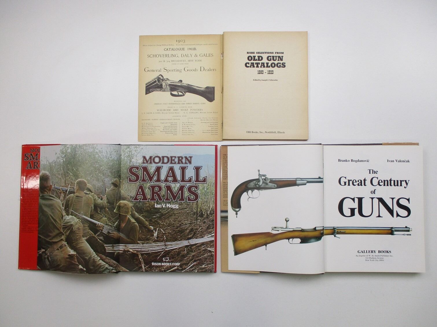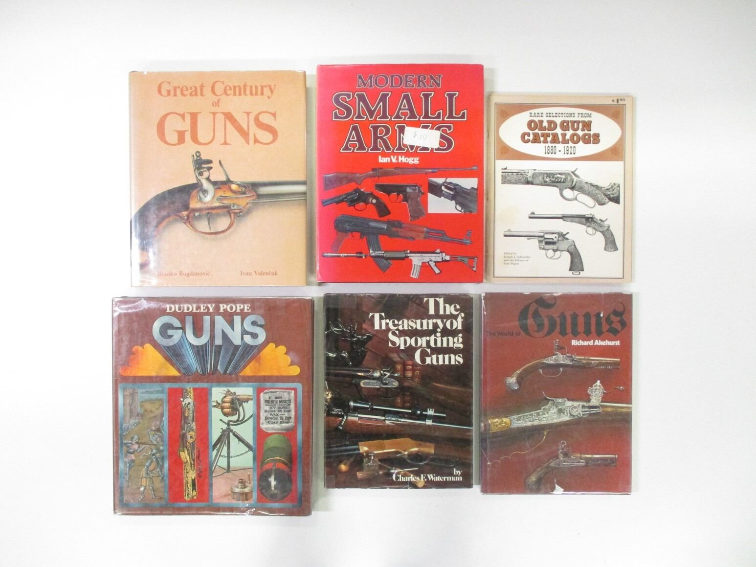 ASSORTED RIFLE BOOKS LOT, LOT OF 5. LOT INCLUDES: (1) "THE WORLD OF GUNS" RICHARD AKEHURST, HARD COVER, ISBN: 0-600-39236-8, (1) "MODERN SMALL ARMS" BY IAN V. HOGG, HARD COVER, ISBN: 0-86124-123-1, (1) "GREAT CENTURY OF GUNS" BY BRANKO BOGDANOVIC AND IVAN VALENCAK, HARD COVER, ISBN: 0-8317-4070-1, (1) "RARE SELECTIONS FROM OLD GUN CATALOGS 1880-1920" EDITED BY JOSEPH J. SCHROEDER, SOFT COVER, (1) "GUNS" BY DUPLEY POPE, HARD COVER, & (1) "THE TREASURY OF SPORTING GUNS" BY CHARLES F. WATERMAN, HARD COVER, ISBN: 0-394-50535-2. SEE PHOTOS.