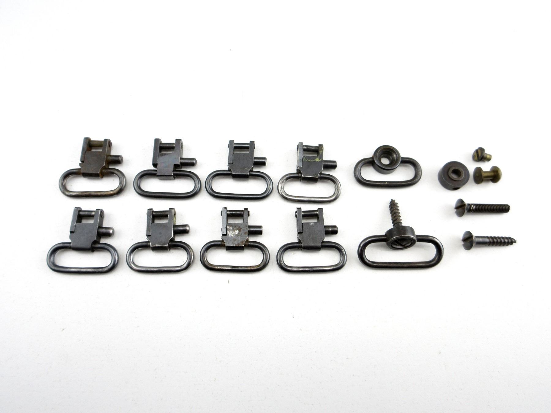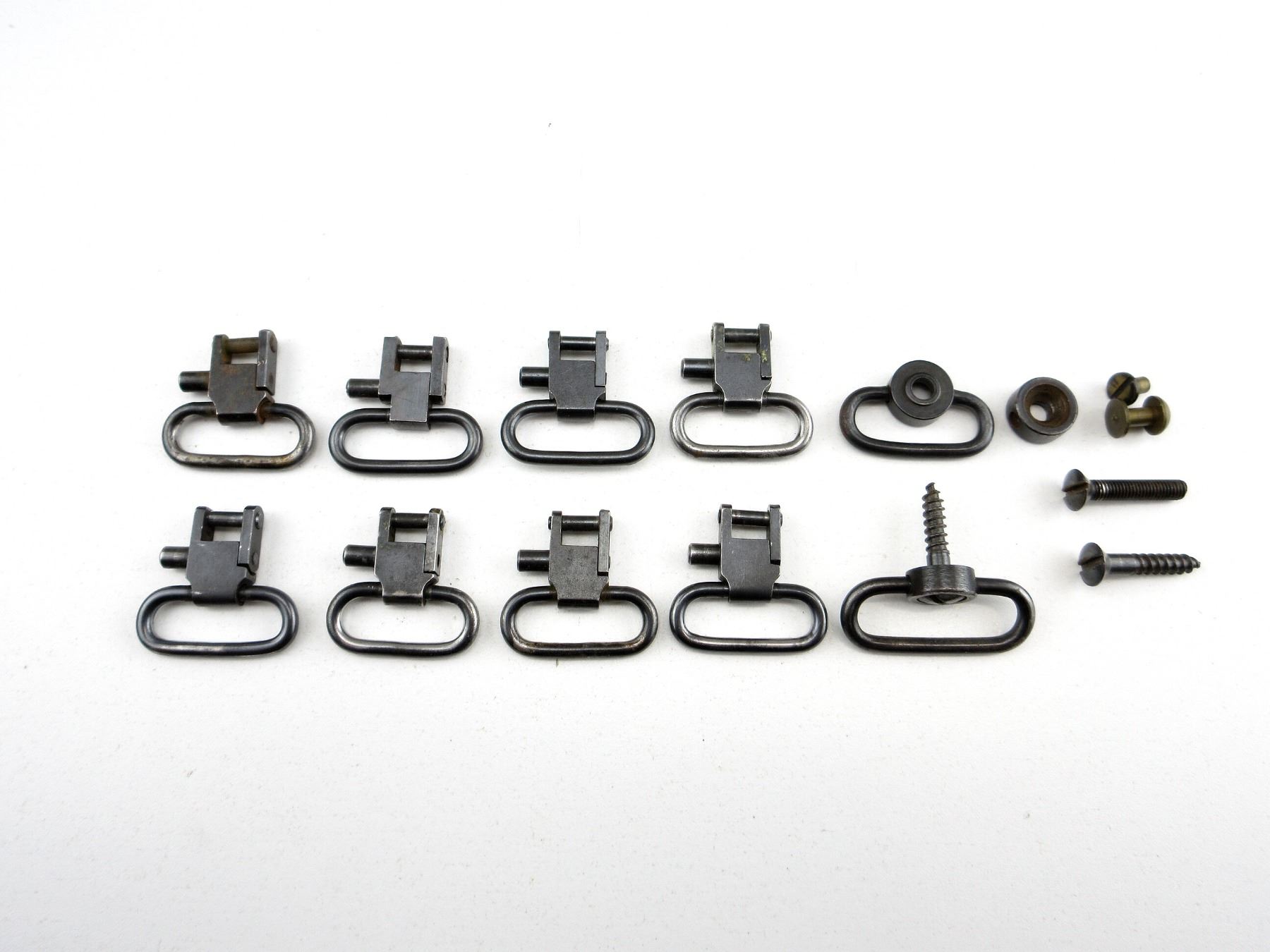 LOT INCLUDES; APPROX. (10) ASSORTED RIFLE SLING SWIVELS, VARIOUS DESIGNS, SCREWS, ETC. MAY REQUIRE FITTING. SEE PHOTOS.