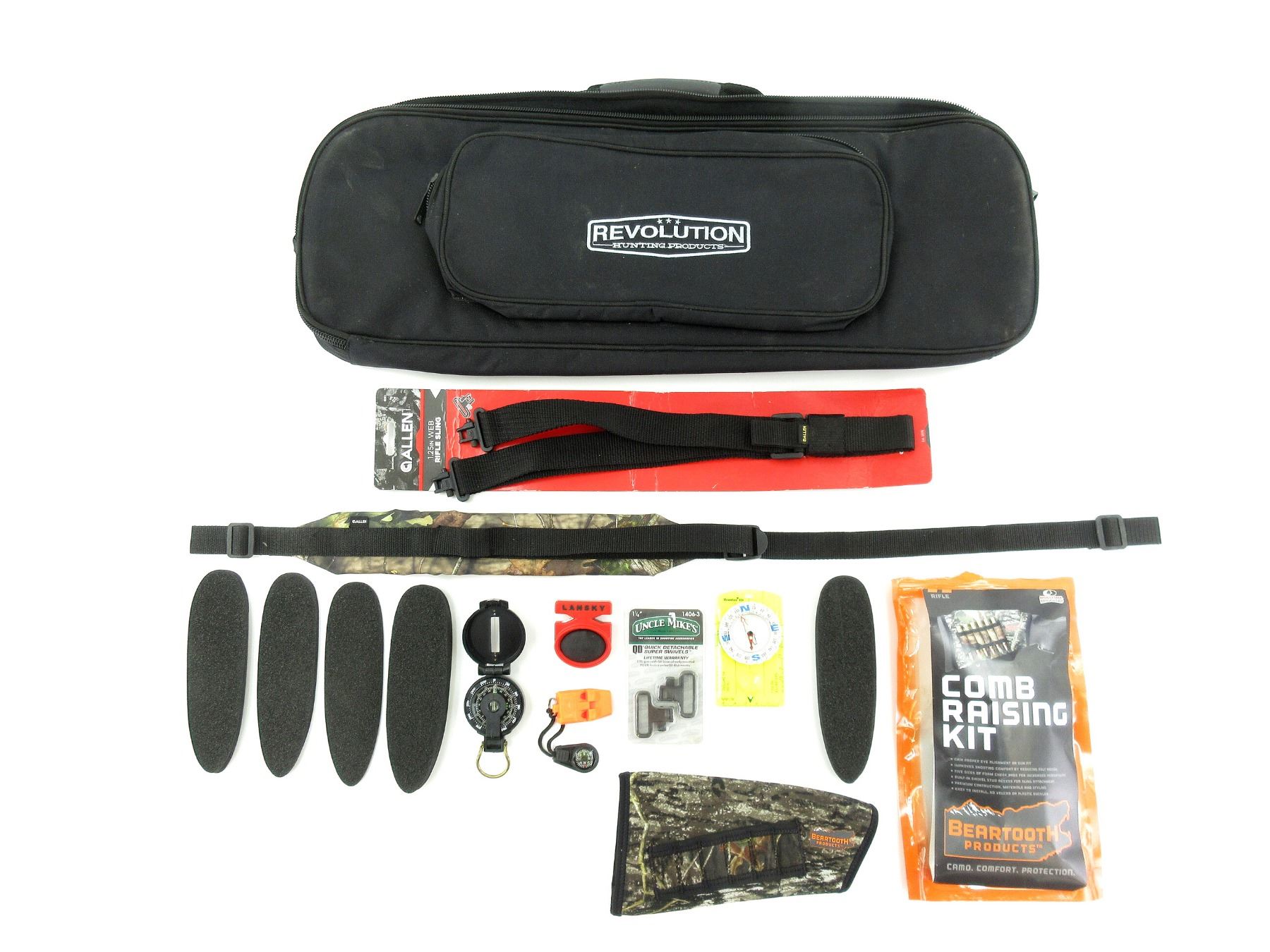 LOT INCLUDES; (1) ALLEN BLACK NYLON RIFLE SLING, WITH SLING SWIVELS, ADJUSTABLE, NOS, UNOPENED, (1) ALLEN RIFLE SLING, GREEN CAMO PADDED SHOULDER STRAP, ADJUSTABLE, OAL APPROX. 44.5", (1) SET OF UNCLE MIKE'S QUICK DETACH SLING SWIVELS, WITH ORIGINAL PACKAGING, (1) REVOLUTION TAKE DOWN CASE, SOFT PADDED, BLACK NYLON CONSTRUCTION, WORKING ZIP CLOSURE, WITH CARRY HANDLE, OAL APPROX. 26", (1) BEARTOOTH COMB RAISING KIT, MOSSY OAK BREAK UP CAMO, SLIP ON STYLE, WITH VARIOUS CHEEK PADS, WITH ORIGINAL PACKAGING, WITH VARIOUS COMPASSES, ETC. SEE PHOTOS.