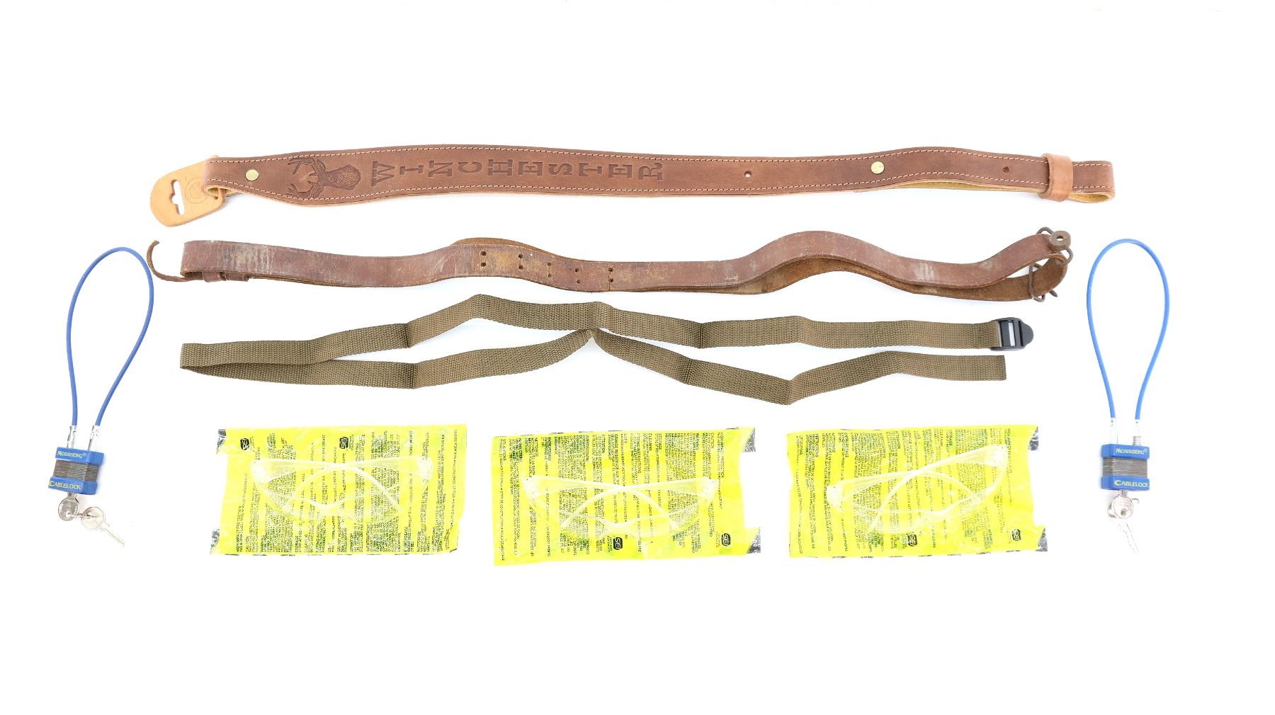 LOT INCLUDES; (1) WINCHESTER TRAIL MARKER BROWN LEATHER SLING, OAL APPROX. 36", ADJUSTABLE, (1) UNKNOWN BROWN LEATHER SLING, OAL APPROX. 30", ADJUSTABLE, (1) UNKNOWN GREEN NYLON STRAP, OAL APPROX. 55", (2) MOSSBERG CABLELOCK KEYED LOCKS, (3) SETS OF SAFETY GLASSES, ETC. SEE PHOTOS.