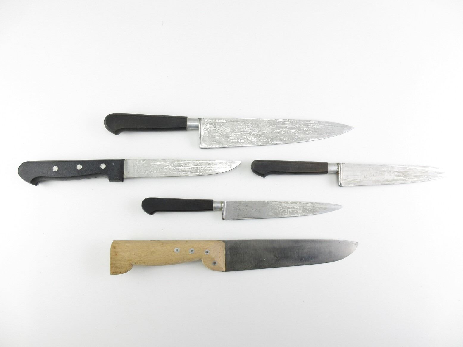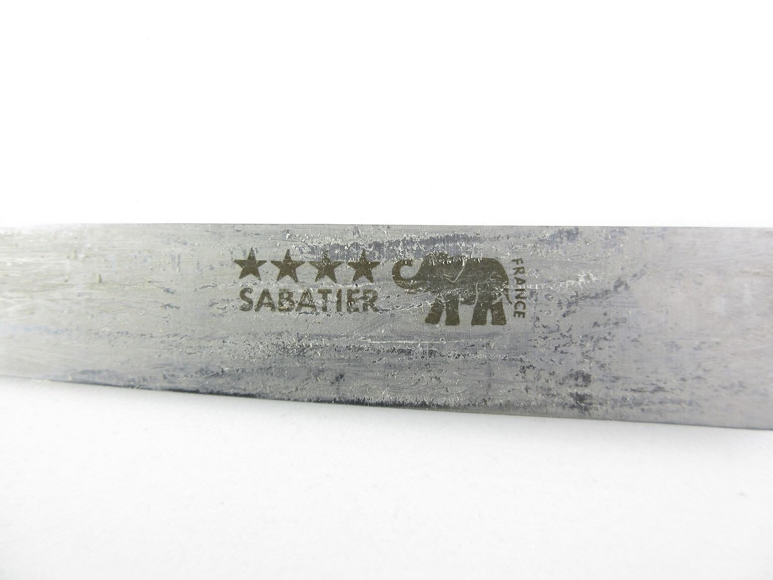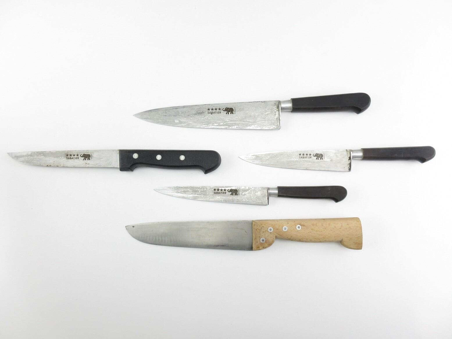 ASSORTED SABATIER KITCHEN KNIVES LOT. LOT INCLUDES; (1) SABATIER CHEF'S KNIFE, STEEL BLADE, BLADE IS GREASED, WOOD HANDLE, BLADE APPROX. 8", (1) SABATIER CHEF'S KNIFE, STEEL BLADE, BLADE IS GREASED, BLACK POLYMER HANDLE, BLADE APPROX. 6", (1) SABATIER CHEF'S KNIFE, STEEL BLADE, BLADE IS GREASED, WOOD HANDLE, BLADE APPROX. 6", (1) SABATIER SLICER KNIFE, STEEL BLADE, BLADE IS GREASED, WOOD HANDLE, BLADE APPROX. 6", (1) UNKNOWN FIXED BLADE KNIFE, WOOD HANDLE, BLADE APPROX. 6.5". SEE PHOTOS.