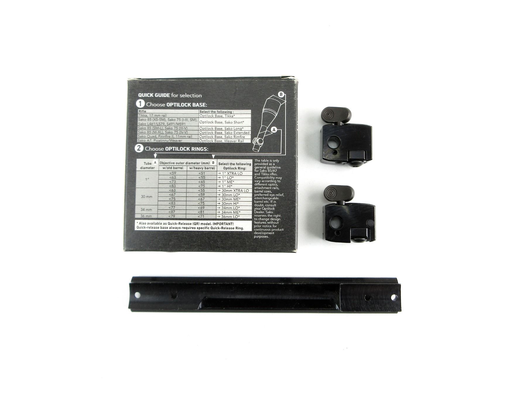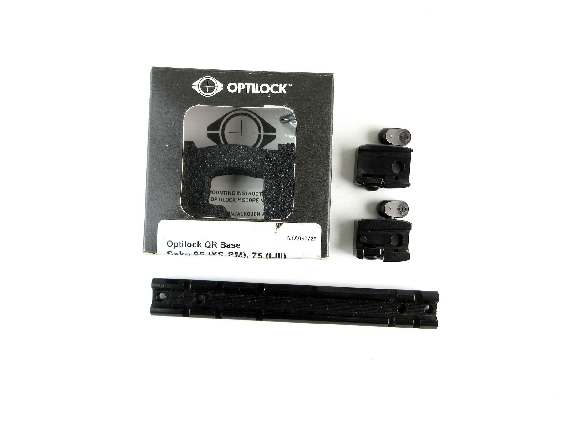 LOT INCLUDES; (1) PAIR OF OPTILOCK QR BASE, FITS SAKO 85 (XS-SM) / 75 (I-III), WITH ORIGINAL PACKAGING & INSTRUCTION MANUAL, (1) WEAVER ONE PIECE SCOPE BASE, MARKED: "98". SEE PHOTOS.