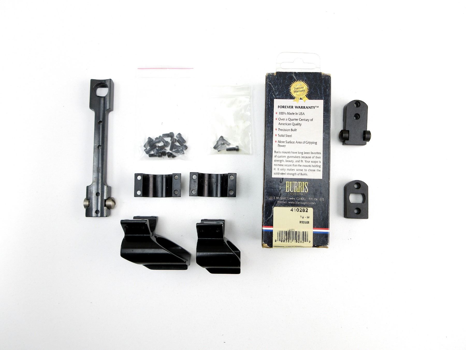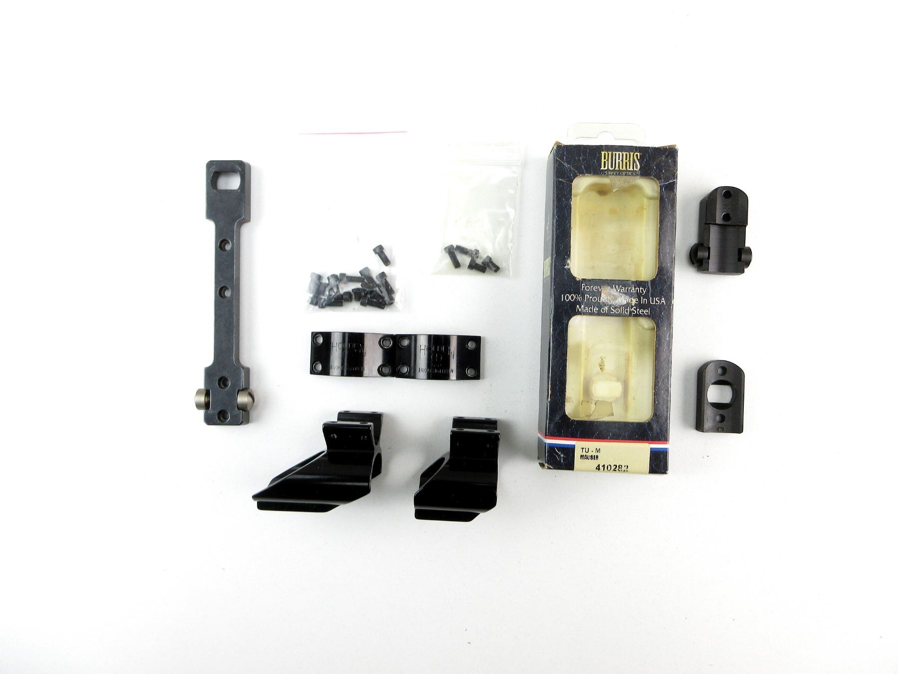LOT INCLUDES; (1) LEUPOLD SCOPE MOUNT, TURN IN STYLE, MARKED: "760", WITH MOUNTING SCREWS, (1) PAIR OF BURRIS SCOPE RING MOUNTS, TURN IN STYLE, PACKAGING MARKED: "TU-M, MAUSER, 410280", WITH ORIGINAL BOX, (1) PAIR OF HOLDEN SEE-THRU SCOPE RINGS, 1" DIAMETER, MARKED: "717" & "718", WITH MOUNTING SCREWS. SEE PHOTOS.
