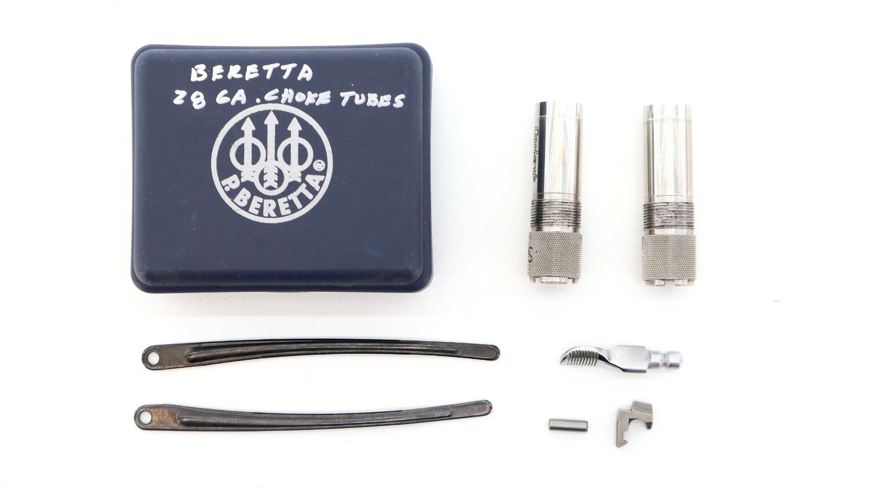 LOT INCLUDES; (2) CARLSON 28 GAUGE SHOTGUN CHOKES, FITS BERETTA / BENELLI 28 GAUGE SHOTGUNS, SKEET CHOKES, STEEL CONSTRUCTION, OAL APPROX. 2.25", (1) BERETTA CHOKE TUBE CASE, HARD PLASTIC, PADDED, APPROX. 3.75" X 3" X 1.25", (1) SMITH & WESSON MODEL 1000 EXTRACTOR, (1) SMITH & WESSON MODEL 1000 OPERATING HANDLE, (2) SMITH & WESSON MODEL 1000 LINKS, ONE RIGHT / ONE LEFT, ETC. SEE PHOTOS.
