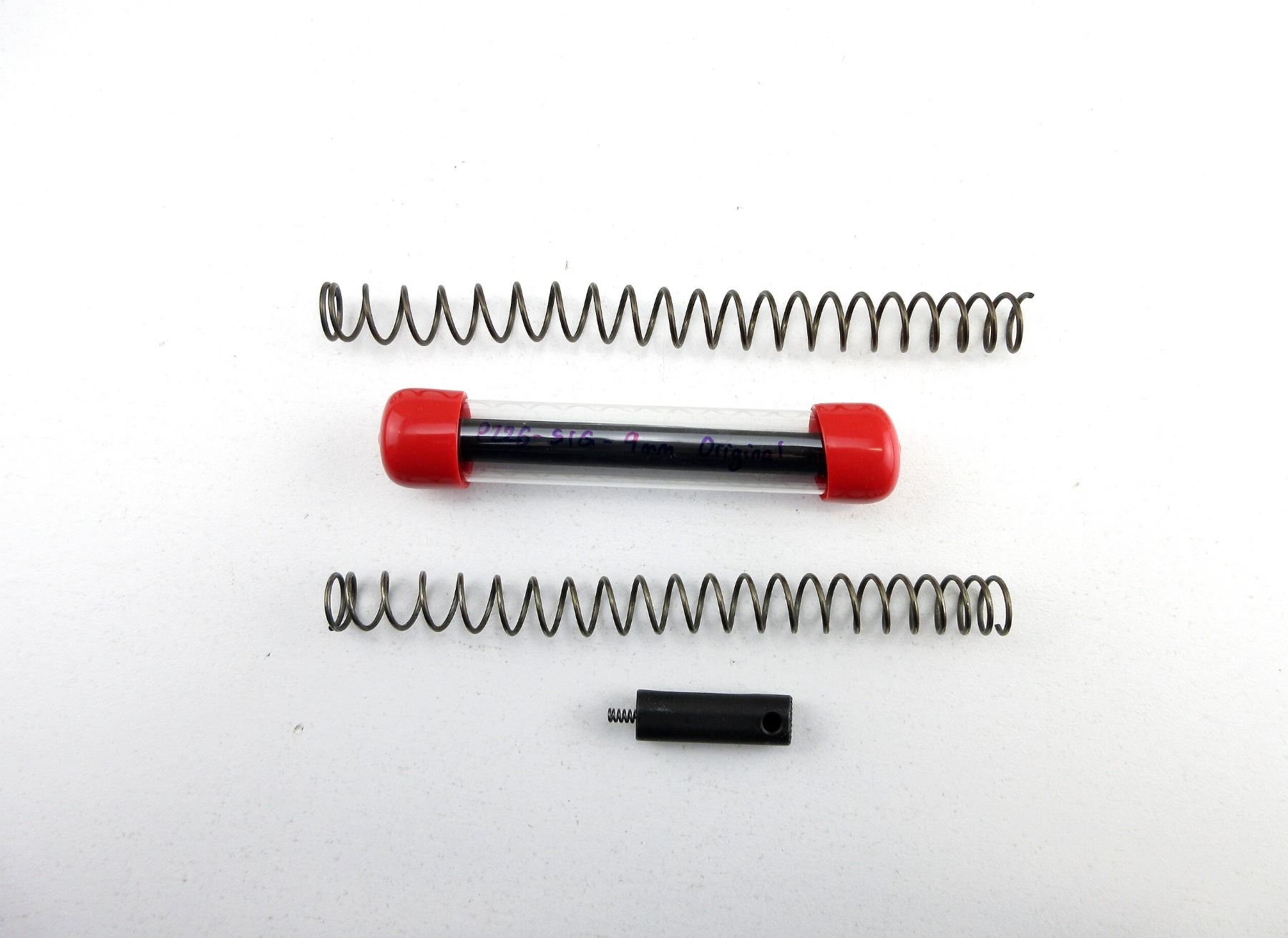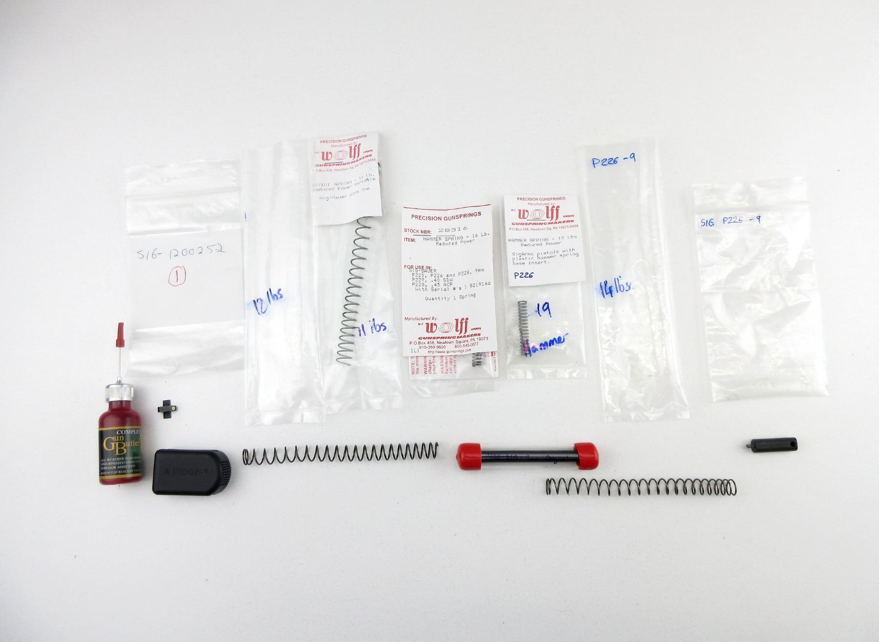 FITS VARIOUS SIG SAUER HANDGUN MODEL, LOT INCLUDES; ASSORTED HAMMER SPRINGS WITH VARIOUS WEIGHT RATINGS, ASSORTED RECOIL SPRINGS WITH VARIOUS WEIGHT RATINGS, (1) FRONT SIGHT, (1) MAG POLYMER BASE, (1) GUN BUTTER - HALF FULL, ETC. MAY REQUIRE FITTING. SEE PHOTOS.