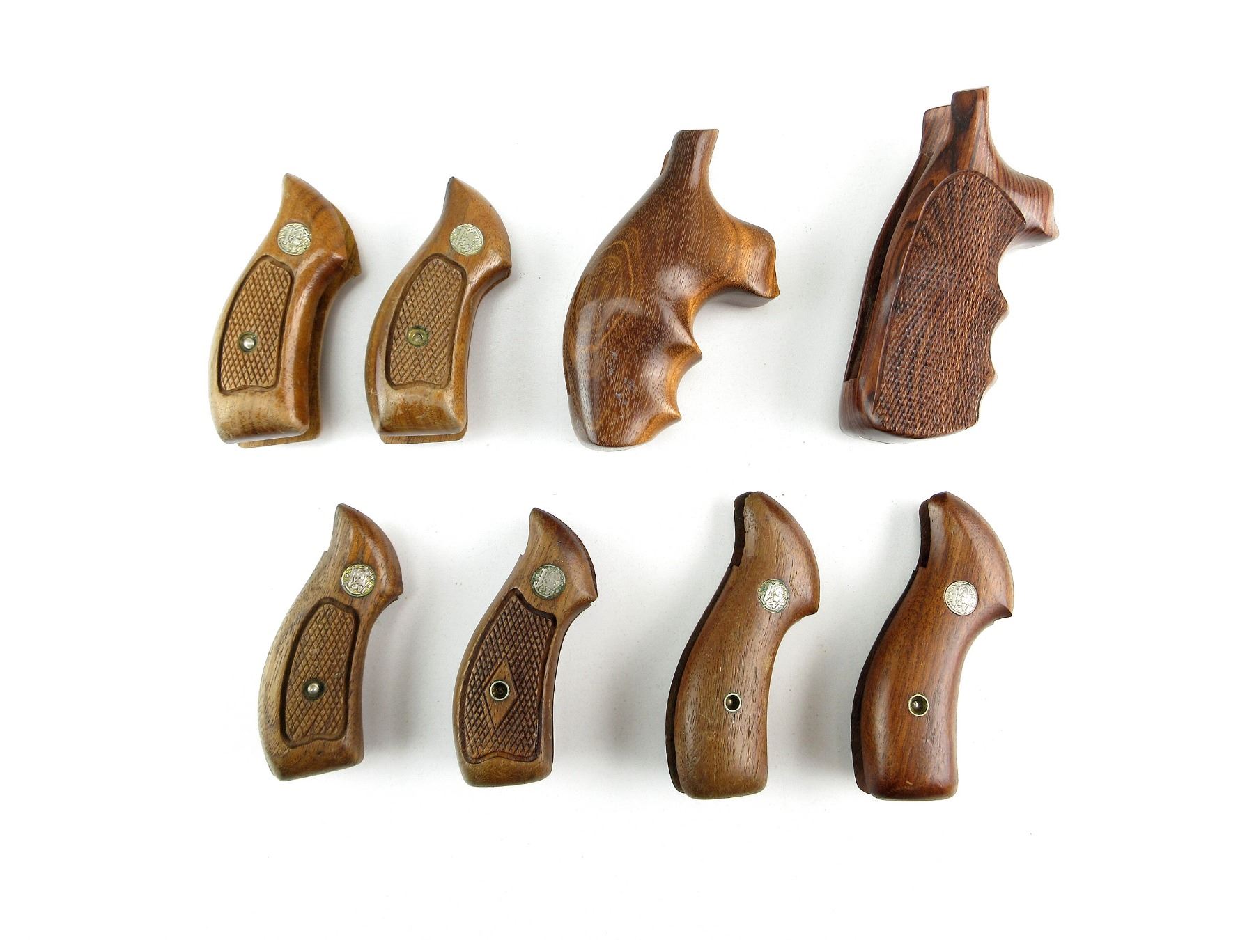LOT INCLUDES; (1) UNKNOWN ONE PIECE S&W J FRAME REVOLVER GRIPS, ROUND BUTT, WOOD CONSTRUCTION, WITH FINGER GROOVES, OAL APPROX. 4", (1) UNKNOWN ONE PIECE S&W J FRAME REVOLVER GRIPS, ROUND BUTT, WOOD CONSTRUCTION, WITH CHECKERING & FINGER GROOVES, OAL APPROX. 4", (6) PAIRS OF S&W J FRAME REVOLVER GRIPS, WOOD CONSTRUCTION, SOME WITH CHECKERING, INCLUDES MOUNTING SCREWS. MAY REQUIRE FITTING. SEE PHOTOS.