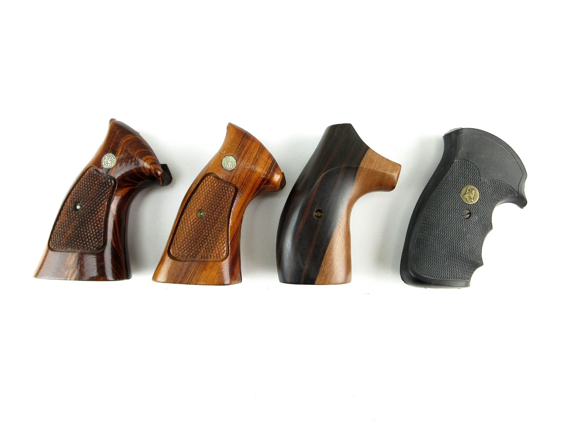 LOT INCLUDES; (1) PAIR OF PACHMAYR REVOLVER GRIPS, BLACK RUBBER CONSTRUCTION, WITH CHECKERING, ROUND BUTT, WITH MOUNTING SCREW, (2) PAIRS OF S&W REVOLVER GRIPS, WOOD CONSTRUCTION, WITH CHECKERING, SQUARE BUTT, WITH MOUNTING SCREWS, (1) PAIR OF S&W REVOLVER GRIPS, WOOD CONSTRUCTION, ROUND BUTT, WITH MOUNTING SCREW. MAY REQUIRE FITTING. SEE PHOTOS.