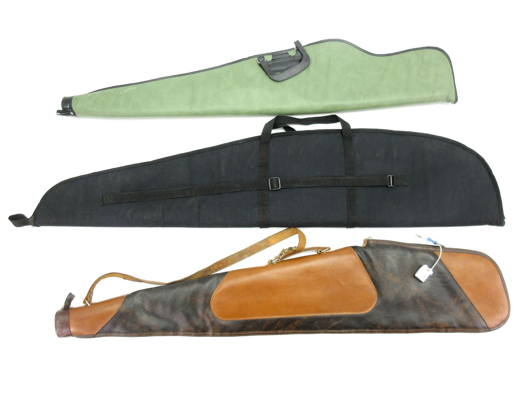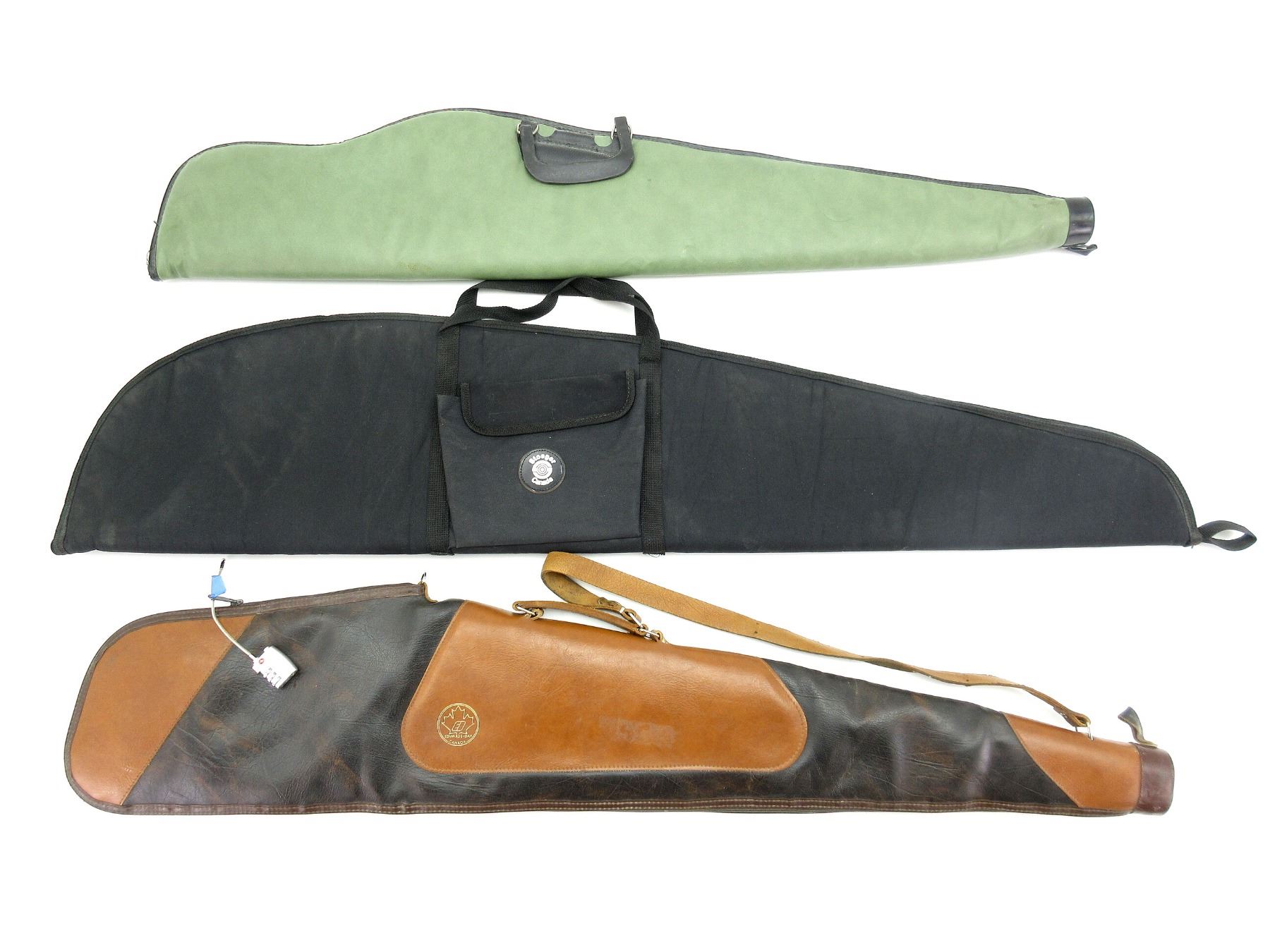 LOT INCLUDES; (3) SOFT PADDED GUN CASES, CARRY HANDLES, ZIPPERED, (2) WITH SHOULDER STRAPS, (1) WITH OUTSIDE POCKET, (1) COMBINATION CABLE LOCK, APPROX. OAL 44"-50", SHOWS WEAR AND TEAR FROM USAGE, SEE PHOTOS.