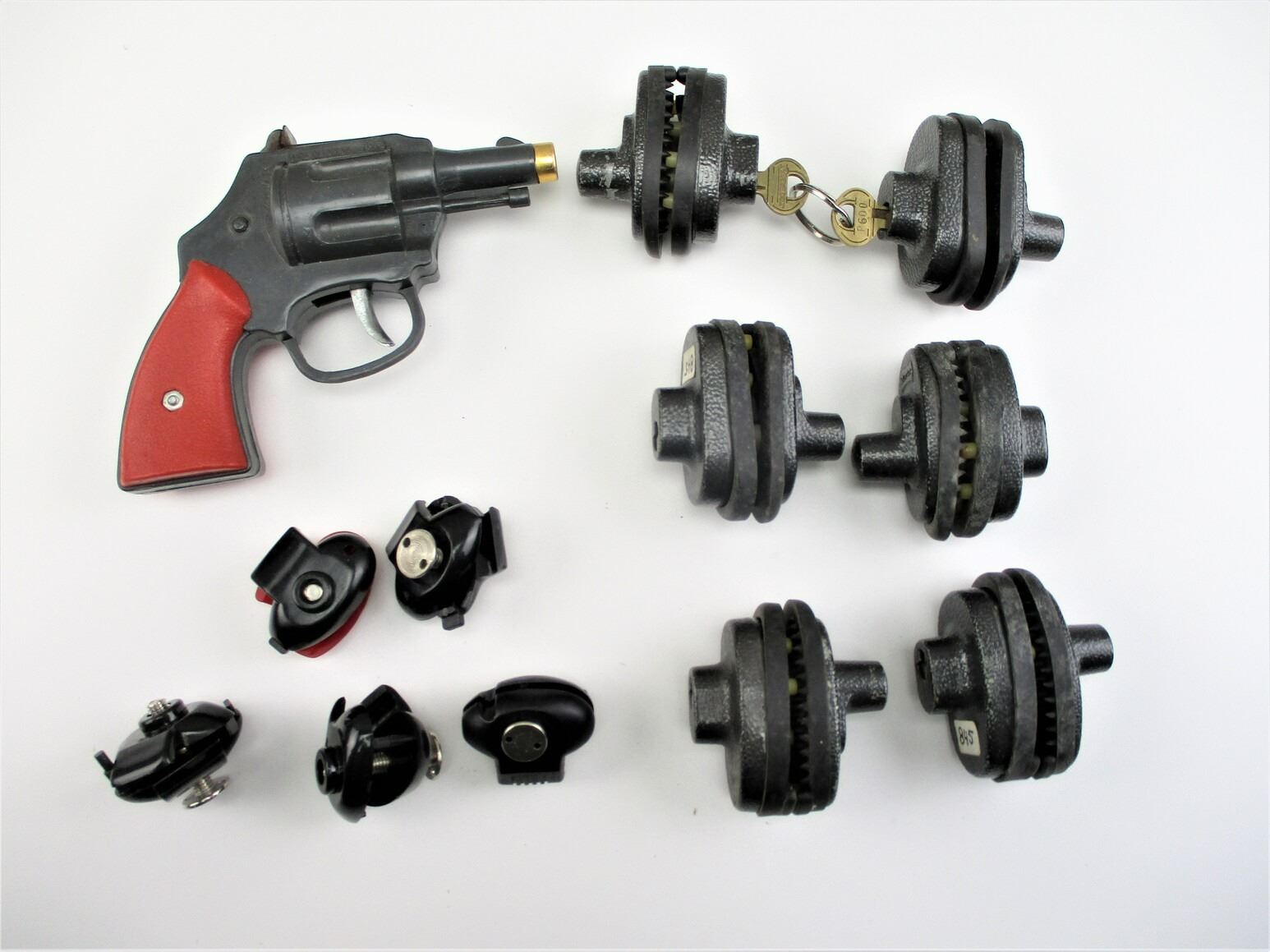 (2) TRIGGER LOCKS WITH KEYS, (4) TRIGGER LOCKS WITH NO KEYS. LOCKS TAKE P845 KEYS, (5) PLASTIC TRIGGER LOCKS, (1) VINTAGE STYLE CAP GUN.