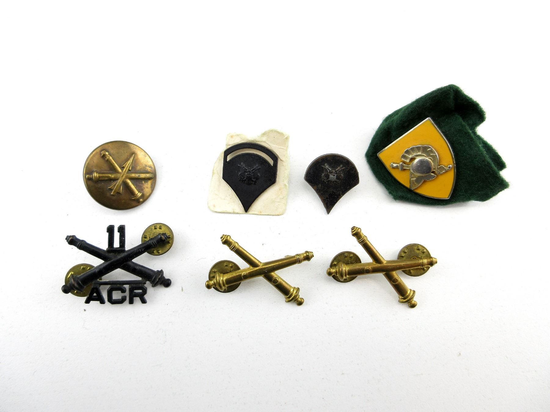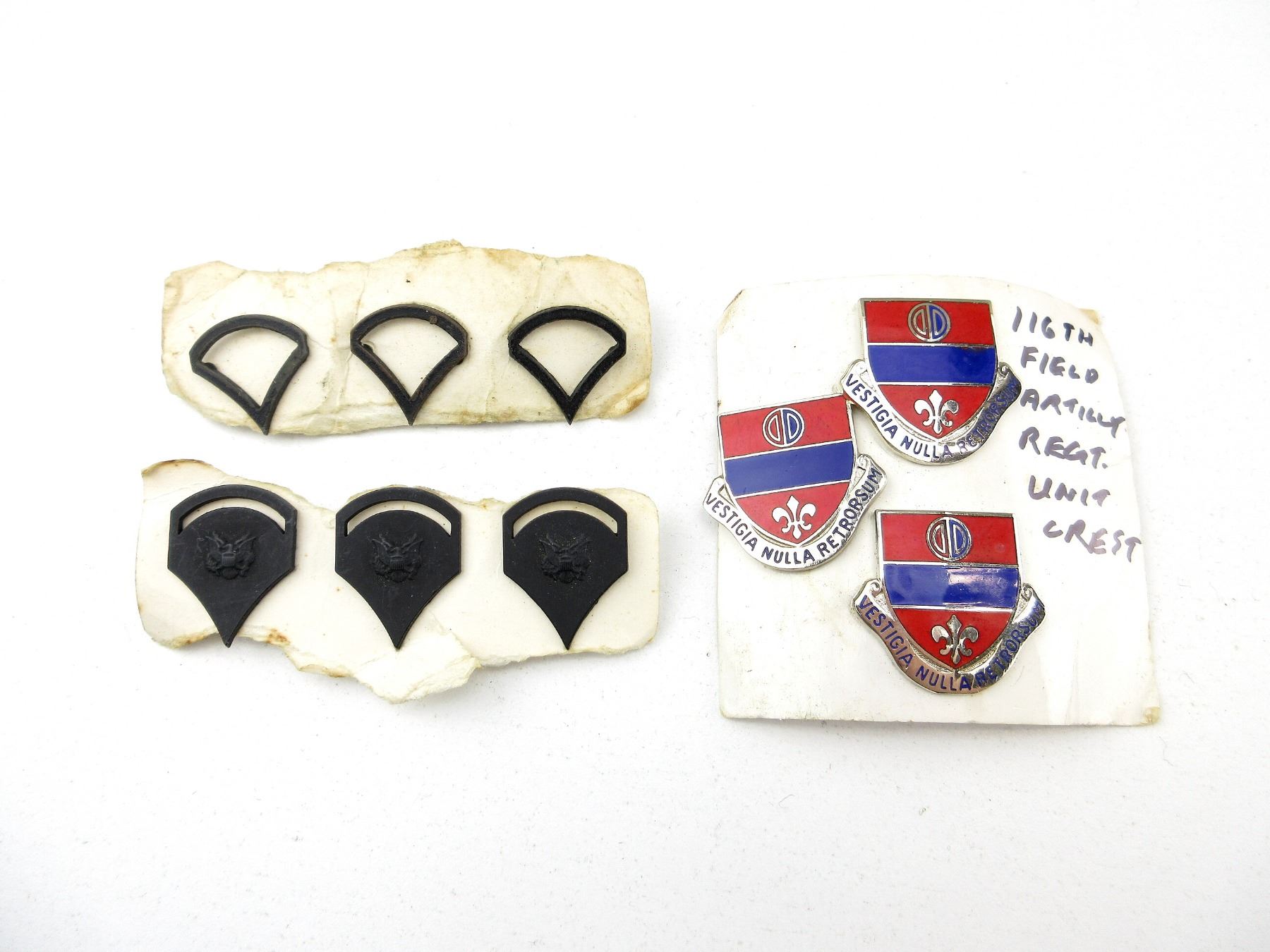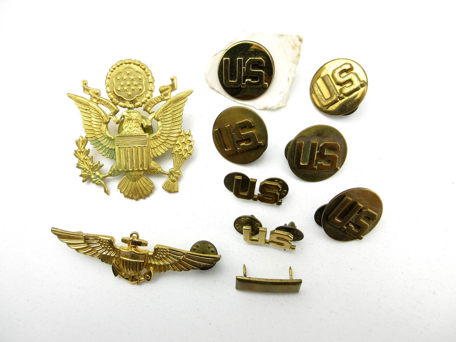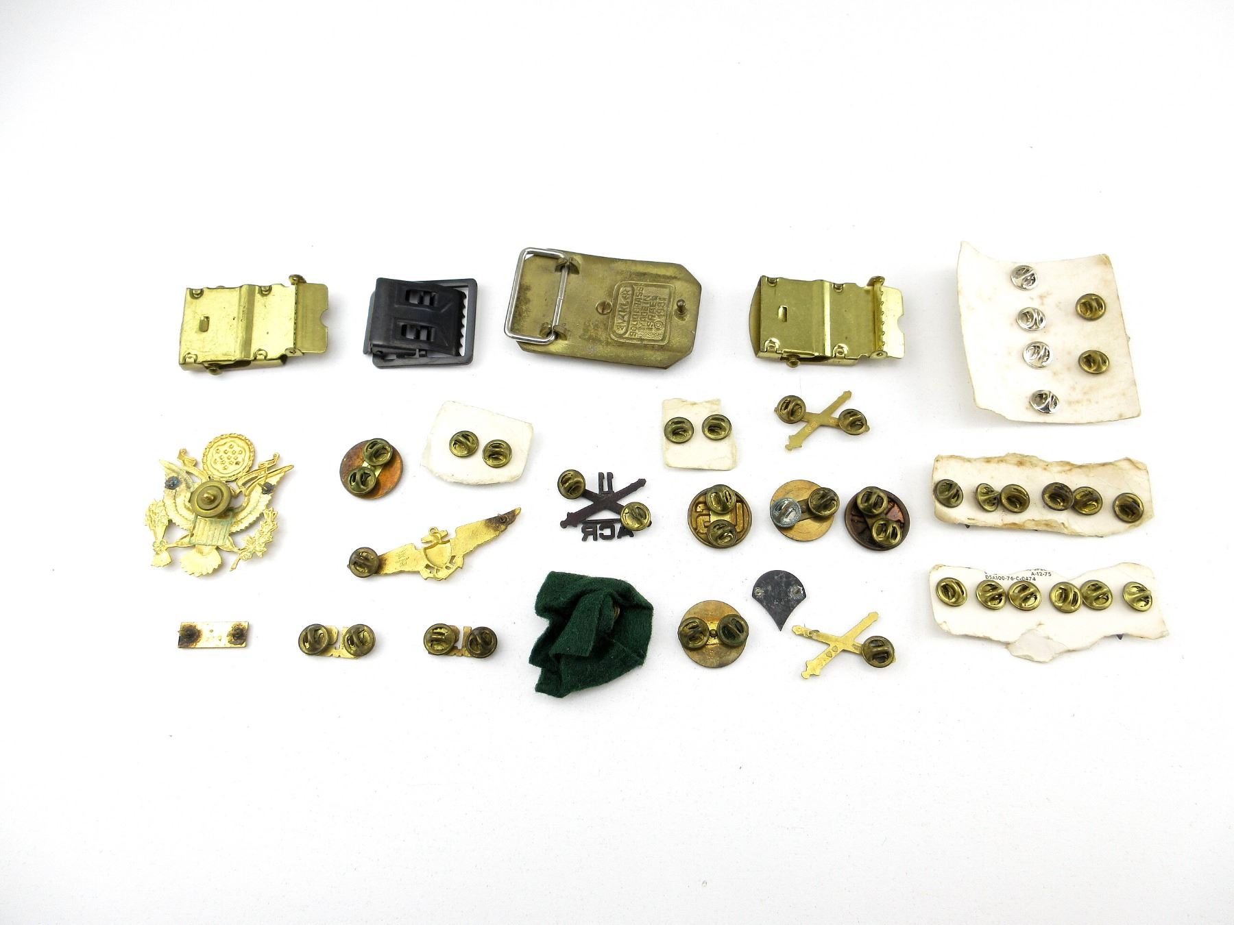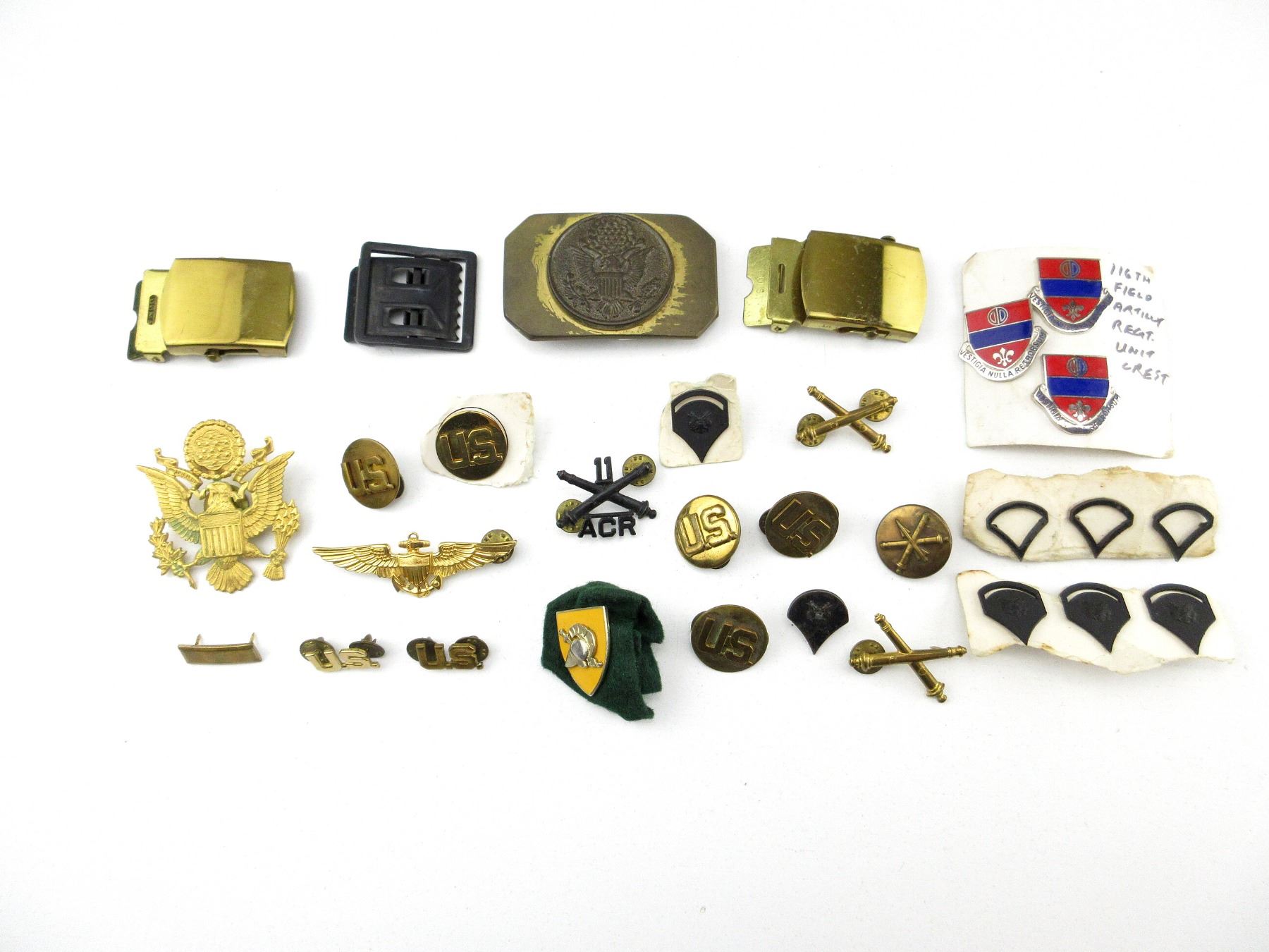 APPROX. (30) PIECES, VARIOUS MATERIALS / SIZES, INCLUDES; U.S. PINS, VARIOUS STYLE BRASS / METAL BELT BUCKLES, 116TH FIELD ARTILLERY REGIMENT UNIT CREST PINS, USMA WEST POINT CADET PIN, NAVAL AVIATOR WINGS, ARMY SPECIALIST 5 (SPC-5) RANK PINS, GREAT SEAL OF THE UNITED STATES CAP BADGE, ETC. SEE PHOTOS.