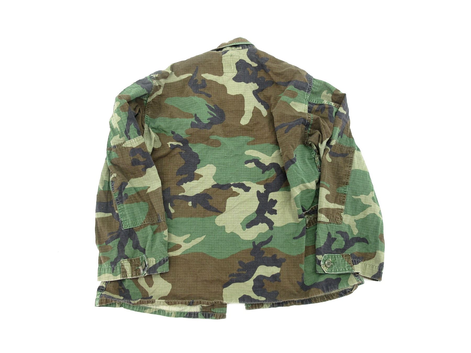 LOT INCLUDES; (2) HOT WEATHER WOODLAND CAMO PATTERN COMBAT COATS, SIZE MEDIUM-SHORT / MEDIUM-XSHORT, VARIOUS MARKINGS / LABELS, BUTTON-FLY FRONT, SHOWS WEAR / TEAR, (1) UNIVERSAL CAMO PATTERN COMBAT COAT, SIZE MEDIUM-REGULAR, VARIOUS MARKINGS / LABELS, ZIPPERED-FLY FRONT (WORKS), SHOWS WEAR & (1) PAIR OF GREEN CLOTH / LEATHER GORE-TEX GLOVES, SIZE MEDIUM, VARIOUS MARKINGS / LABELS. SEE PHOTOS.