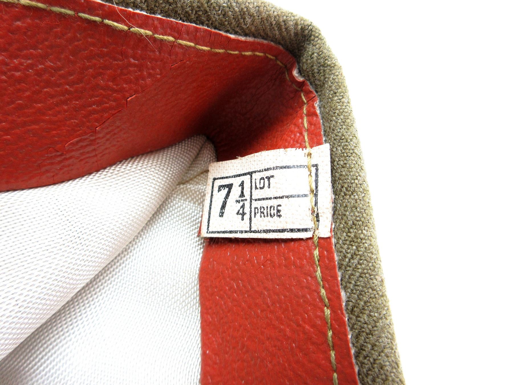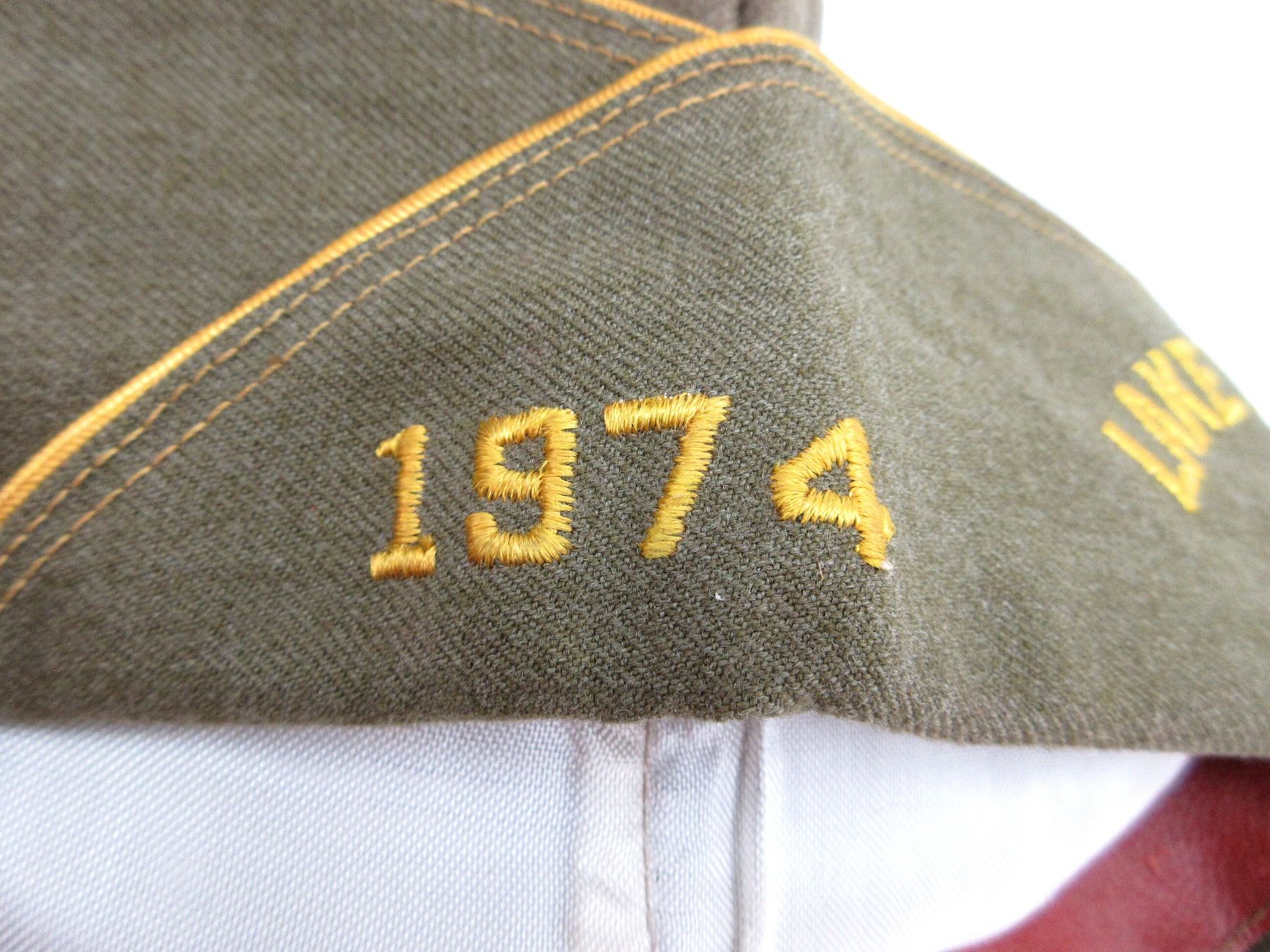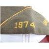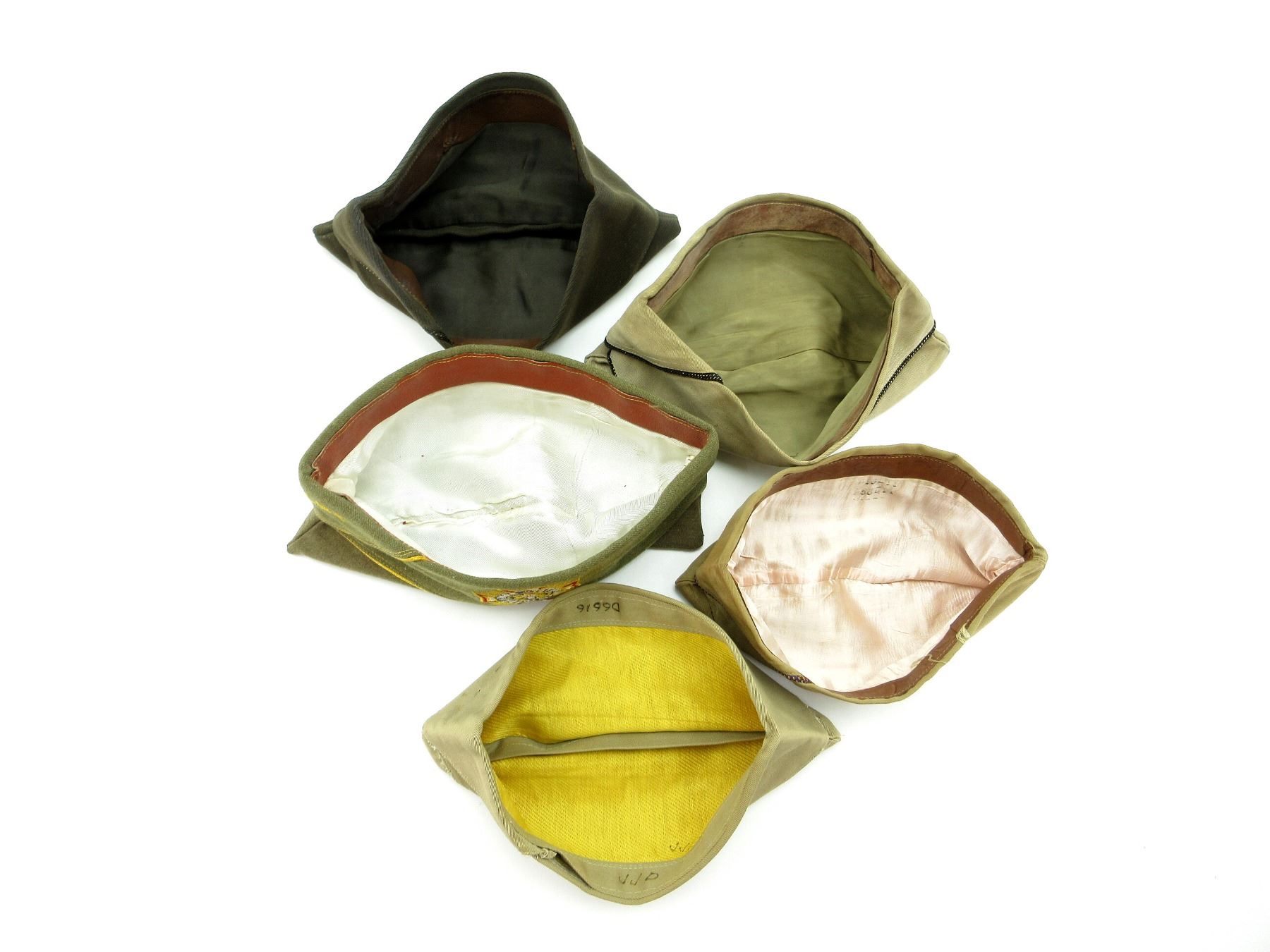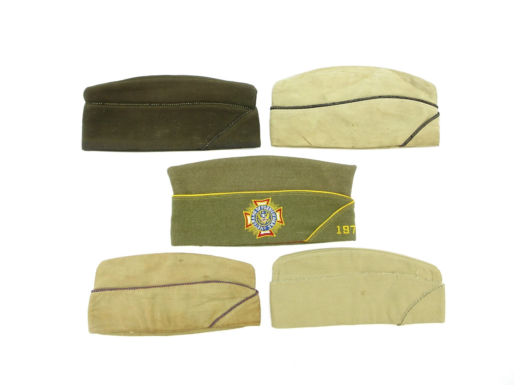 LOT INCLUDES; (4) TAN / DARK BROWN WOOL GARRISON / WEDGE CAPS, CONSIGNOR STATES: "WWII US ARMY GARRISON CAPS", VARIOUS HAND-WRITTEN / INK STAMP MARKINGS, VARIOUS COLOURED SATIN-LIKE LINING, THREE WITH PIPING ON OUTSIDE & (1) GREEN WOOL GARRISON / WEDGE CAP, MARKED: "LAKE ERIE POST, OHIO, 1974" & "VETERANS OF FOREIGN WARS" BADGE, SIZE 7 1/4", WHITE SATIN-LIKE LINING. SEE PHOTOS.