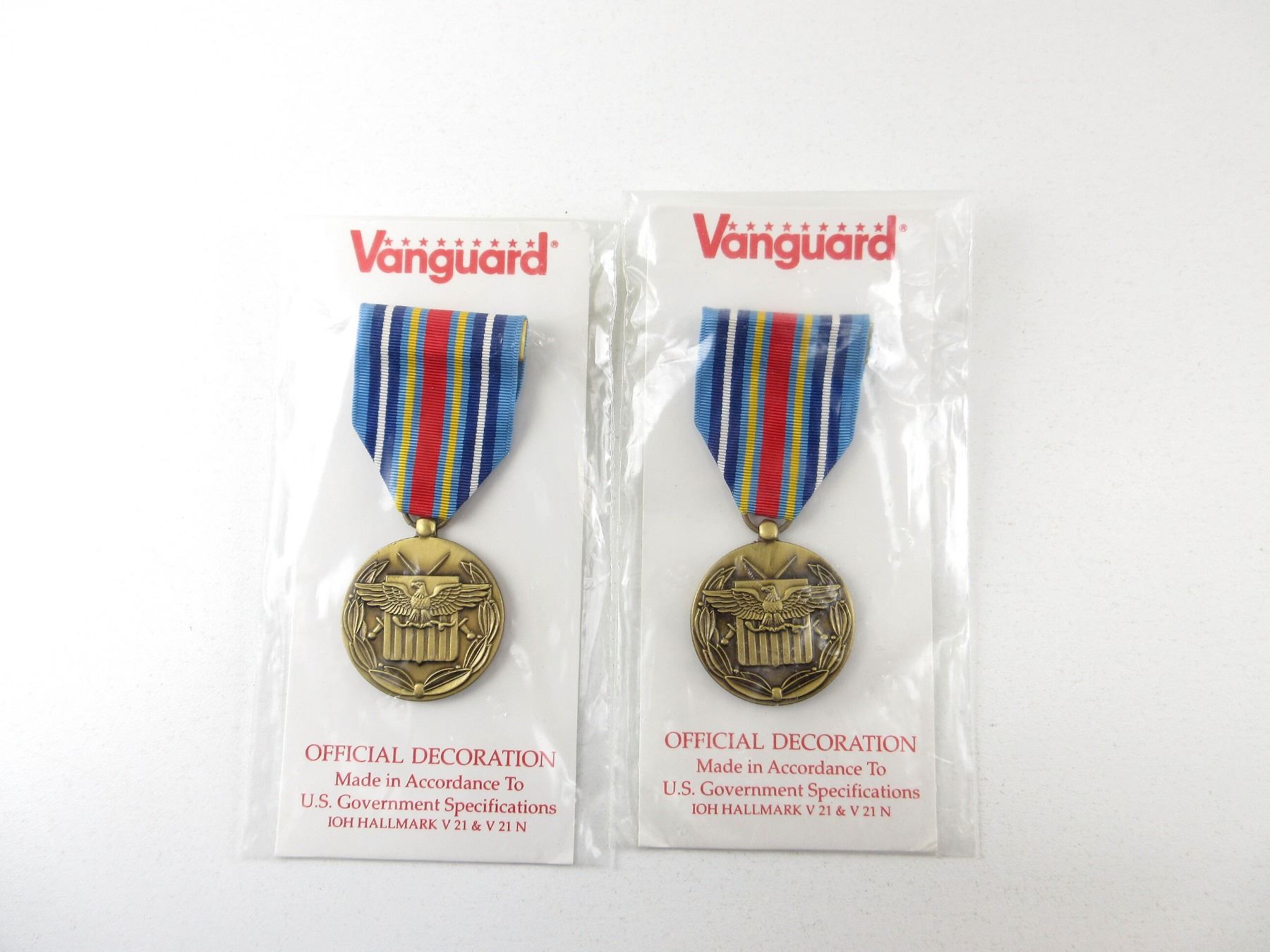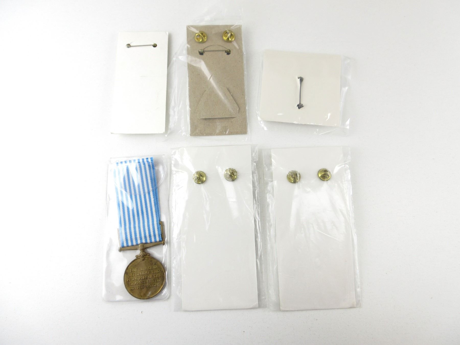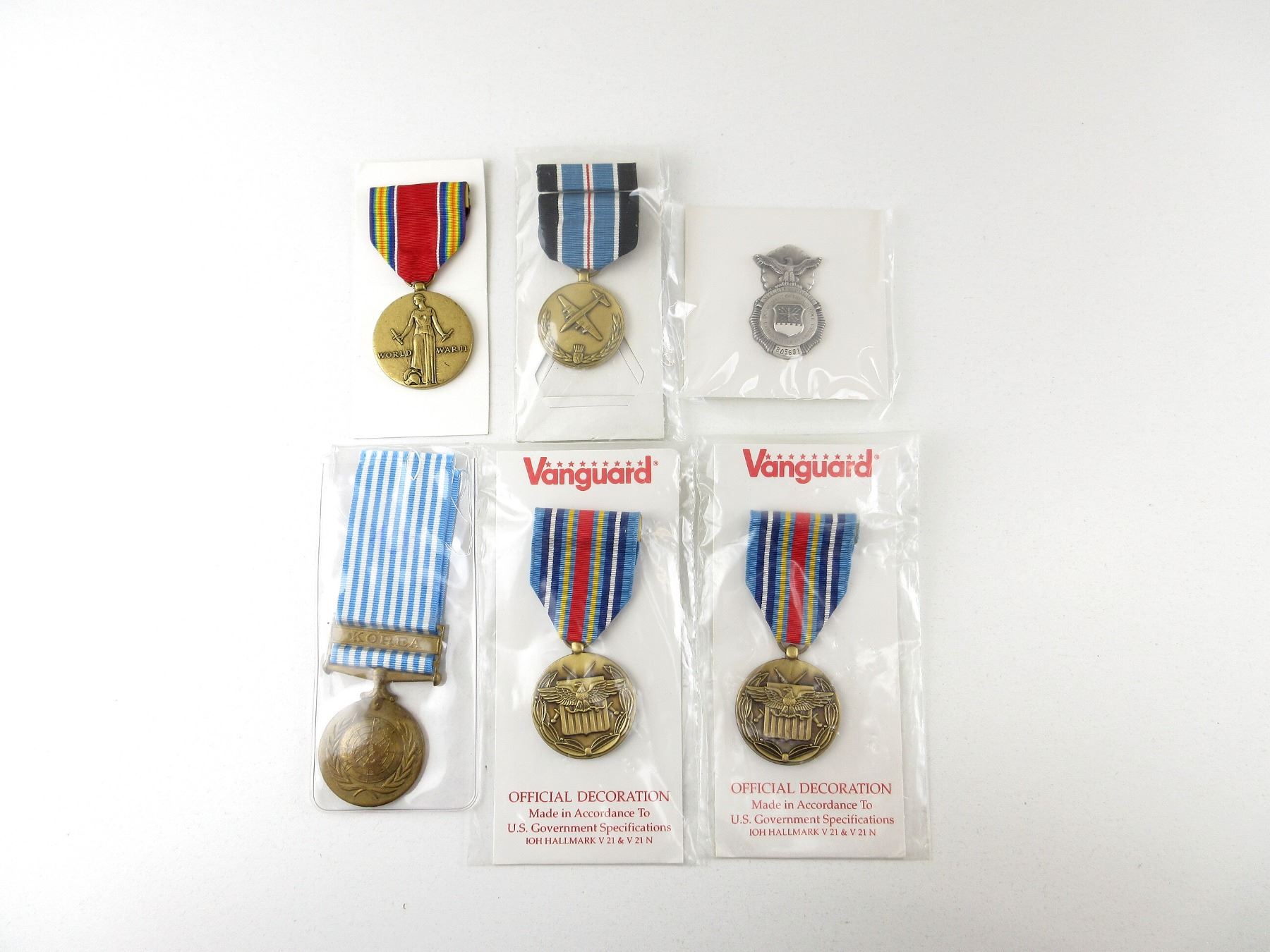 LOT INCLUDES; (2) UN-NAMED GLOBAL WAR ON TERRORISM EXPEDITIONARY MEDAL WITH RIBBONS, APPEARS NOS, (1) UN-NAMED MEDAL FOR HUMANE ACTION WITH RIBBON, RIBBON BAR & ORIGINAL PACKAGING, APPEARS NOS, (1) UN-NAMED THE WORLD WAR II VICTORY MEDAL WITH RIBBON, (1) AIR FORCE SECURITY POLICE BADGE IN ORIGINAL PACKAGING, APPEARS NOS & (1) UN-NAMED UNITED NATIONS SERVICE MEDAL KOREA WITH RIBBON. SEE PHOTOS.