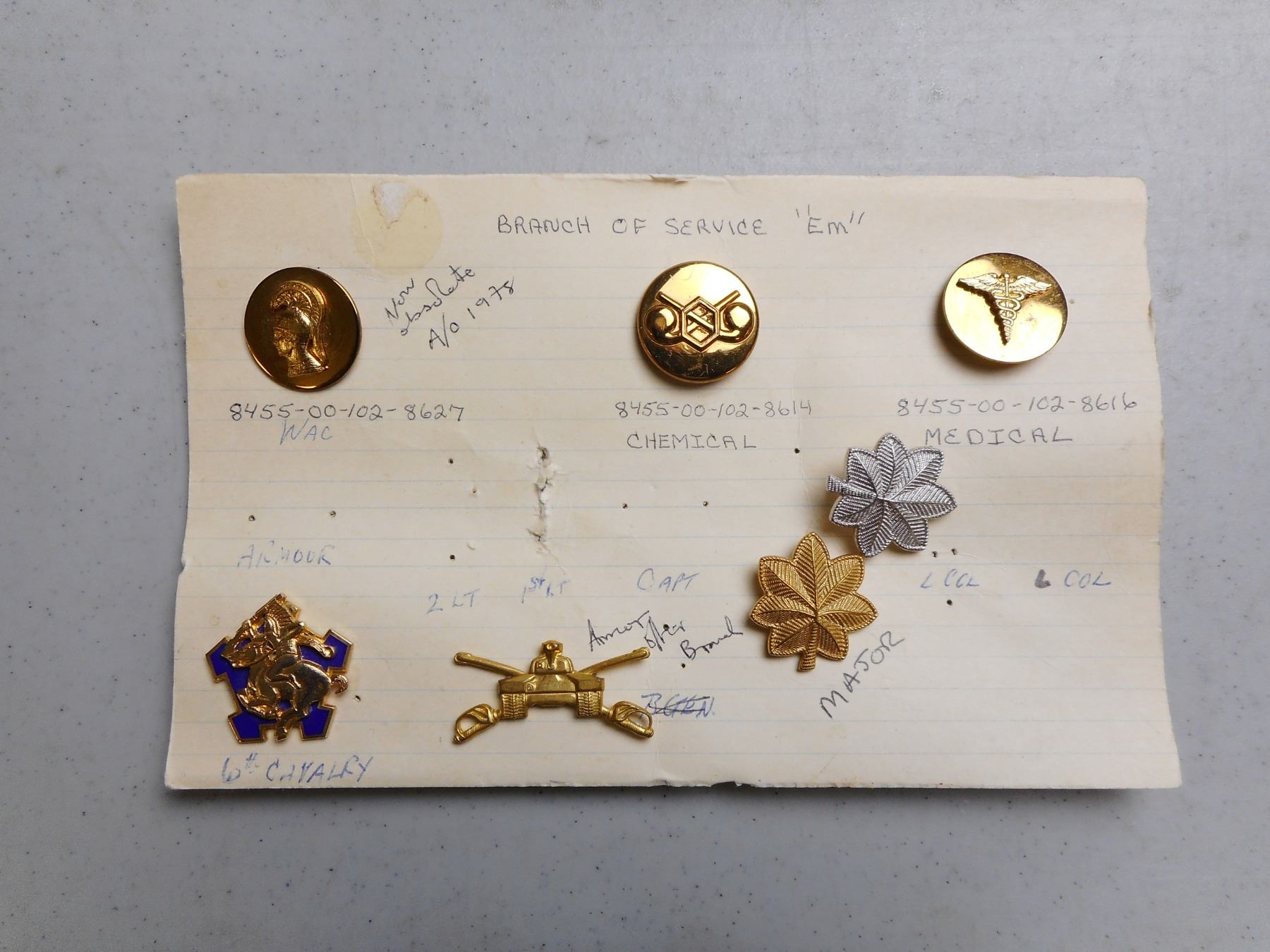 ASSORTED U.S. MILITARY/SERVICE PINS , INCLUDES GOLD & SILVER OAK LEAF PINS AND ASSORTED SERVICE / TRADE PINS, LOT OF 7