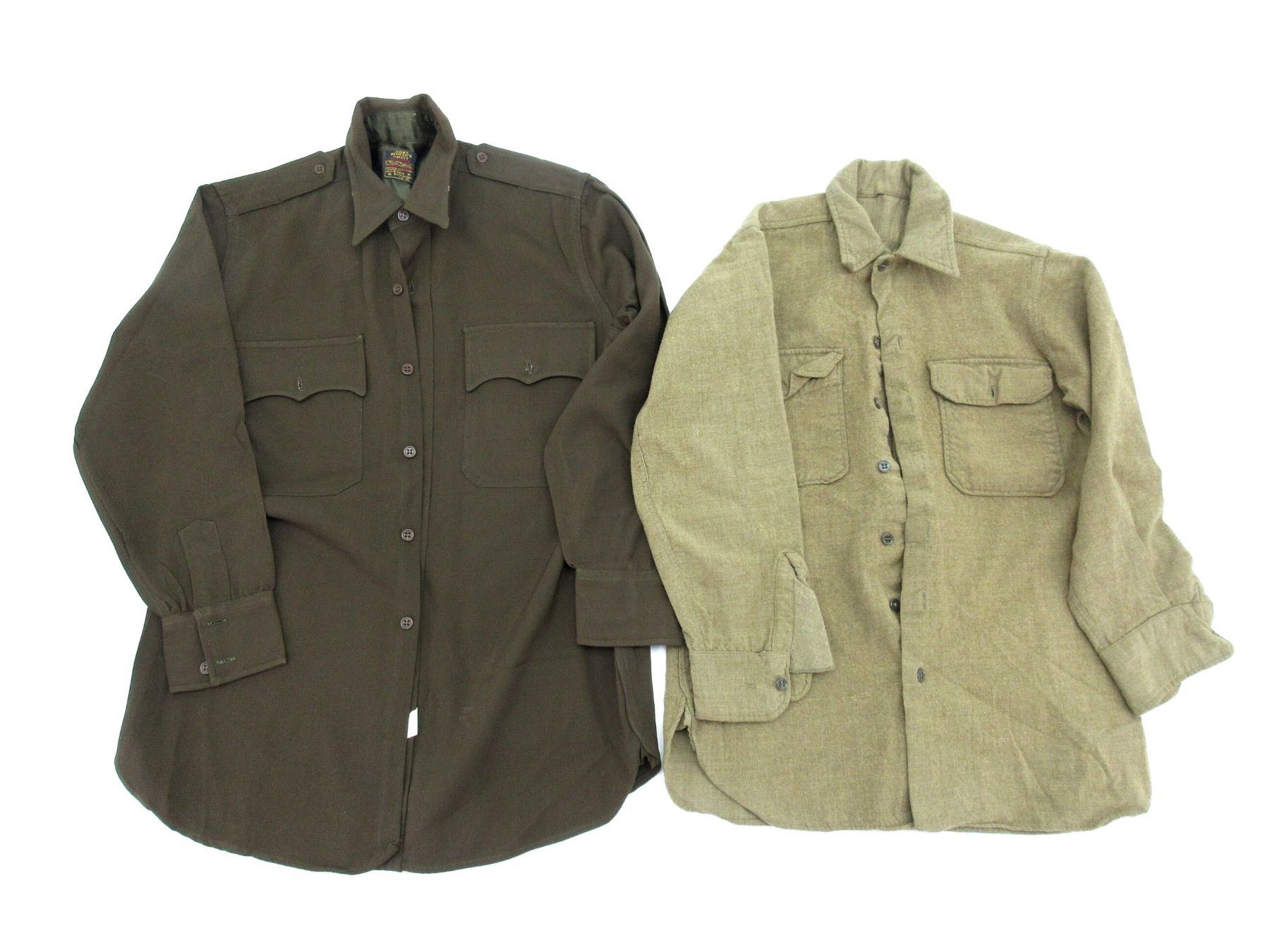 LOT INCLUDES; (1) WWII PAIR OF BROWN WOOL PANTS, MARKED: "PHILA. QM DEPOT, PATTERN DATE 12/20/45" ETC. & VARIOUS INK STAMP MARKINGS, SIZE W31 X L31, FLY-FRONT, (2) WOOL LONG-SLEEVED SHIRTS, ONE MARKED: "14 1/2-32", NO VISIBLE MARKINGS ON OTHER, FLY-FRONT, SHOWS SOME WEAR, SHOULDER WIDTH APPROX. 14.5" TO 15", (1) BROWN WOOL LONG-SLEEVED SHIRT, MARKED: "ARMY OFFICER'S SHIRT, 100% WOOL, FORM FITTED, LONDON SHRUNK, TAILORED BY JACKSON RAYMOND CO. INC." & VARIOUS OTHER INK STAMP MARKINGS, FLY-FRONT, SHOULDER WIDTH APPROX. 16", (1) TAN CANVAS LONG-SLEEVED SHIRT, VARIOUS INK STAMP MARKINGS, FLY-FRONT, SHOULDER WIDTH APPROX. 16" & (1) REPRODUCTION PARACHUTE JUMPER COAT, SIZE 38R, VARIOUS MARKINGS ON LABEL, ZIPPERED-FRONT (WORKS), WAIST BELT. SEE PHOTOS.