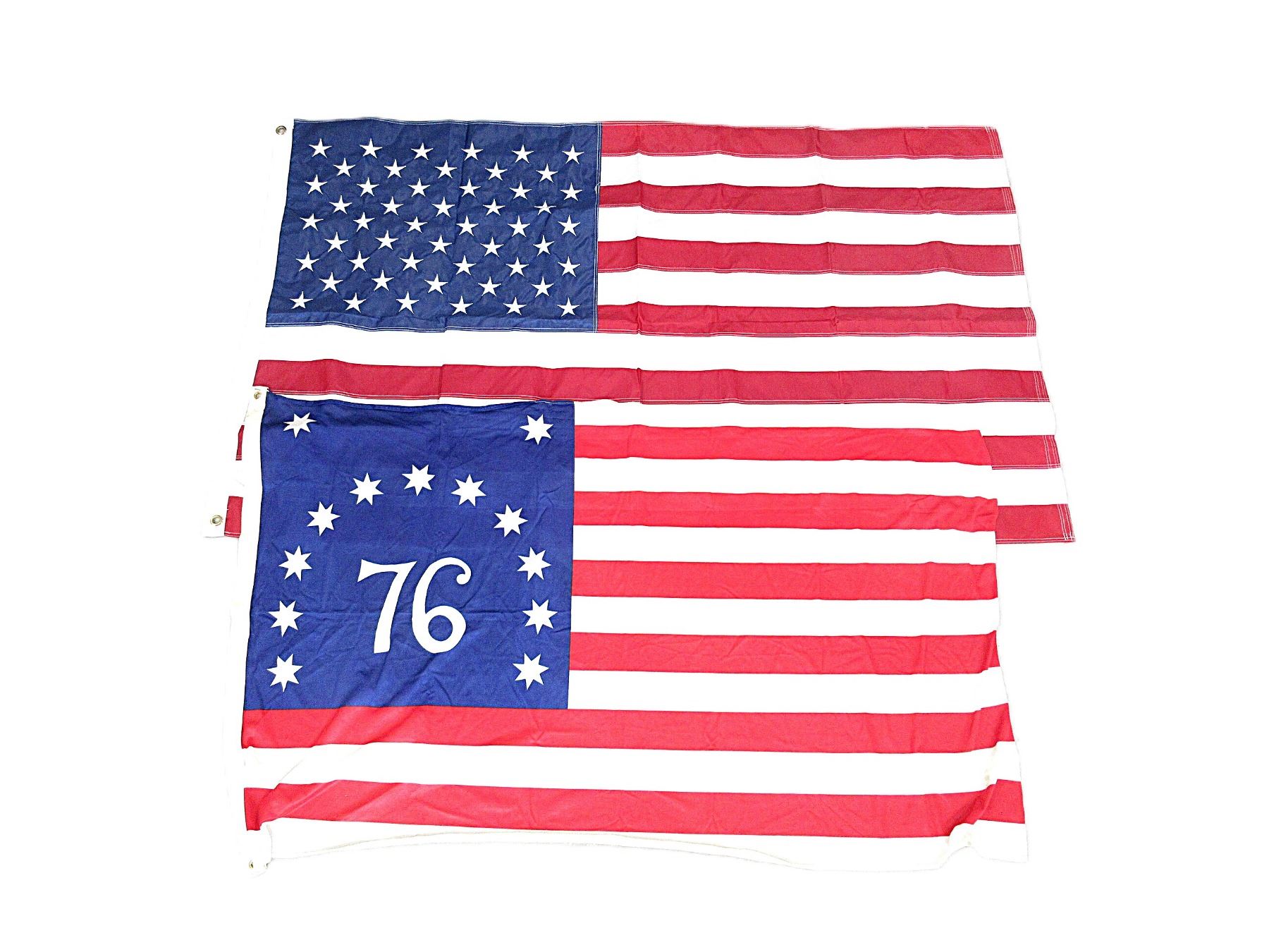 LOT INCLUDES; (1) RED / WHITE / BLUE SILK-LIKE FABRIC BENNINGTON FLAG, 13 STARS & "76" IN THE BLUE PANEL, NO VISIBLE MARKINGS, TWO BRASS GROMMETS, SHOWS WEAR, APPROX. 59" X 33.25" & (1) RED / WHITE / BLUE NYLON 50-STAR NATIONAL FLAG, EACH STRIPE INDIVIDUALLY SEWN TOGETHER & ATTACHED TO BLUE PANEL, EACH STAR INDIVIDUALLY EMBROIDERED TO BLUE PANEL, TWO BRASS GROMMETS, APPROX. 58.5" X 34 5/8". SEE PHOTOS.