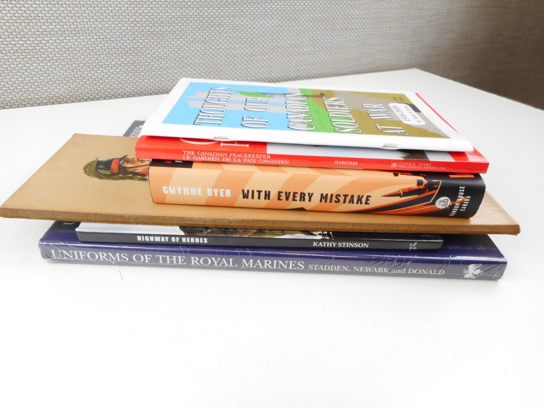 ASSORTED WAR TIME BOOKS , (1) UNIFORMS OF THE ROYAL MARINES, NEW IN WRAPPING (1) HIGHWAY OF HEROES (1) WITH EVERY MISTAKE, GWYNNE DYER (1) THE CANADIAN PEACEKEEPER (1) THOUGHTS OF OUR CANADIAN SOLDIERS AT WAR. (1) PAINTING OF AMERICAN DRAGOON, APPROX. DIMENSIONS 13.75" X 5.25". LOT OF 6