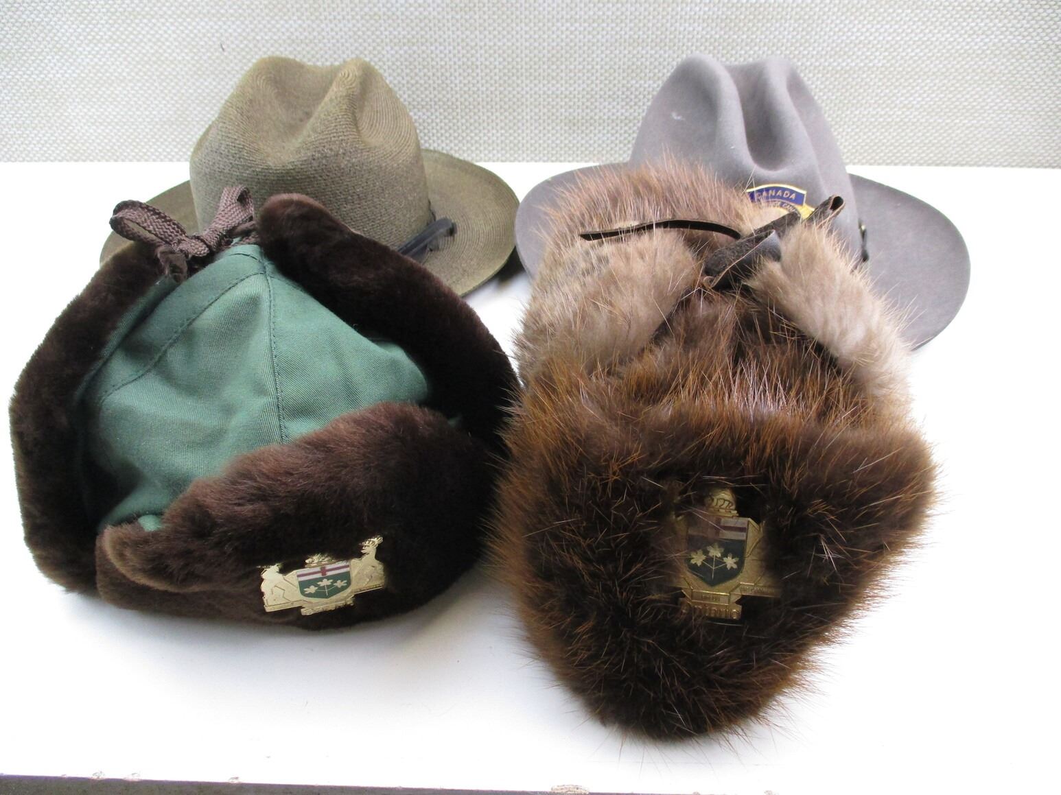 ASSORTED WILDLIFE SERVICE HATS , (1) WIDE BRIM CANADIAN WILDLIFE SERVICE HAT. CAP BADGE MARKED CANADA CANADIAN WILDLIFE SERVICE CANADIEN DE LA FAUNE GAME OFFICER GARDE-CHASSE. INSIDE MARKED MADE IN CANADA, GENUINE LEATHER. MANUFACTURED BY BILTMORE. C.W.S. (1) OHIO DIVISION OF WILDLIFE WIDE BRIM HAT. INSIDE MARKED MALLORY, SIZED 7 1/8. (2) MINISTRY OF NATURAL RESOURCES UNIFORM TOQUES. CAP BADGES MARKED VT INCEPIT FIDELIS SIC PERMANET ONTARIO. 1 MARKED INSIDE MUIR CAP & REGALIALTD. SCARBOROUGH (TORONTO) CANADA. SIZED 7 1/4.