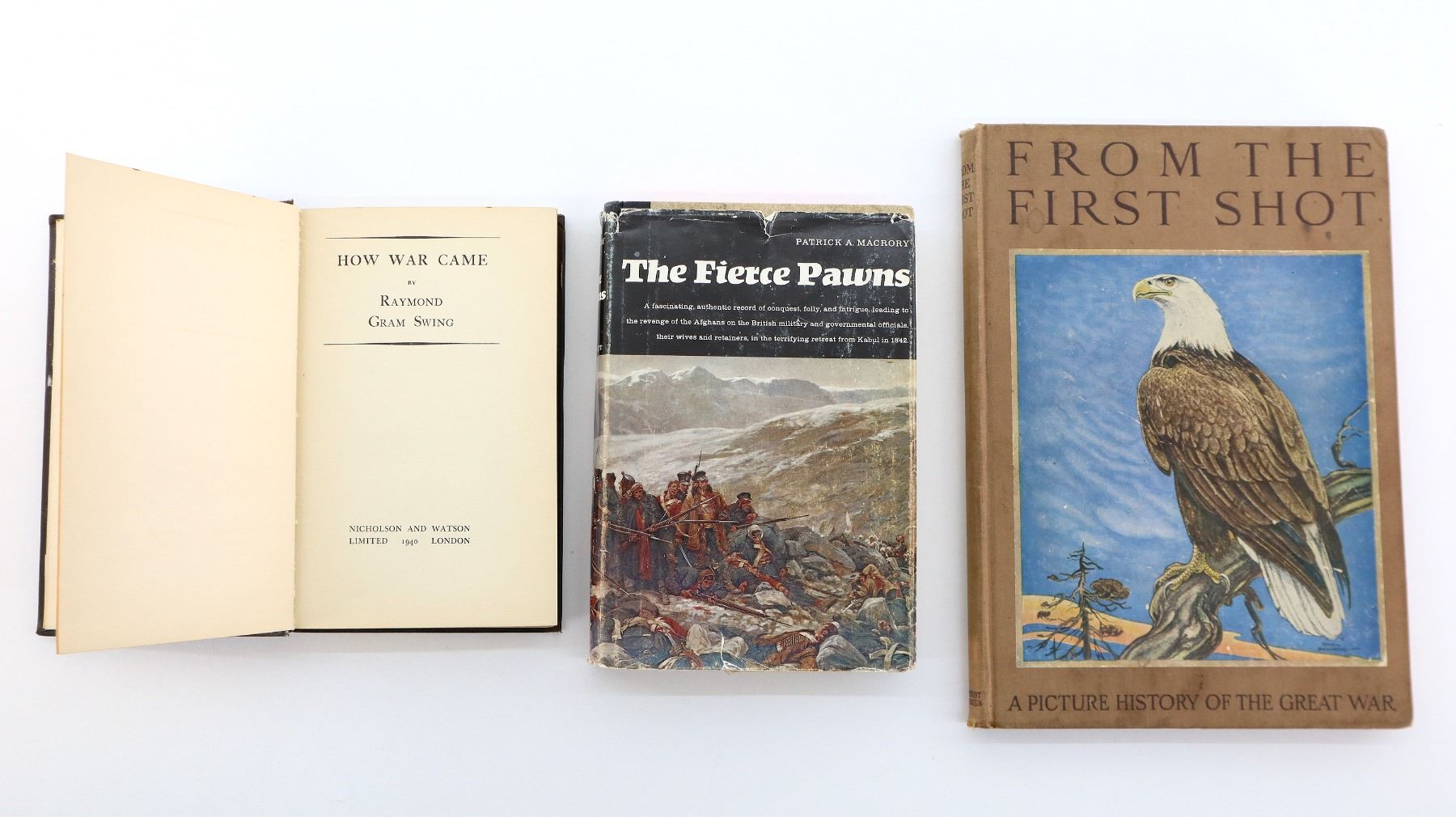 LOT INCLUDES; (1) "HOW WAR CAME" BOOK BY RAYMOND GRAM SWING, HARD COVER, 1940, (1) "THE FIERCE PAWNS" BOOK BY PATRICK A. MACRORY, HARD COVER WITH DUST COVER, COPYRIGHT 1966 & (1) "FROM THE FIRST SHOT, A PICTURE HISTORY OF THE GREAT WAR" BOOK BY INDEPENDENT CORPORATION, HARD COVER, 1918. SEE PHOTOS.
