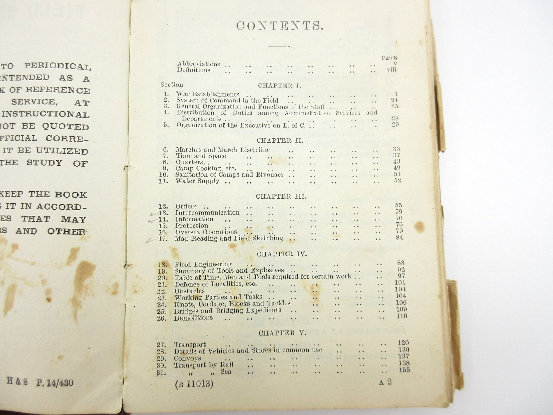 LOT INCLUDES; (1) "THE SOLDIER'S GUIDE", SOFT COVER, UK, LONDON, (1) "FIELD SERVICE REGULATIONS, PART II, ORGANIZATION AND ADMINISTRATION 1909(1914)", SOFT COVER, REPRINTED 1916, (1) "FIELD SERVICE POCKET BOOK 1914" SOFT COVER, 1916, & (1) "MILITARY ENGINEERING PART V." HARD COVER, 1914. SEE PHOTOS.