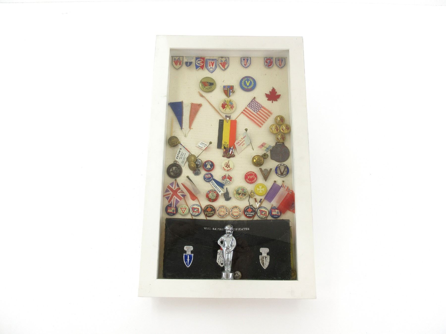 APPROX. (67) PIECES, VARIOUS COLOURS / MATERIALS, FRAMED UNDER GLASS, INCLUDES; 1918 VICTORY LOAN PIN, 1917 I HAVE BOUGHT MY VICTORY BONDS PIN, BRITISH FLAG, FRENCH FLAG, WAR FINANCE WORKER PIN, I OWN A 1919 THRIFT STAMP PIN, VIVE LA FRANCE TORONTO 1916 FLAG PIN, ETC., SHADOW BOX APPROX. 18 5/8" X 11 1/8" X 2 1/8". SEE PHOTOS. *NO GUARANTEE ON GLASS FOR SHIPPING*