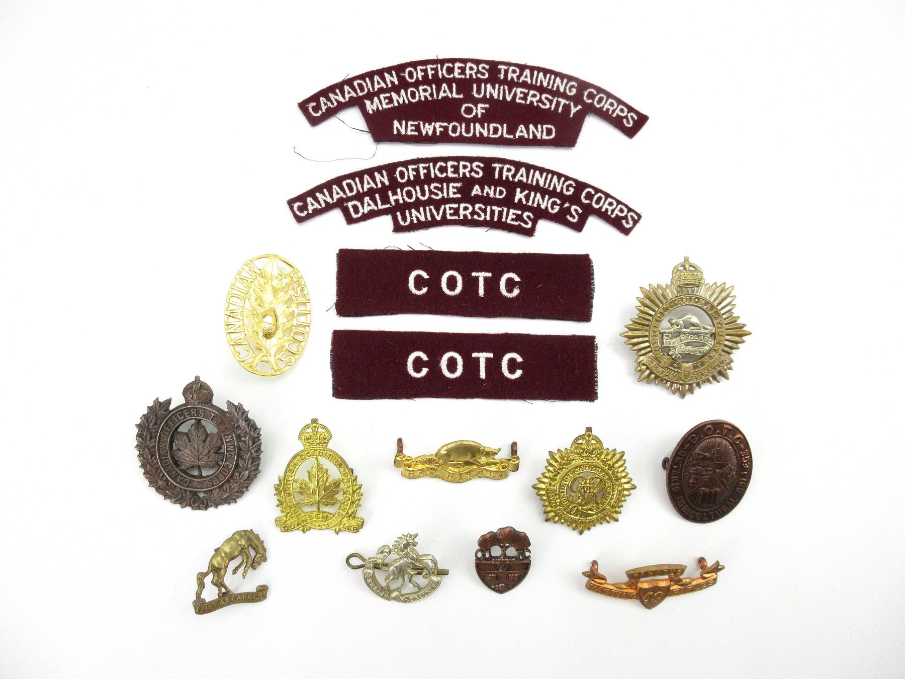 APPROX. (15) CAP BADGES, COLLAR BADGES & CLOTH BADGES, KING'S CROWNS, INCLUDES; THE BRITISH COLUMBIA DRAGOONS, THE MIDLAND REGIMENT, HASTINGS 49TH RIFLES, GOVERNOR GENERAL'S HORSE GUARDS REGIMENT, CANADIAN OFFICERS', CANADIAN OFFICER'S TRAINING CORPS, ROYAL CANADIAN REGIMENT, ETC. SEE PHOTOS.