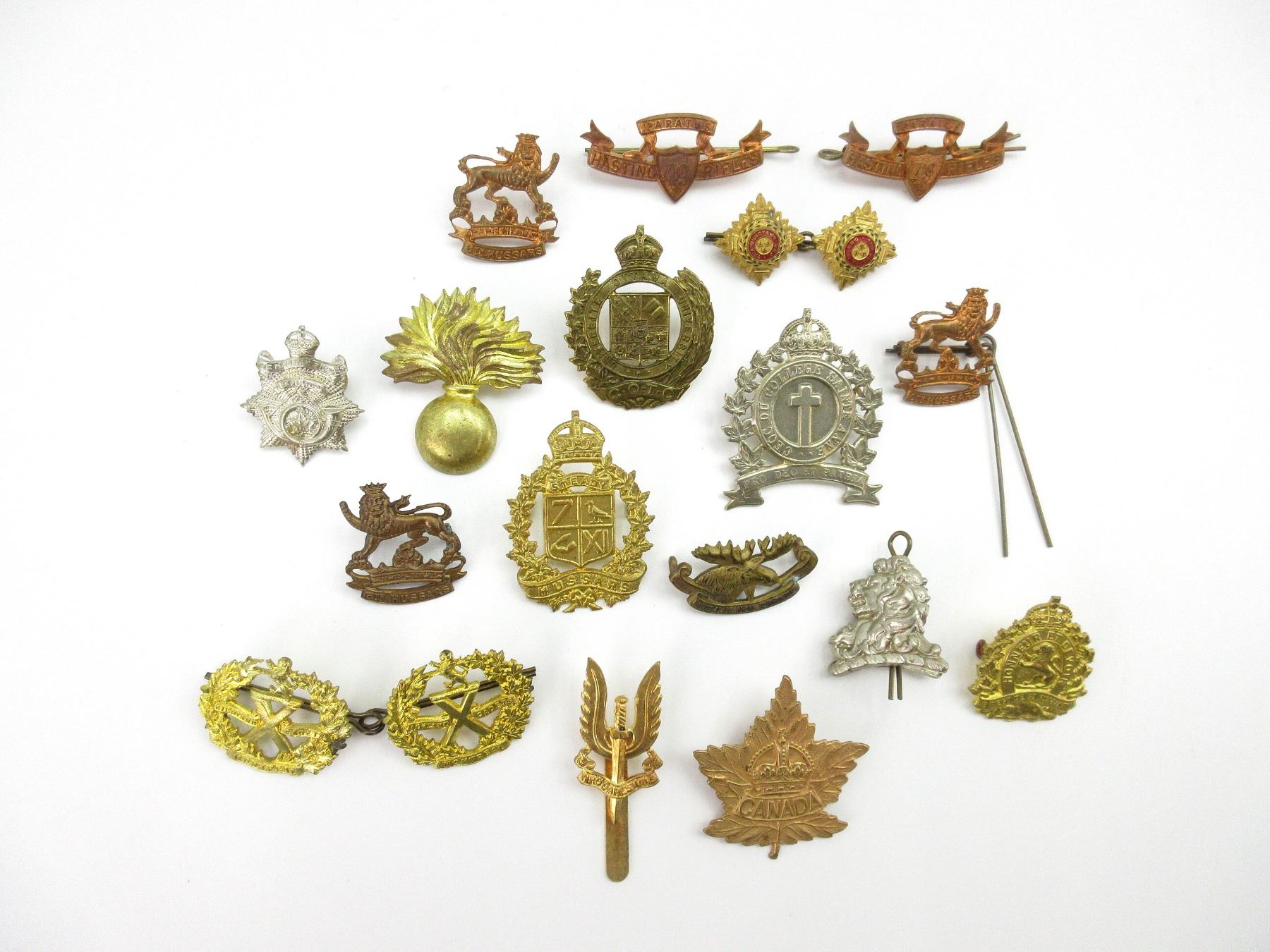 APPROX. (20) CAP BADGES & COLLAR BADGES, KING'S CROWNS, INCLUDES; HASTINGS 49TH RIFLES, HIGHLAND CADETS MONTREAL, 7TH / 11TH HUSSARS, LE REGIMENT DE ST. HYACINTHE, 6TH HUSSARS, THE HALIFAX RIFLES, ETC., MAY CONTAIN OTHER COUNTRIES. SEE PHOTOS.