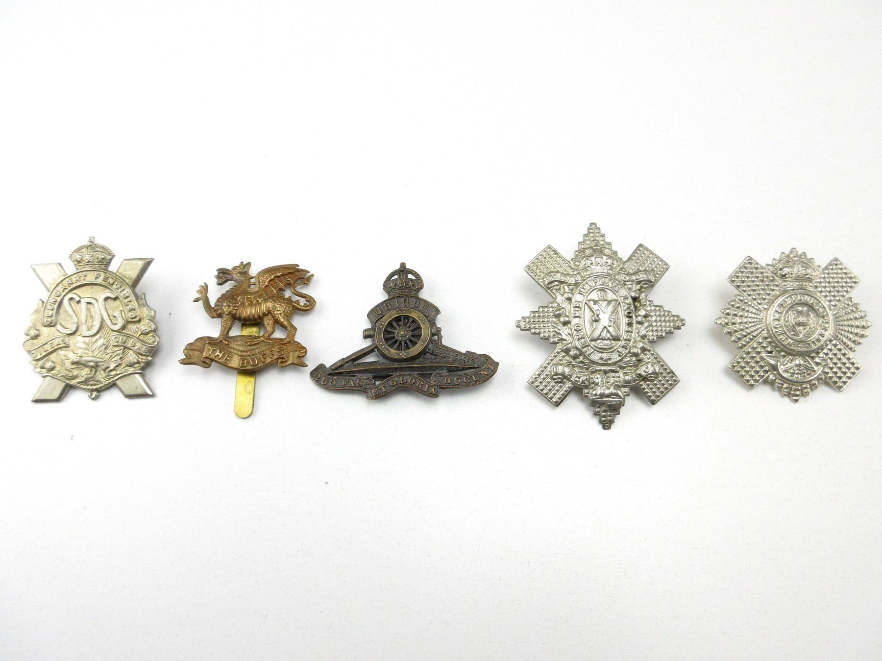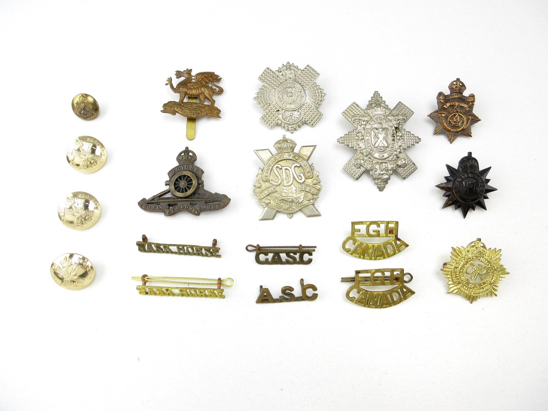 APPROX. (18) PIECES, CAP BADGES, BUTTONS, COLLAR BADGES, ETC., VARIOUS MATERIALS, KING'S CROWNS, INCLUDES; THE HALIFAX RIFLES, THE ROYAL HIGHLANDERS BLACK WATCH, THE BUFFS, ROYAL CANADIAN ARMY SERVICE CORPS, ROYAL REGIMENT OF CANADIAN ARTILLERY, ETC. SEE PHOTOS.