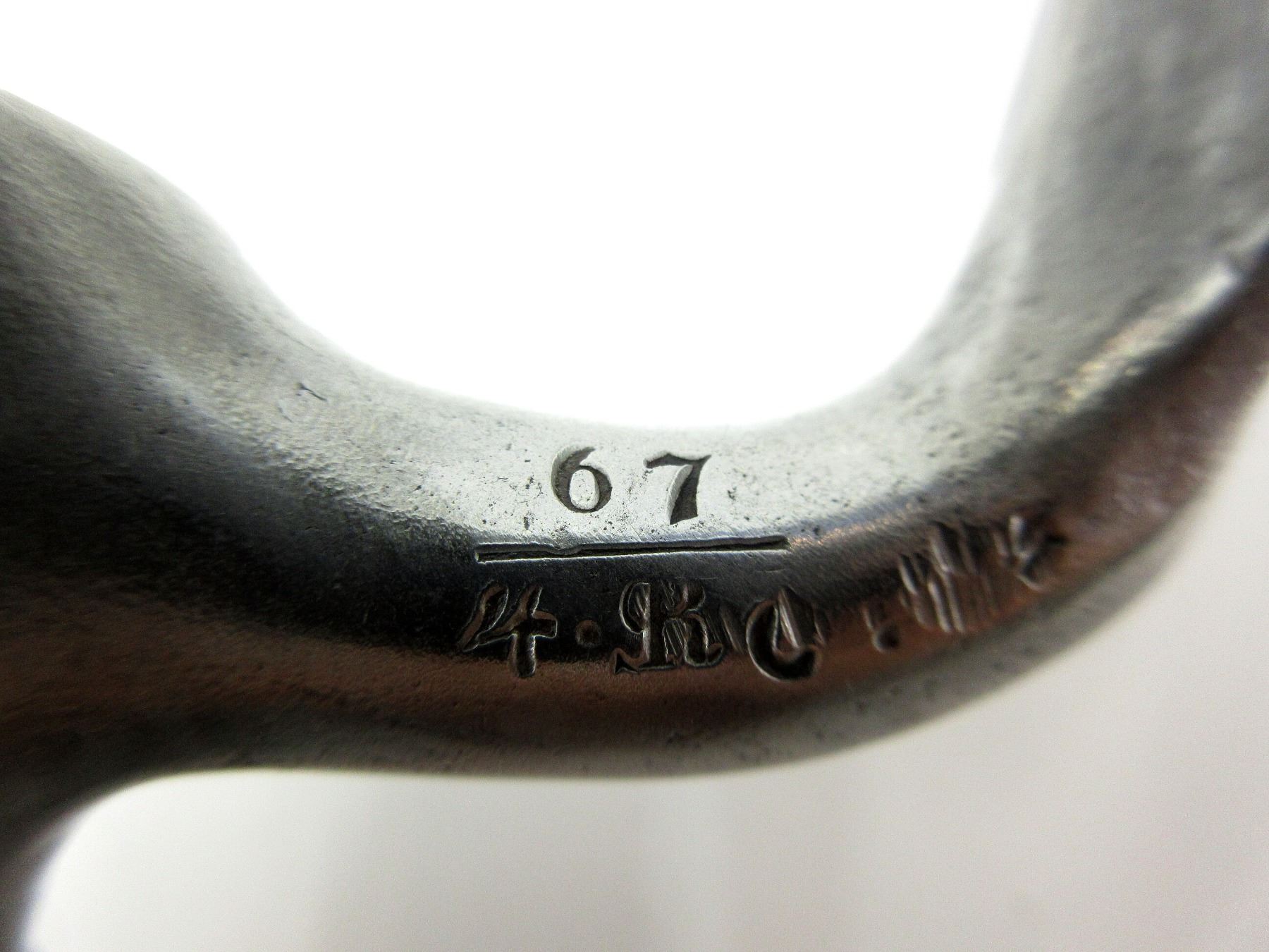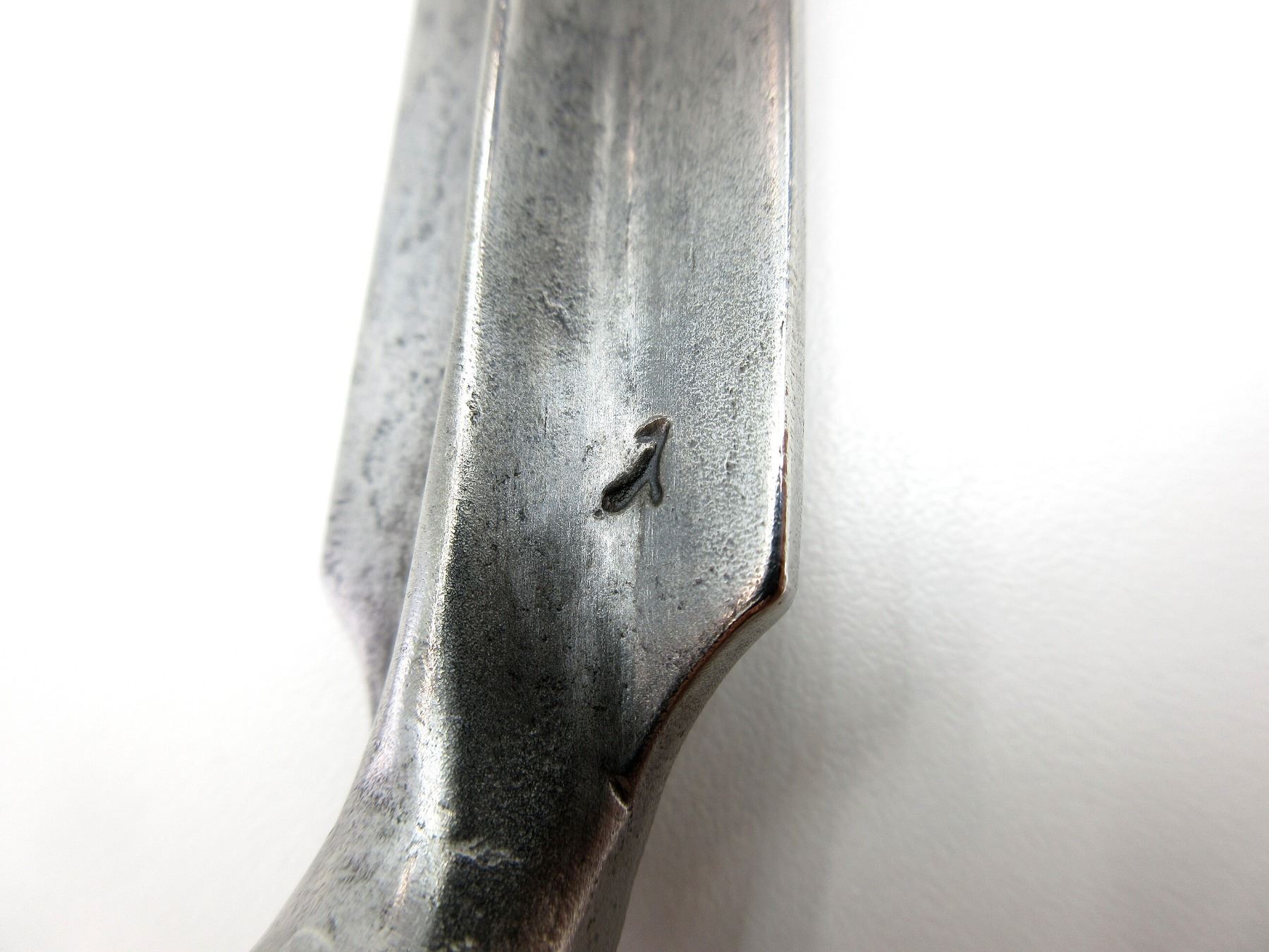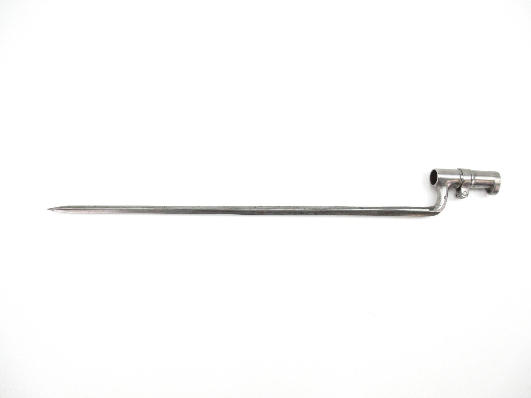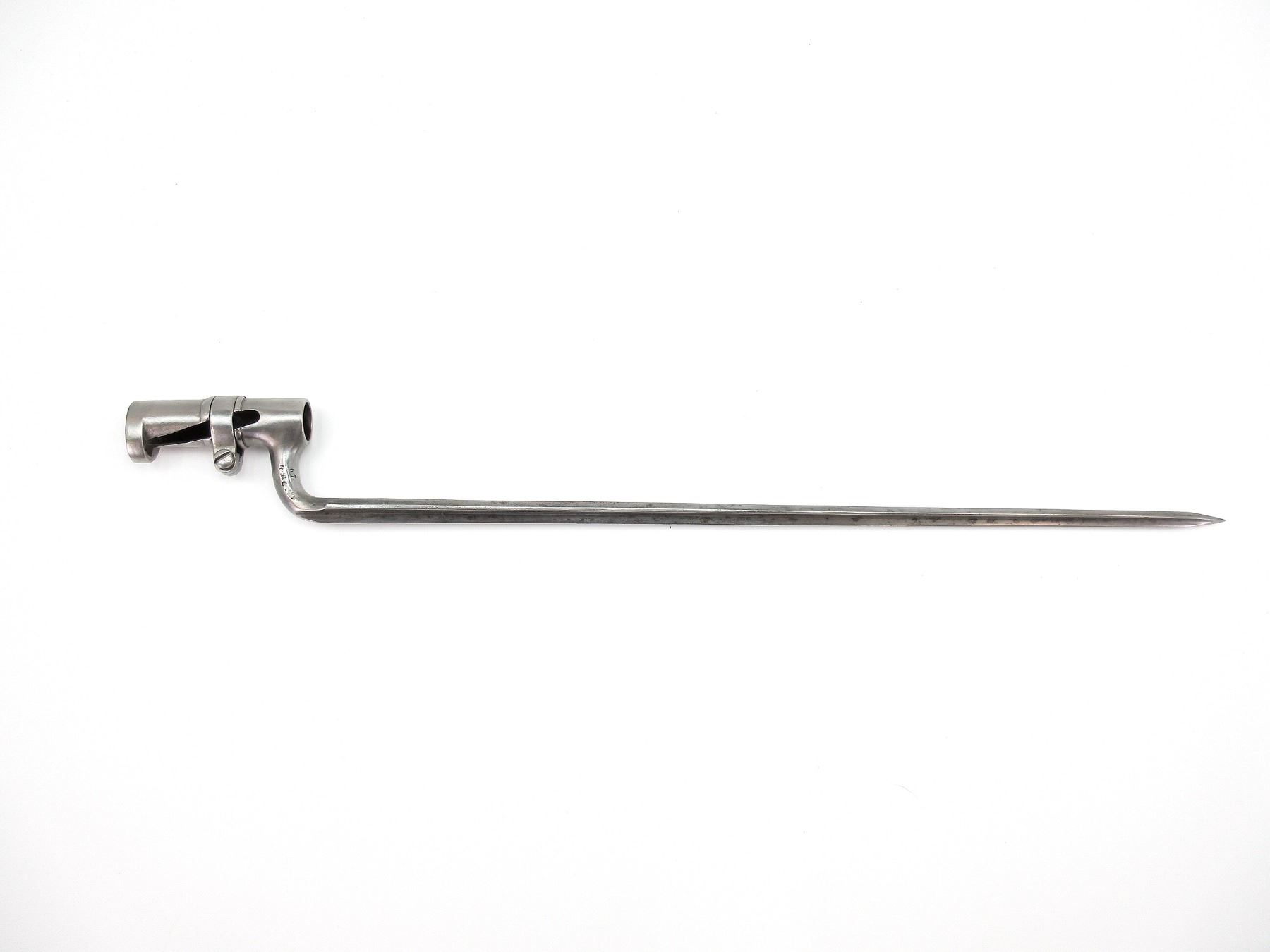 (1) ALSO USED IN THE U.S. CIVIL WAR, FITS M1854 LORENZ & M1854/67 WANZL RIFLES, FLATTENED CRUCIFORM BLADE PROFILE, HELICAL MORTISE, SOCKET WITH LOCKING RING, PROOF MARK / MARKING ON BLADE, SOCKET MARKED: "67" OVER "4. R?" (PARTIALLY GROUND / WORN AWAY), OTHER-SIDE MARKED WITH A STAR & "7", END OF SOCKET MARKED: "0?", NO SCABBARD, BLADE APPROX. 18.5" & OAL APPROX. 22.25". SEE PHOTOS.