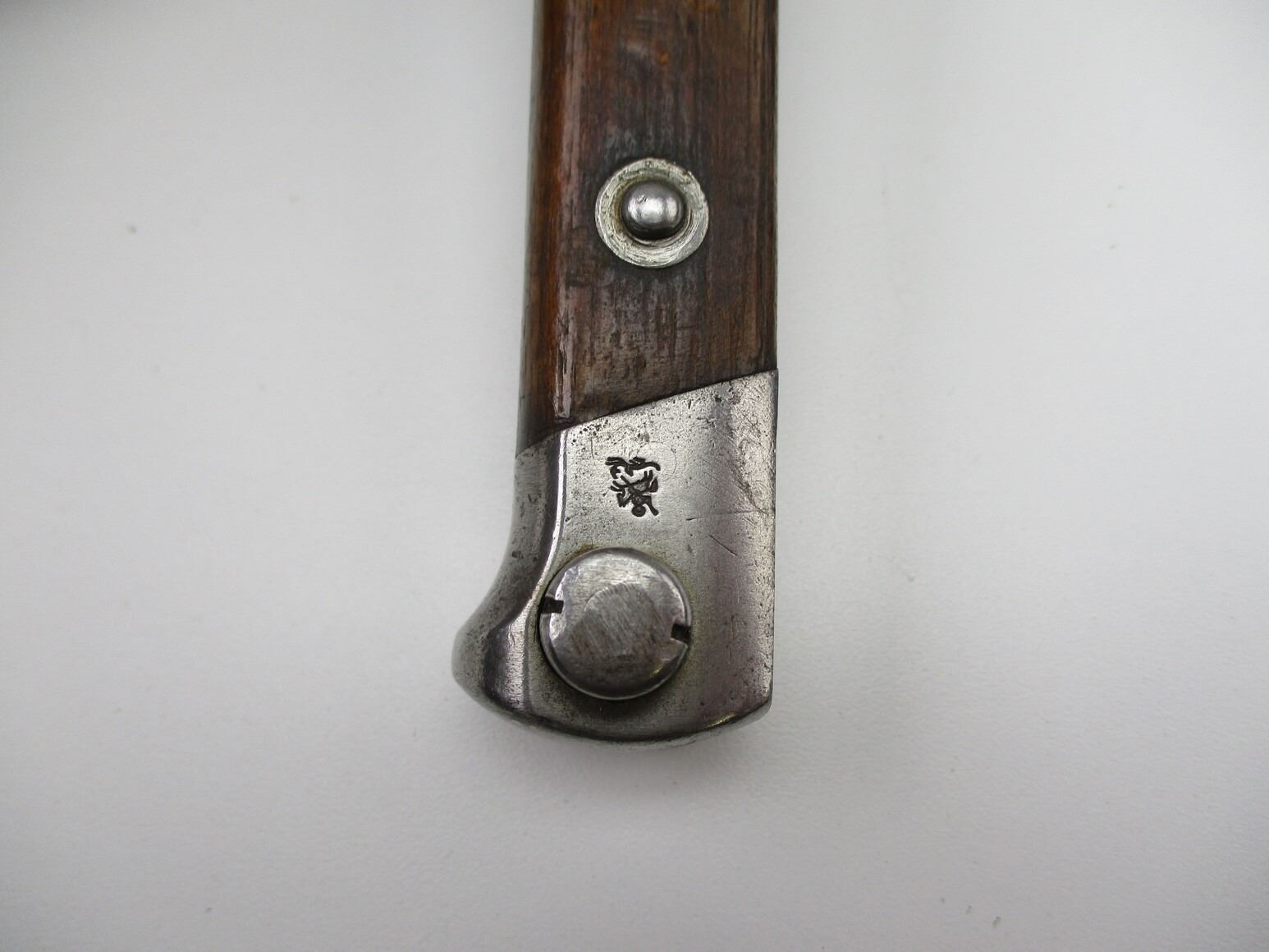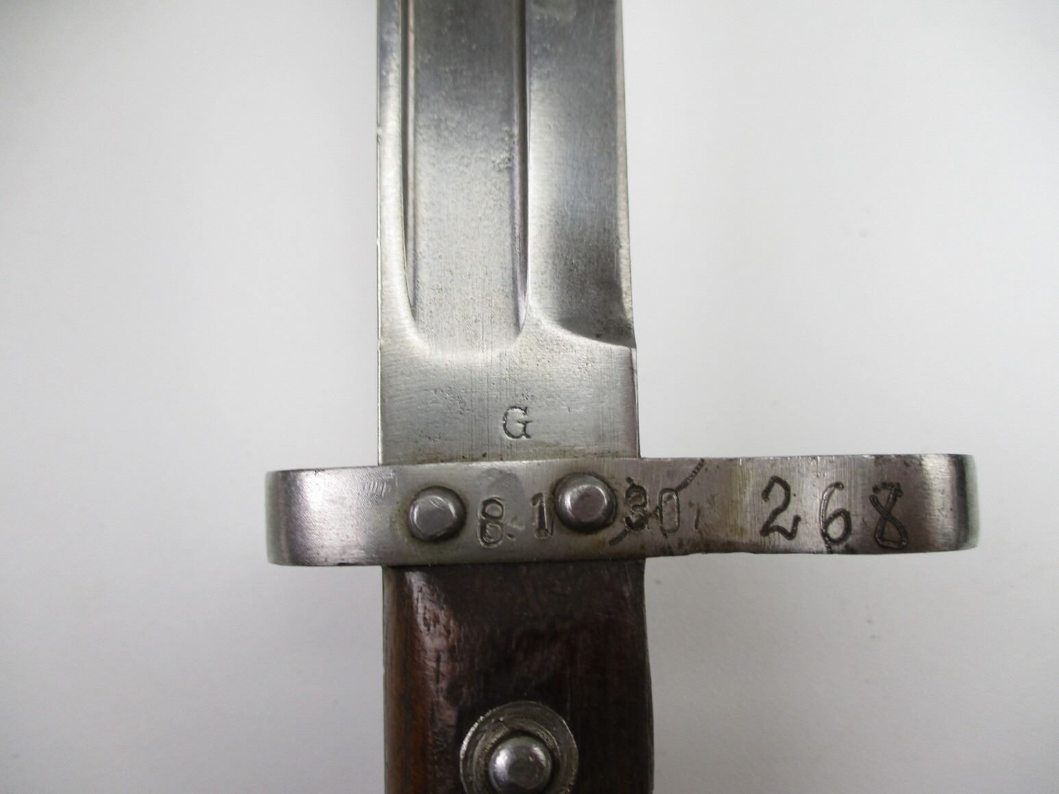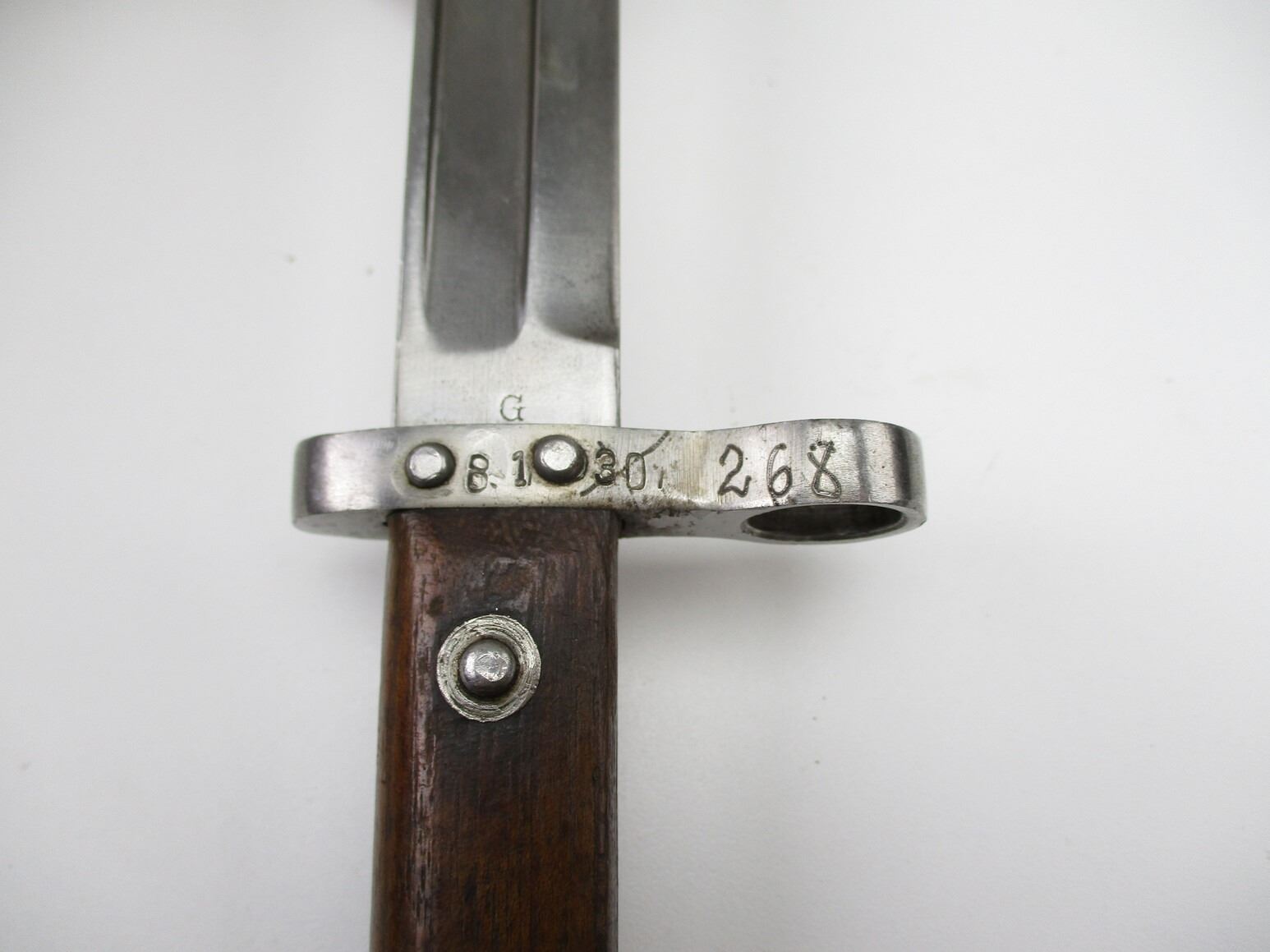 AUSTRIAN M1895 BAYONET , FITS 8MM M1895 MANNLICHER RIFLE. POMMEL HAS UNKNOWN MARK. CROSS PIECE MARKED 81 SCRATCHED OUT 30 268. RICASSO MARKED OE OVER WG, G. COMES WITH METAL SCABBARD. MARKED OE OVER WG. APPROXIMATE MEASUREMENTS: 9 3/4" BLADE, 14 1/4" OVERALL LENGTH.