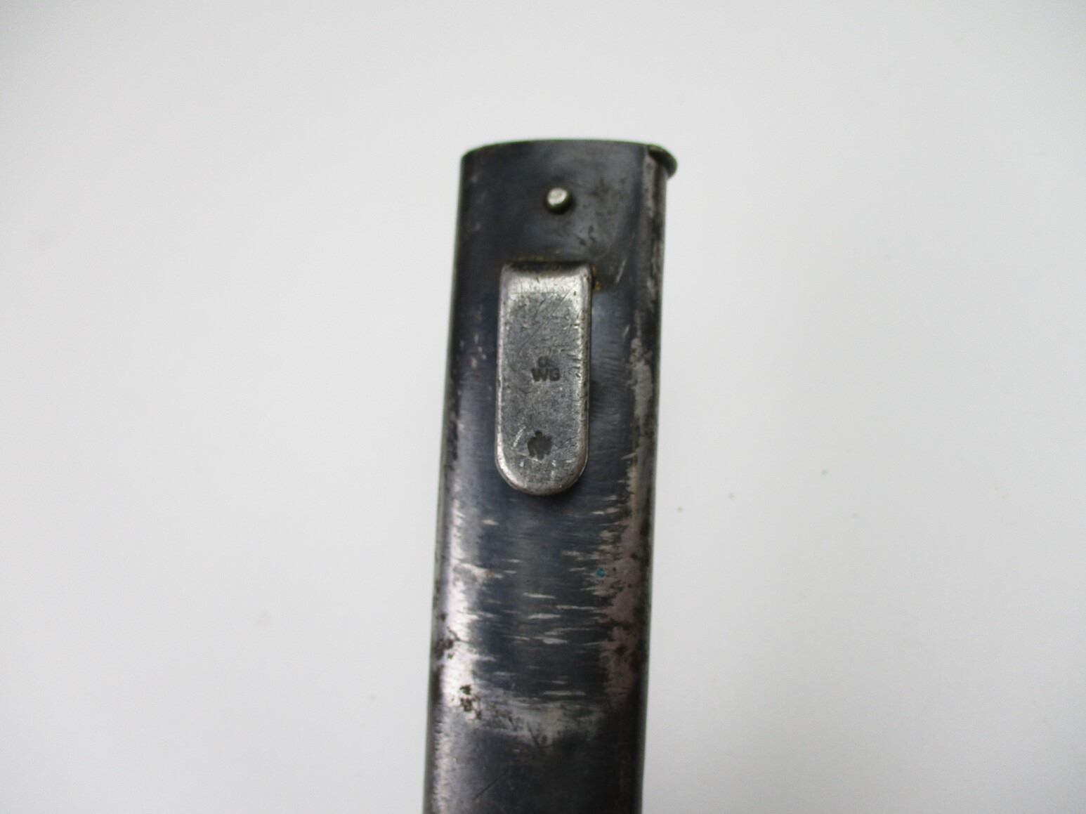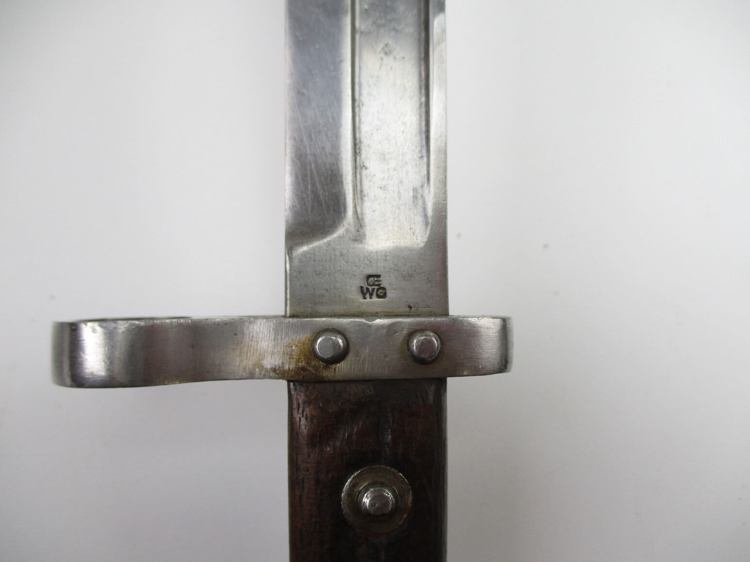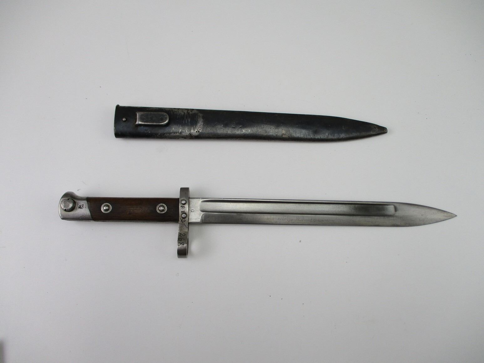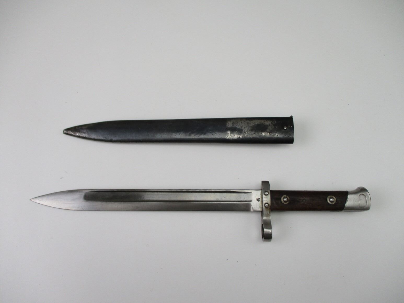 AUSTRIAN M1895 BAYONET , FITS 8MM M1895 MANNLICHER RIFLE. POMMEL HAS UNKNOWN MARK. CROSS PIECE MARKED 81 SCRATCHED OUT 30 268. RICASSO MARKED OE OVER WG, G. COMES WITH METAL SCABBARD. MARKED OE OVER WG. APPROXIMATE MEASUREMENTS: 9 3/4" BLADE, 14 1/4" OVERALL LENGTH.