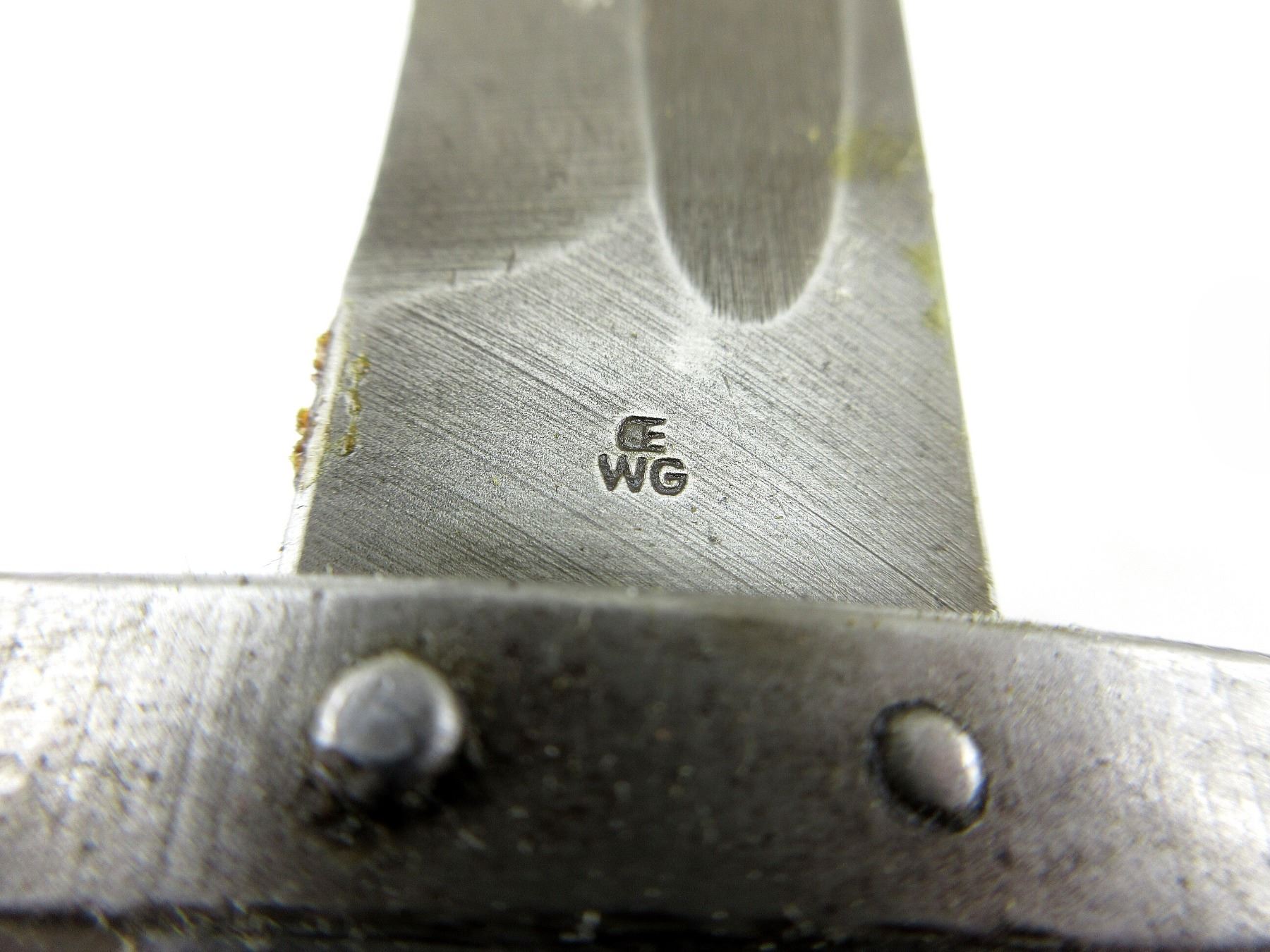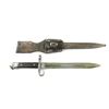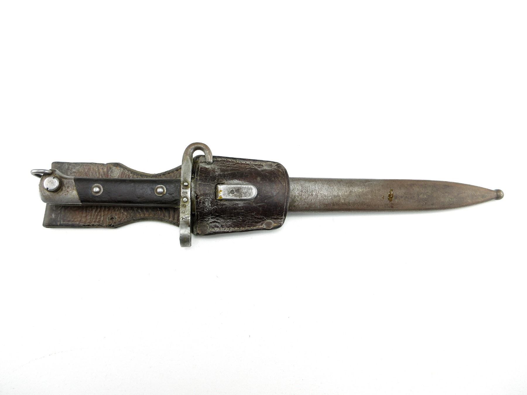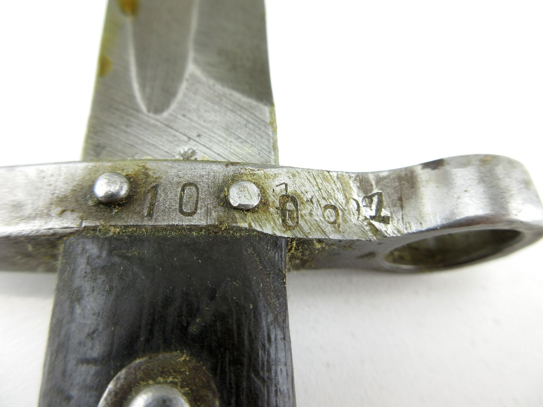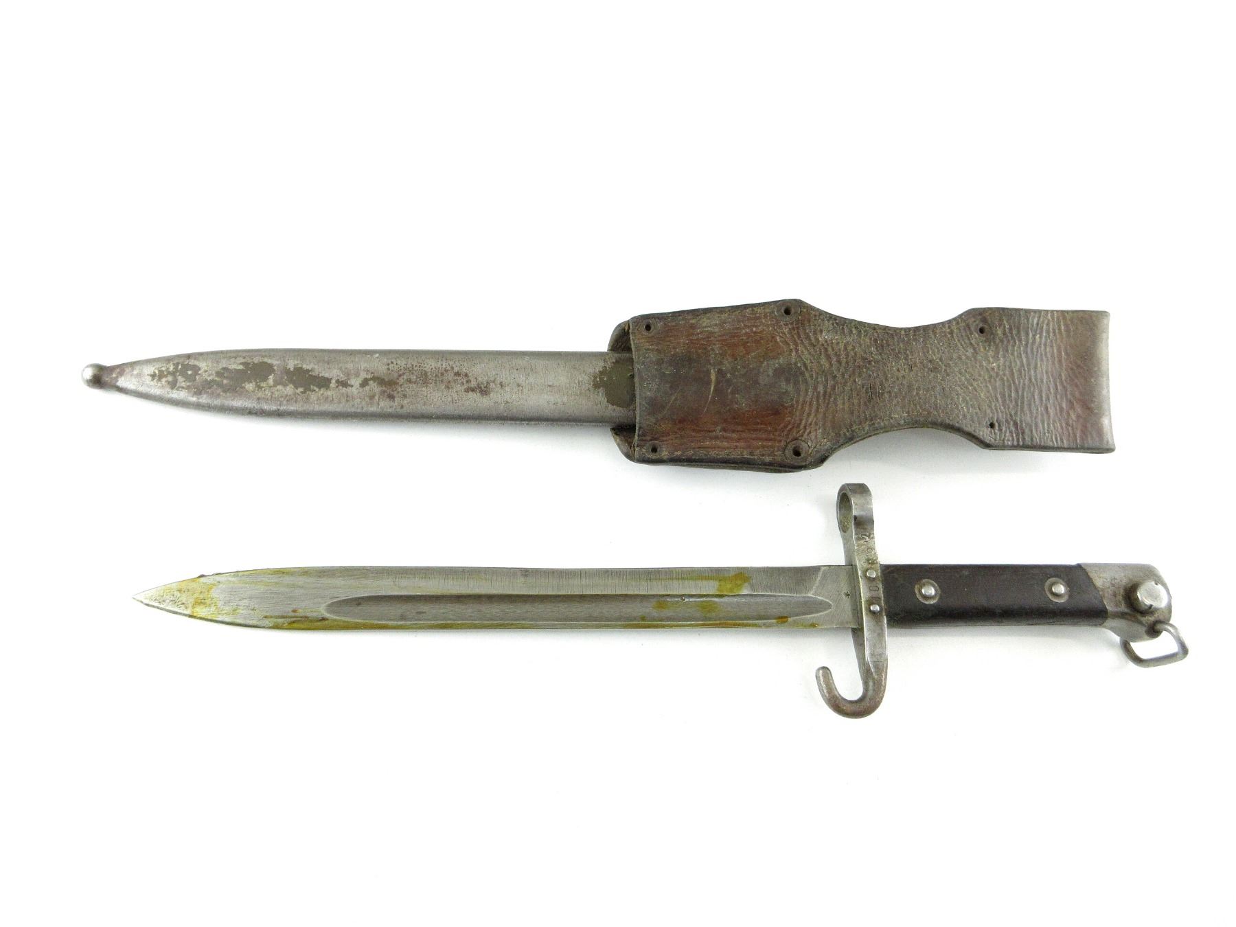 (1) FITS 8MM M1895 MANNLICHER RIFLES, RICASSO MARKED: "CE" OVER "WG", OTHER-SIDE MARKED WITH PROOF MARK, CROSS-PIECE MARKED: "10091" STAMPED OVER OTHER MARKINGS, HOOKED QUILLON, 2-PIECE WOOD GRIP, METAL POMMEL WITH SWIVEL, NO VISIBLE MARKINGS, METAL SCABBARD WITH LEATHER FROG, VARIOUS FAINT / UN-CLEAR MARKINGS ON STUD, LEATHER FROG MARKED: "1940" & VARIOUS OTHER FAINT / UN-CLEAR MARKINGS, BLADE APPROX. 9.75" & OAL APPROX. 14 1/8". SEE PHOTOS.