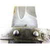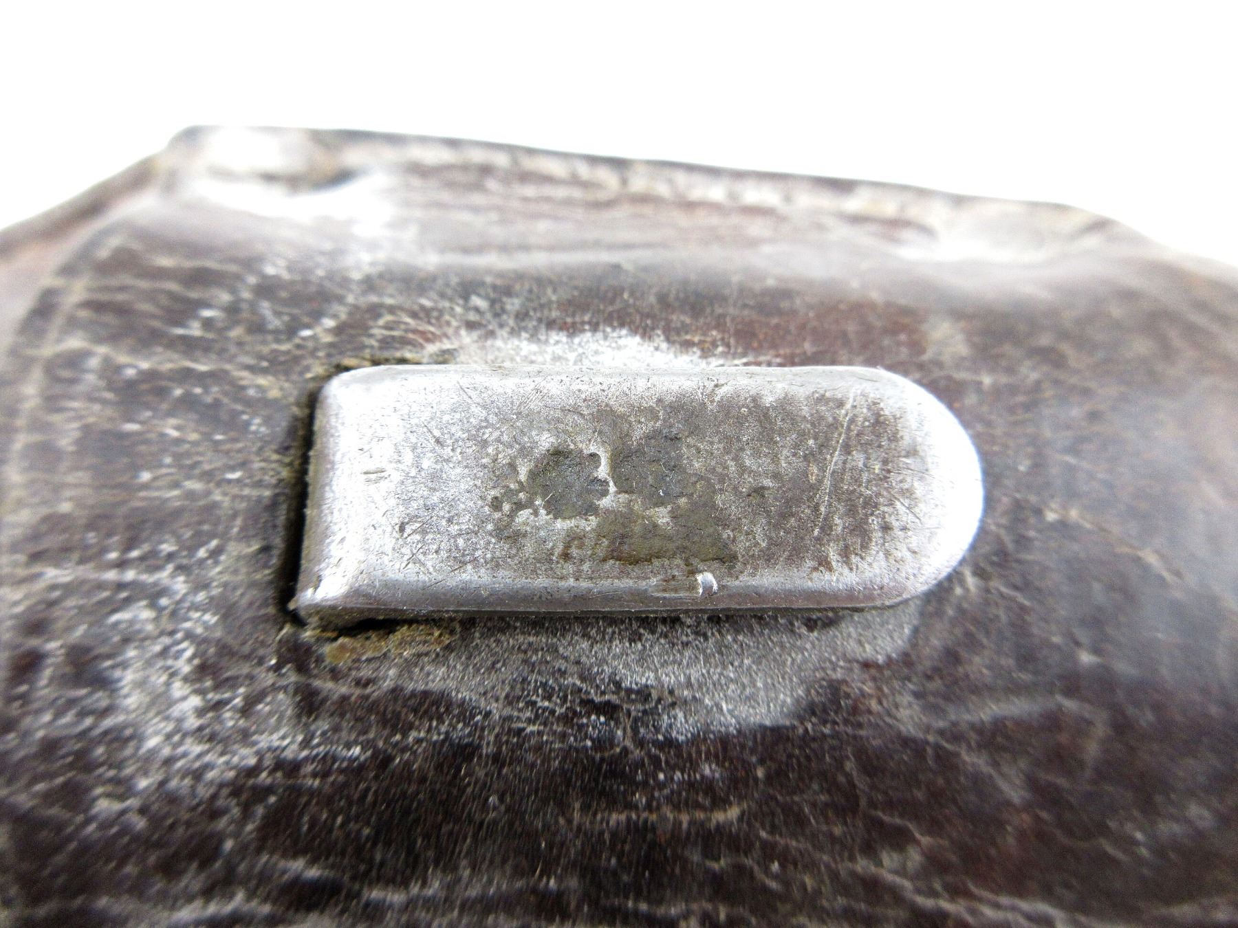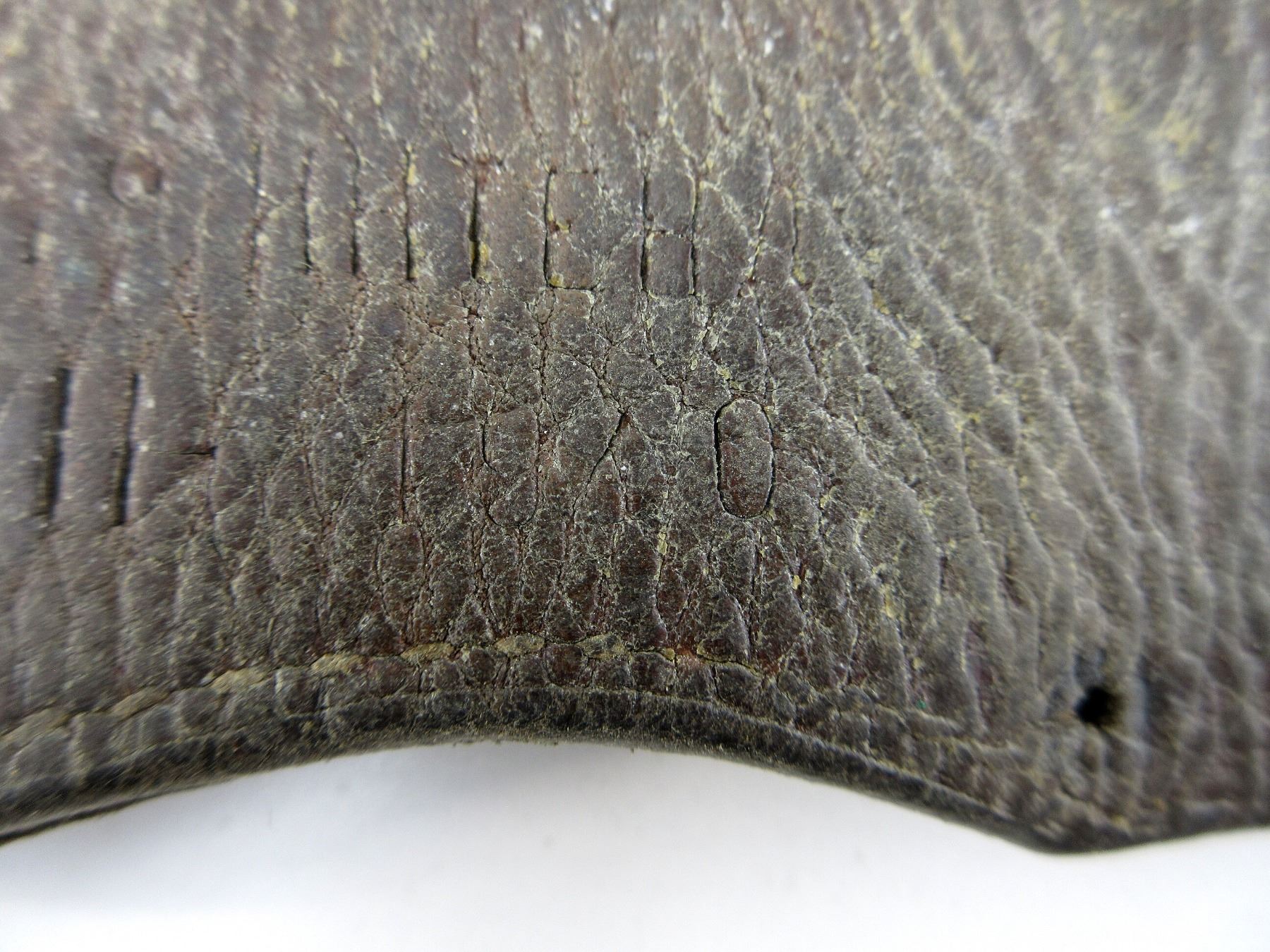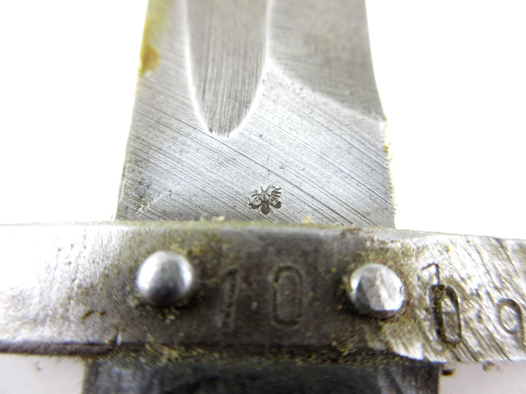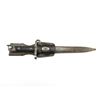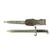(1) FITS 8MM M1895 MANNLICHER RIFLES, RICASSO MARKED: "CE" OVER "WG", OTHER-SIDE MARKED WITH PROOF MARK, CROSS-PIECE MARKED: "10091" STAMPED OVER OTHER MARKINGS, HOOKED QUILLON, 2-PIECE WOOD GRIP, METAL POMMEL WITH SWIVEL, NO VISIBLE MARKINGS, METAL SCABBARD WITH LEATHER FROG, VARIOUS FAINT / UN-CLEAR MARKINGS ON STUD, LEATHER FROG MARKED: "1940" & VARIOUS OTHER FAINT / UN-CLEAR MARKINGS, BLADE APPROX. 9.75" & OAL APPROX. 14 1/8". SEE PHOTOS.